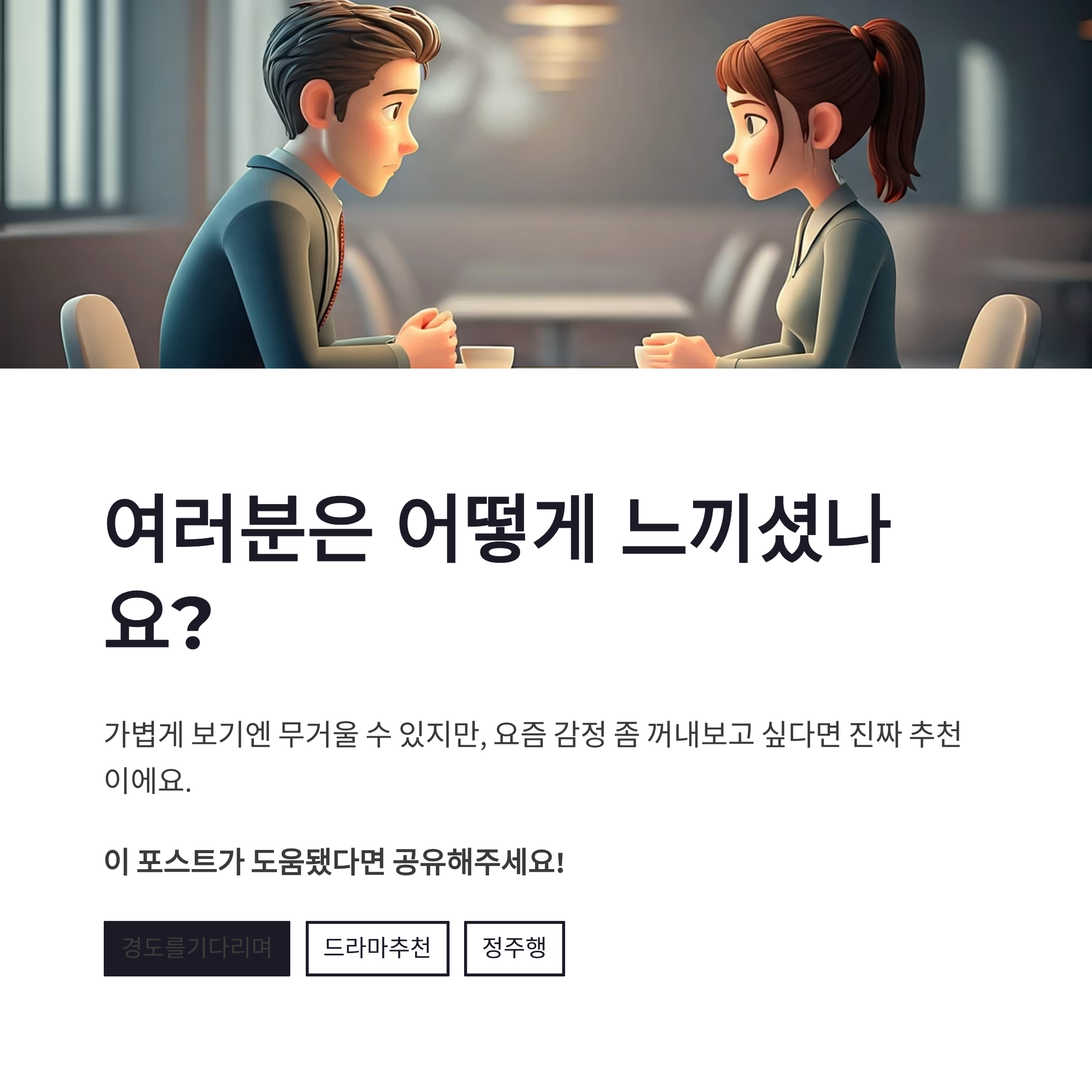 아직 못 보셨거나 다시 정주행 고민 중이신 분들 많으시죠? 경도를 기다리며 OTT는 현재 국내 주요 플랫폼에서 스트리밍 중이에요. 특히 밤에 혼자 조용히 보기 딱이라, 몰아서 보면 감정 소모 꽤 큽니다 ㅎㅎ 장점은 몰입감, 단점은… 하루 기분이 살짝 가라앉는다는 점? 그래도 후회는 없어요. 요즘처럼 자극적인 드라마 많은데, 이렇게 조용히 파고드는 작품도 필요하잖아요.