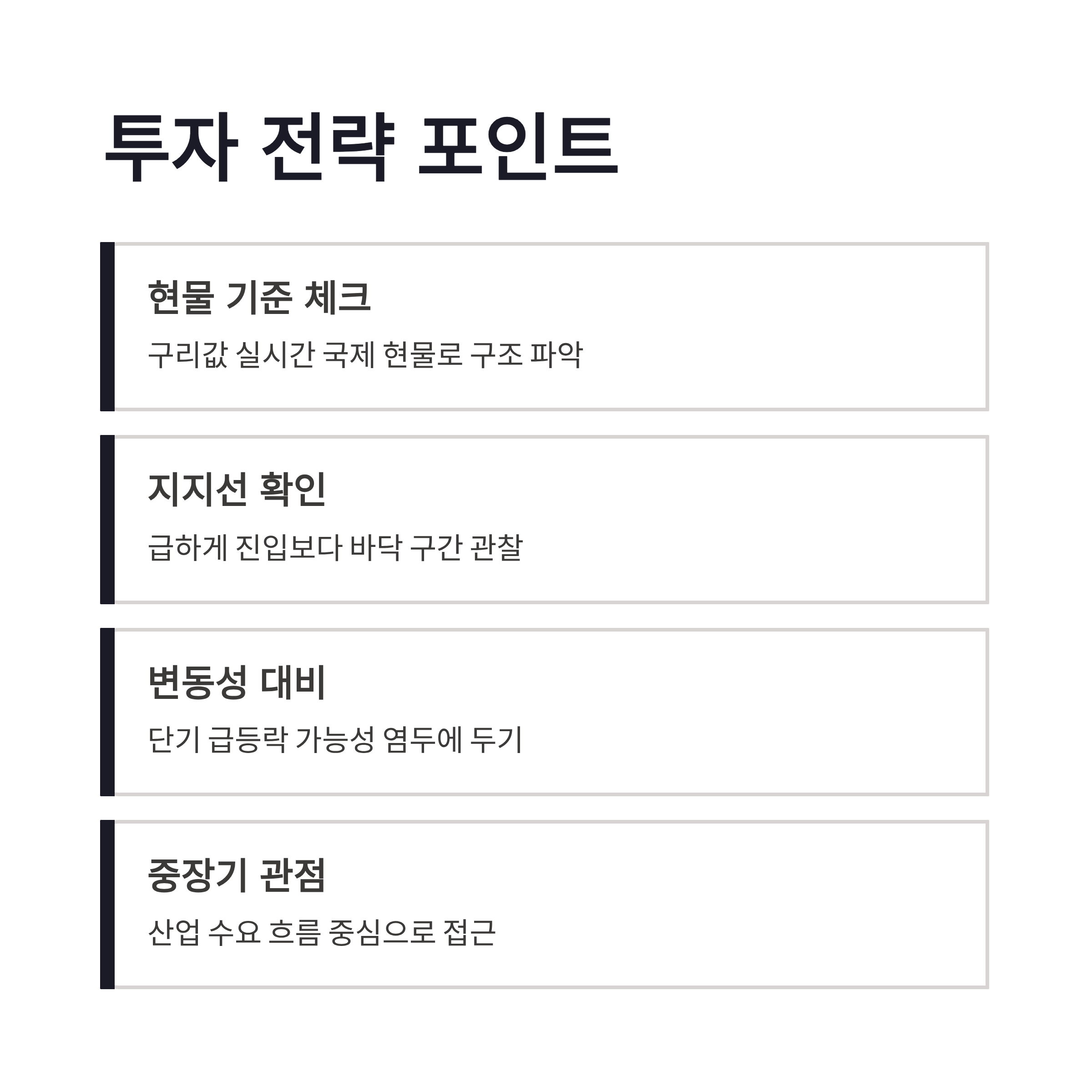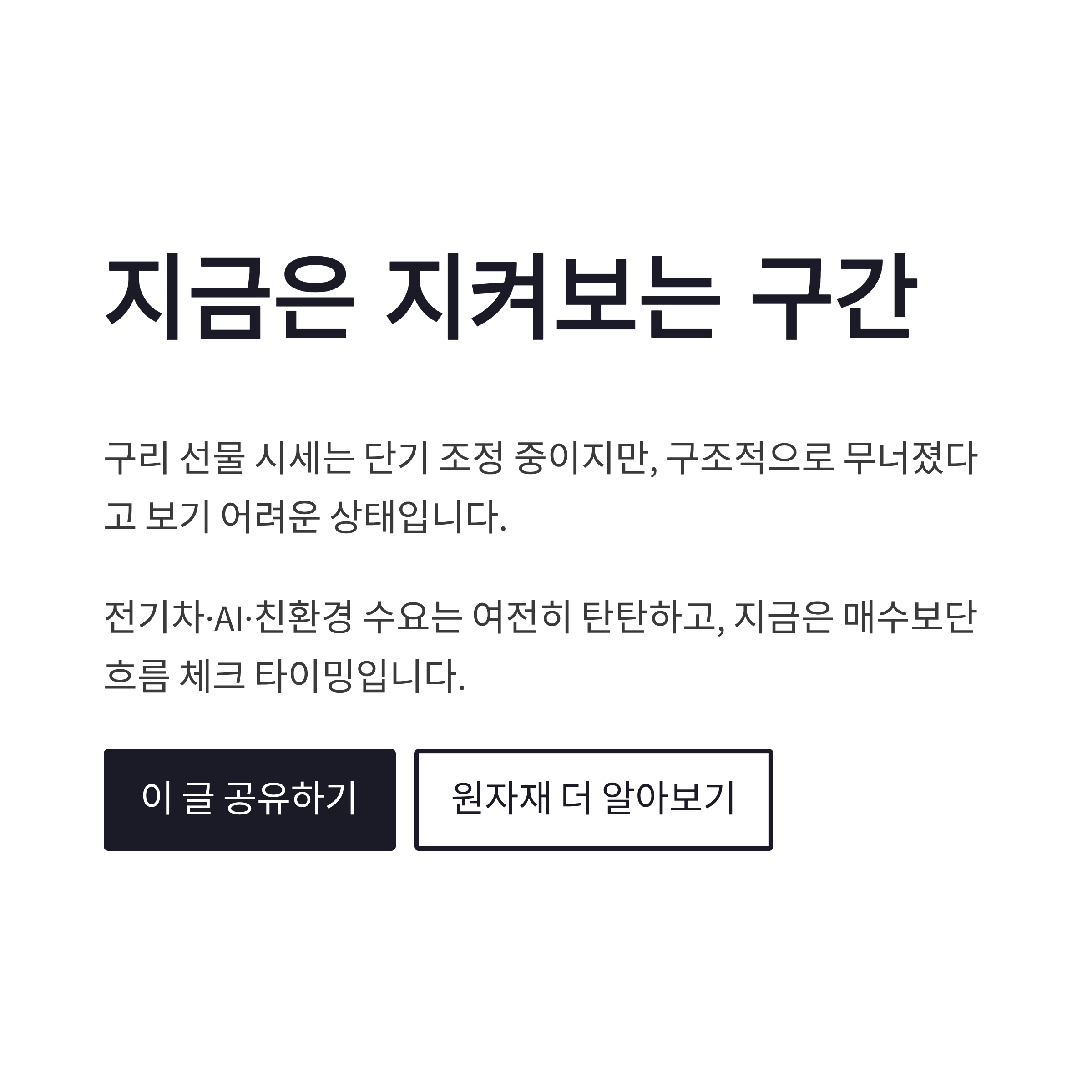 이 조정의 이유는 단순합니다. 미국 금리 인하 기대가 계속 뒤로 밀리고 있고, 중국 제조업 지표가 예상보다 약했고, 여기에 단기 급등에 따른 차익 실현까지 한꺼번에 나왔다는 점. 이 세 가지가 겹치면서 구리 선물 시세가 잠깐 숨 고르기에 들어간 흐름으로 보이더라구요. 그렇다고 구조가 완전히 꺾였다고 보긴 아직 이른 구간 같았습니다.