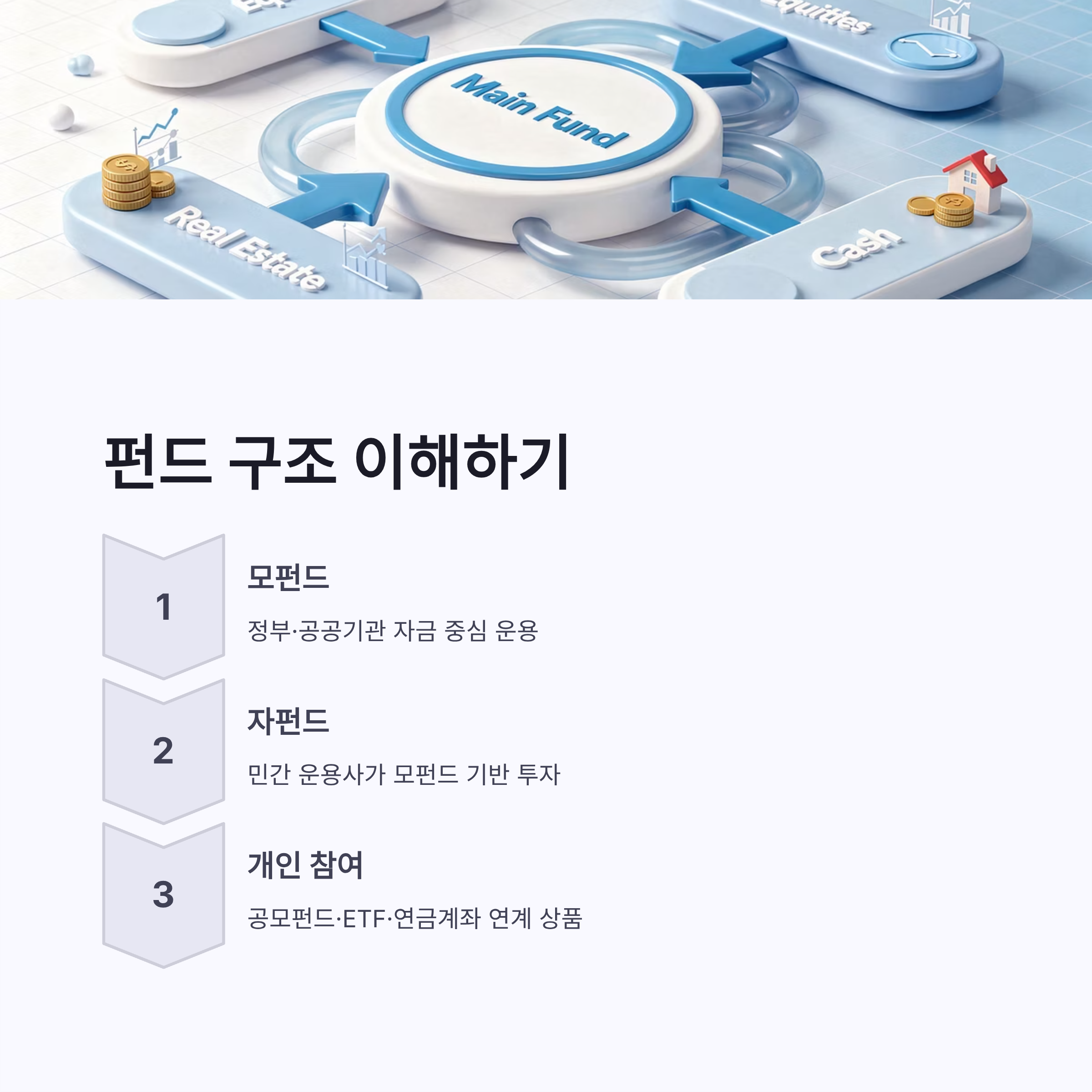 국민성장펀드는 크게 모펀드-자펀드 구조로 설계됩니다. 정부·공공기관 자금이 모펀드에 들어가고, 이를 바탕으로 민간 운용사가 자펀드를 만들어 투자하는 방식이에요. 그래서 개인 입장에서는 공모펀드·ETF·연금계좌 연계 상품 형태로 접근할 가능성이 큽니다. 제가 정리해본 구조는 이렇더라구요.