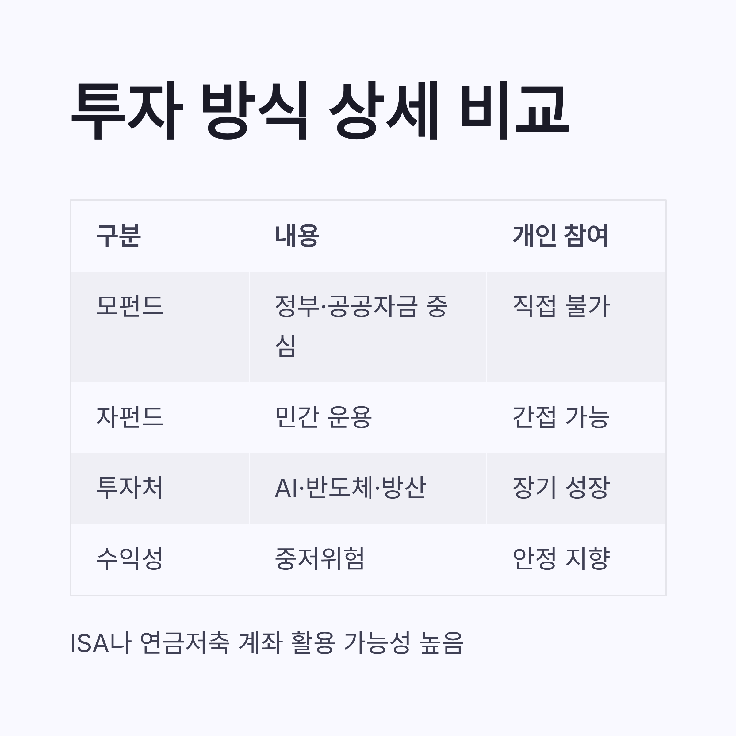 | 모펀드 | 정부·공공자금 중심 | 직접 불가 |