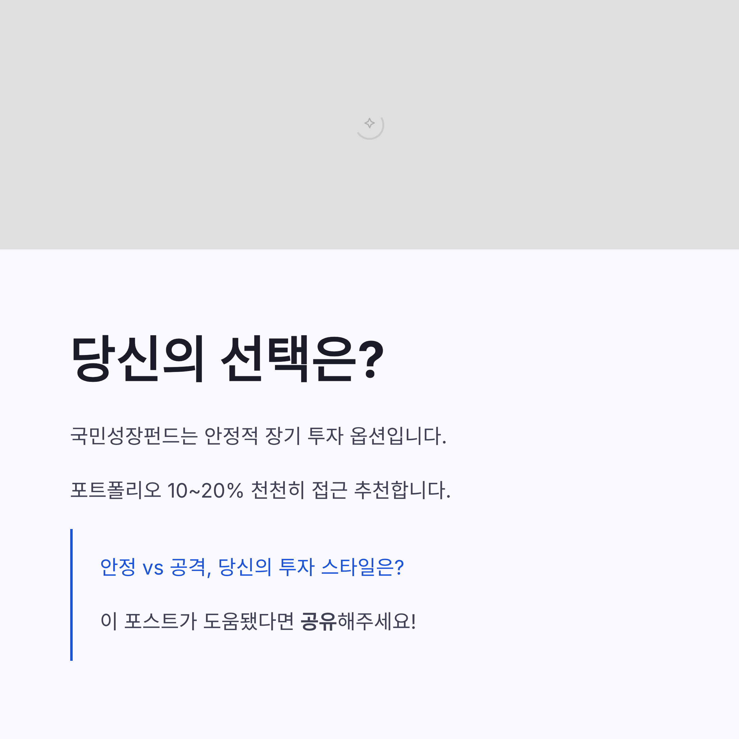 정리해보면 국민성장펀드는 나라 성장 흐름에 장기적으로 올라타고 싶은 분들한테 어울립니다. 개인이 직접 가입하는 구조는 아니지만, 앞으로 나올 연계 상품은 충분히 체크할 가치 있어 보여요. 저는 솔직히 전액 몰빵은 아니고요, 포트폴리오 10~20% 정도로 천천히 접근하는 게 맞겠다는 생각이 들더라구요. 여러분은 어떠신가요? 안정 쪽이 끌리시나요, 아니면 여전히 공격이 답일까요 ㅎㅎ