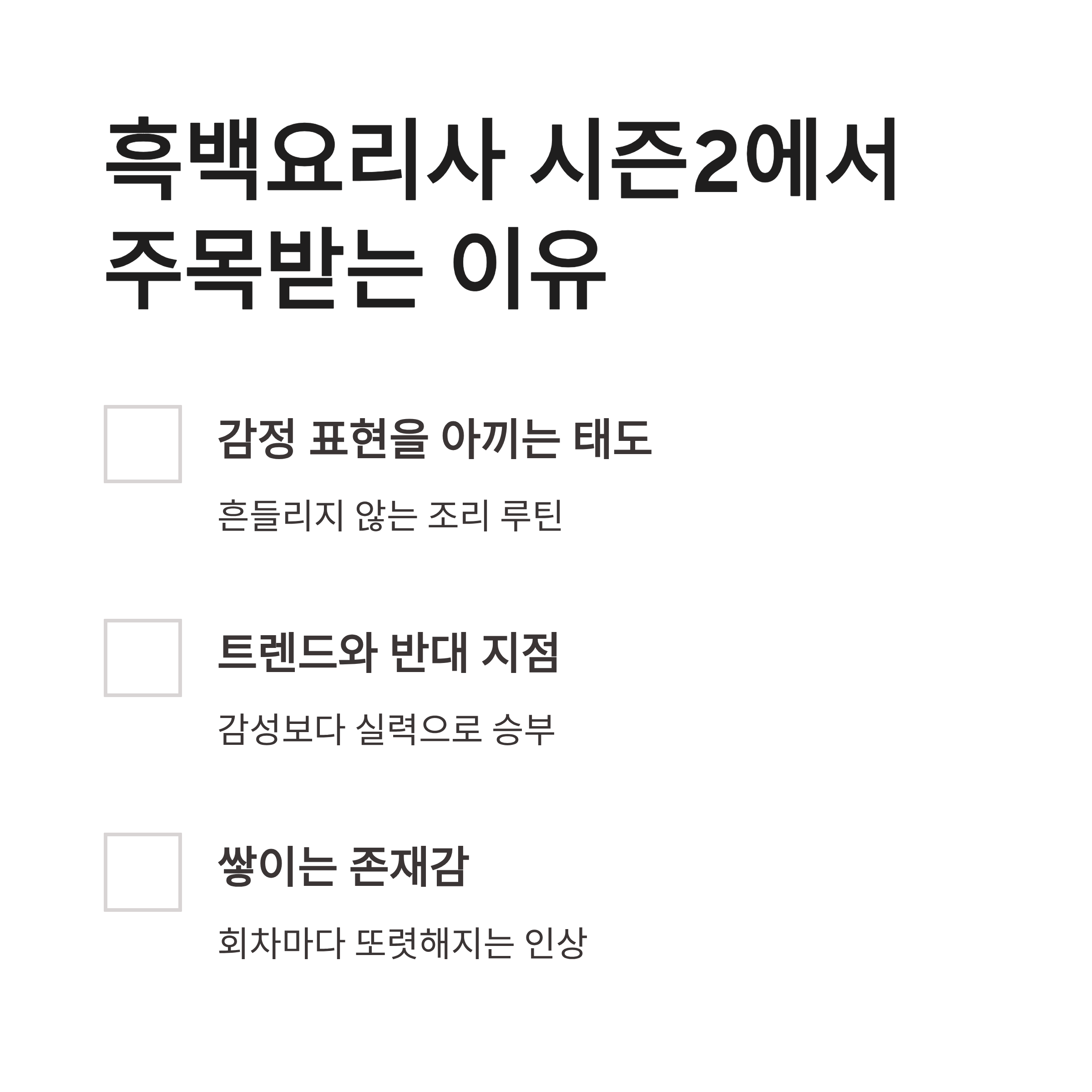 흑백요리사 시즌2 김시현 셰프가 화제가 되는 이유는 단순히 ‘어리다’거나 ‘귀엽다’ 때문은 아닌 것 같아요. 오히려 감정 표현을 아끼는 태도, 흔들리지 않는 조리 루틴이 더 크게 다가왔어요. 요즘 트렌드가 감성·스토리 위주라면, 김시현 셰프는 그 반대 지점에 서 있는 느낌? 장점은 안정감이고, 단점이라면 방송용 임팩트가 약해 보일 수 있다는 점인데요. 그럼에도 불구하고 회차가 쌓일수록 존재감이 더 또렷해지는 타입이라 장기전에서 강할 것 같더라구요.