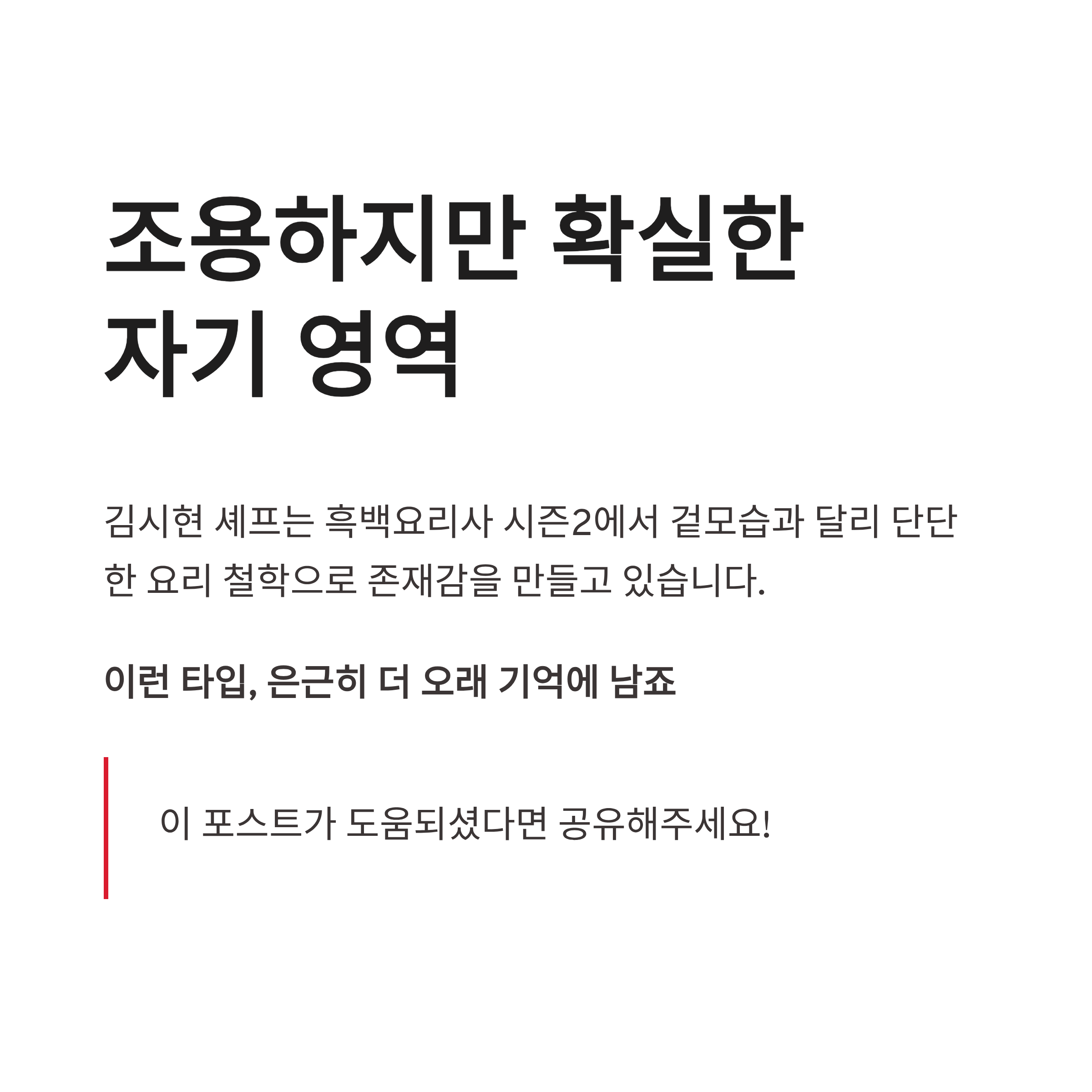 정리해보면 김시현 셰프는 흑백요리사 시즌2에서 조용히, 하지만 확실하게 자기 영역을 만들고 있는 인물이에요. 겉모습만 보면 놓치기 쉬운데, 계속 보다 보면 “아, 이 사람 오래 가겠구나” 싶은 느낌이 들더라구요. 요리 예능을 넘어 실제 셰프로서의 행보도 괜히 궁금해지고요. 앞으로 어떤 요리를 보여줄지, 어떤 선택을 할지 자연스럽게 지켜보게 됩니다. 이런 타입, 은근히 더 오래 기억에 남는 거 아시쥬? ㅎㅎ