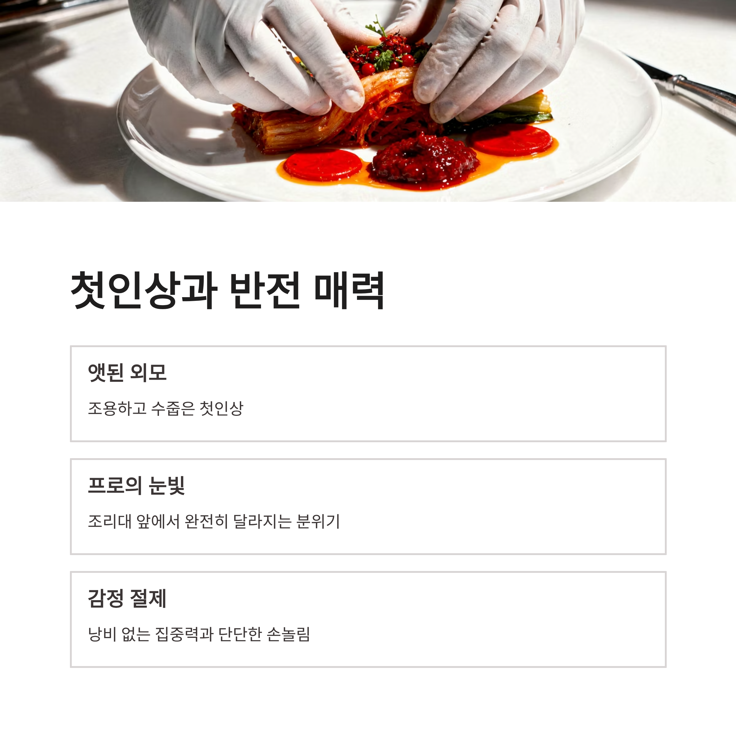 넷플릭스 흑백요리사 시즌2 보다가 저처럼 눈길 확 간 분들 많을 거예요. 그중에서도 유독 기억에 남는 인물, 바로 김시현 셰프였는데요. 등장할 때는 솔직히 “어? 되게 앳되다” 이런 생각부터 들었어요. 말수도 적고 조용한데, 막상 조리대 앞에 서는 순간 분위기가 완전 달라지더라구요. 눈빛이 바뀌는 게 딱 느껴짐… 이게 바로 프로구나 싶었어요. 김시현 셰프는 귀여운 외형과 달리 요리할 때는 감정 낭비 없이 집중하는 스타일이라 더 인상 깊었구요. 수줍은 태도와 단단한 손놀림의 대비가 계속 화면을 보게 만들었습니다.