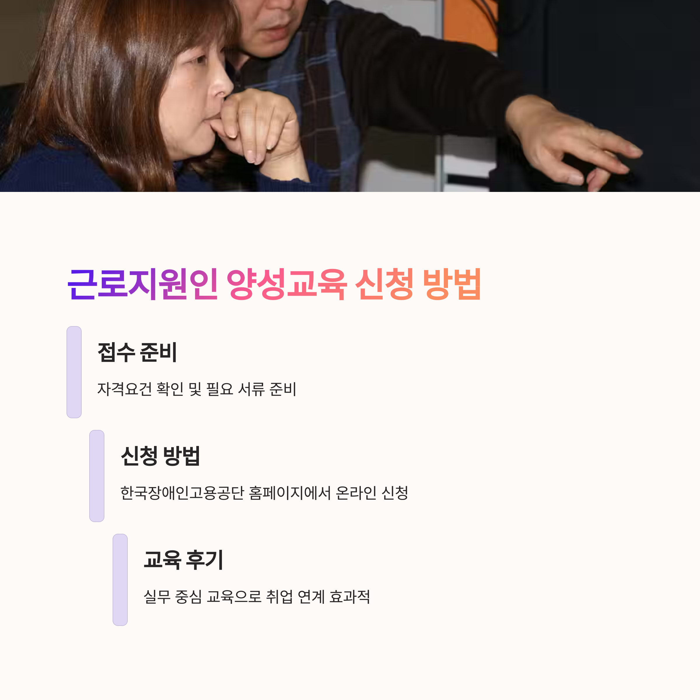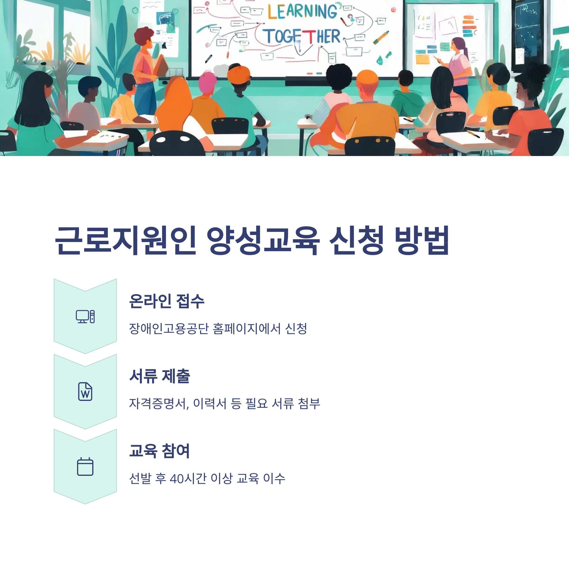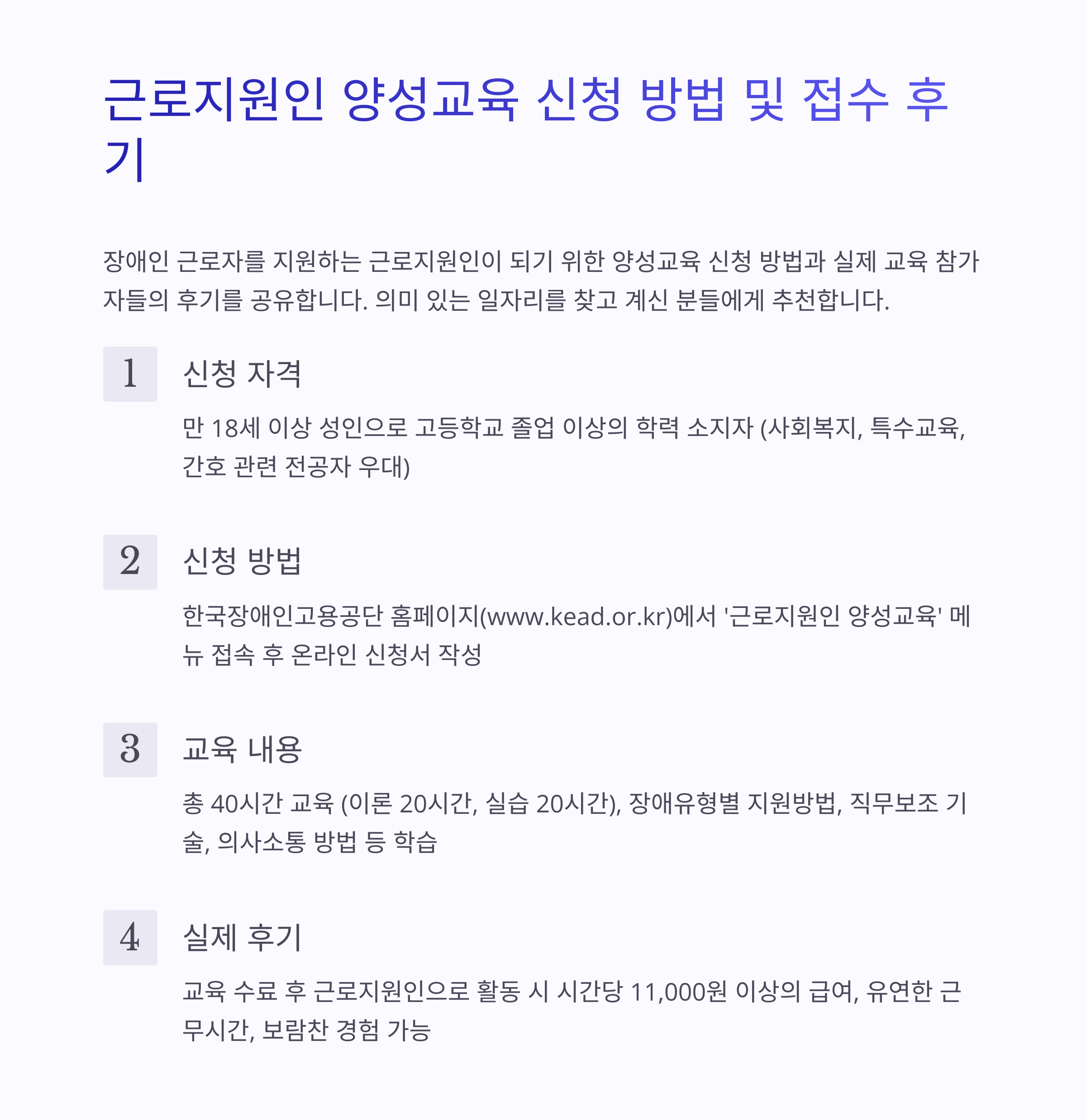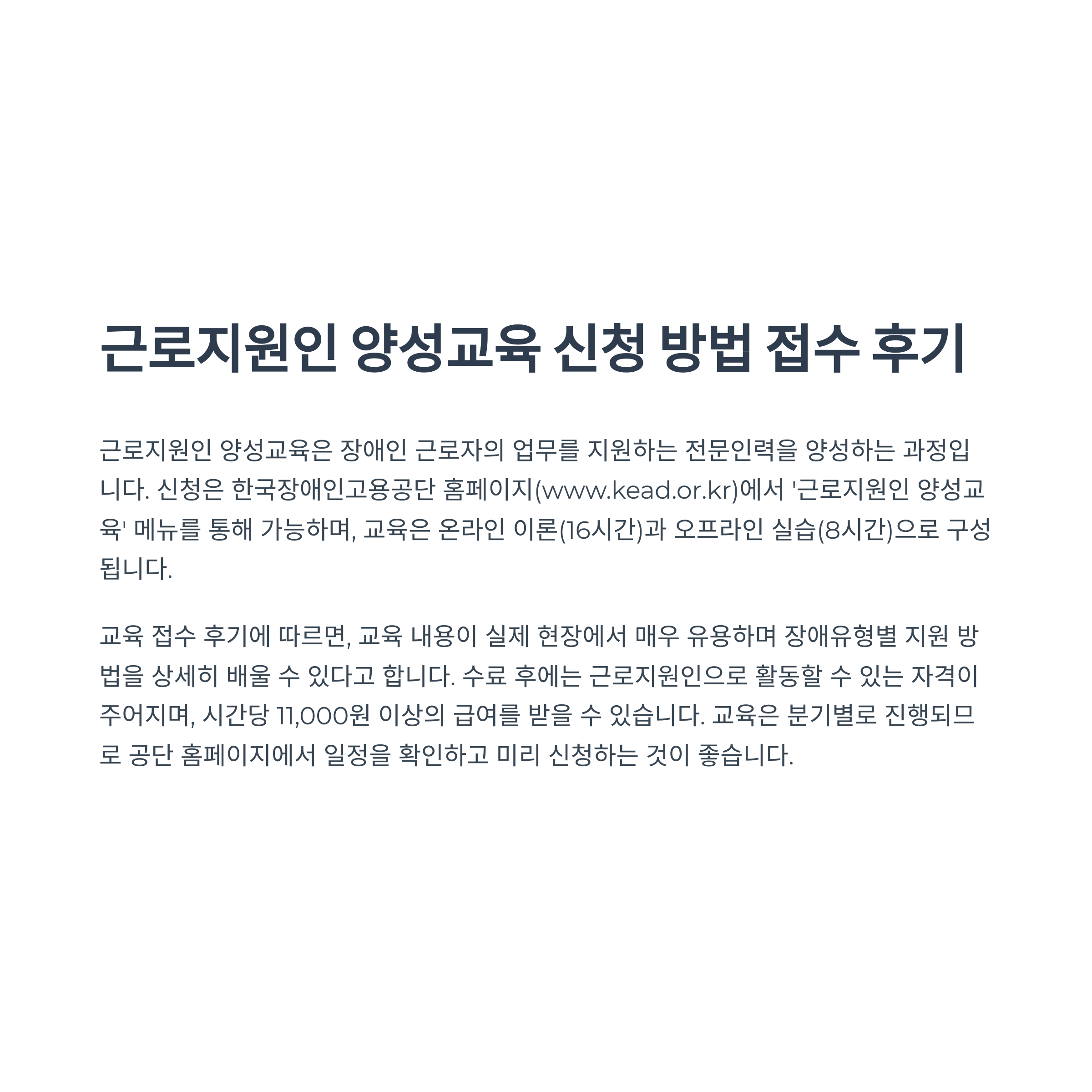 | 교육내용 | 직무보조 기술, 장애유형 이해, 직장 내 커뮤니케이션 등 |