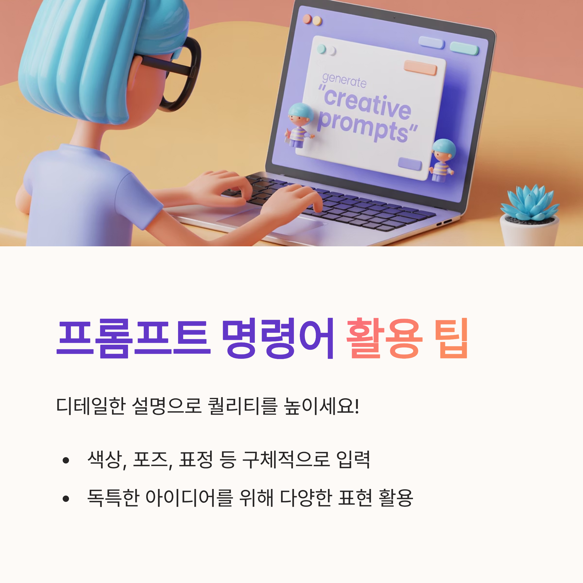 명령어를 잘 써야 퀄리티가 올라가요! 프롬프트 명령어에는 디테일한 설명을 더하는 것이 중요한데요. 예를 들어 색상, 포즈, 표정 등을 함께 입력하면 더 정확한 결과가 나오더군요! 특히, 자신만의 독특한 아이디어를 살리고 싶다면 다양한 표현을 섞어보는 것도 좋은 방법입니다. 뭐, 혹시라도 잘 안 되면 여러 번 시도해보는 것도 방법이랍니다! 🤗
