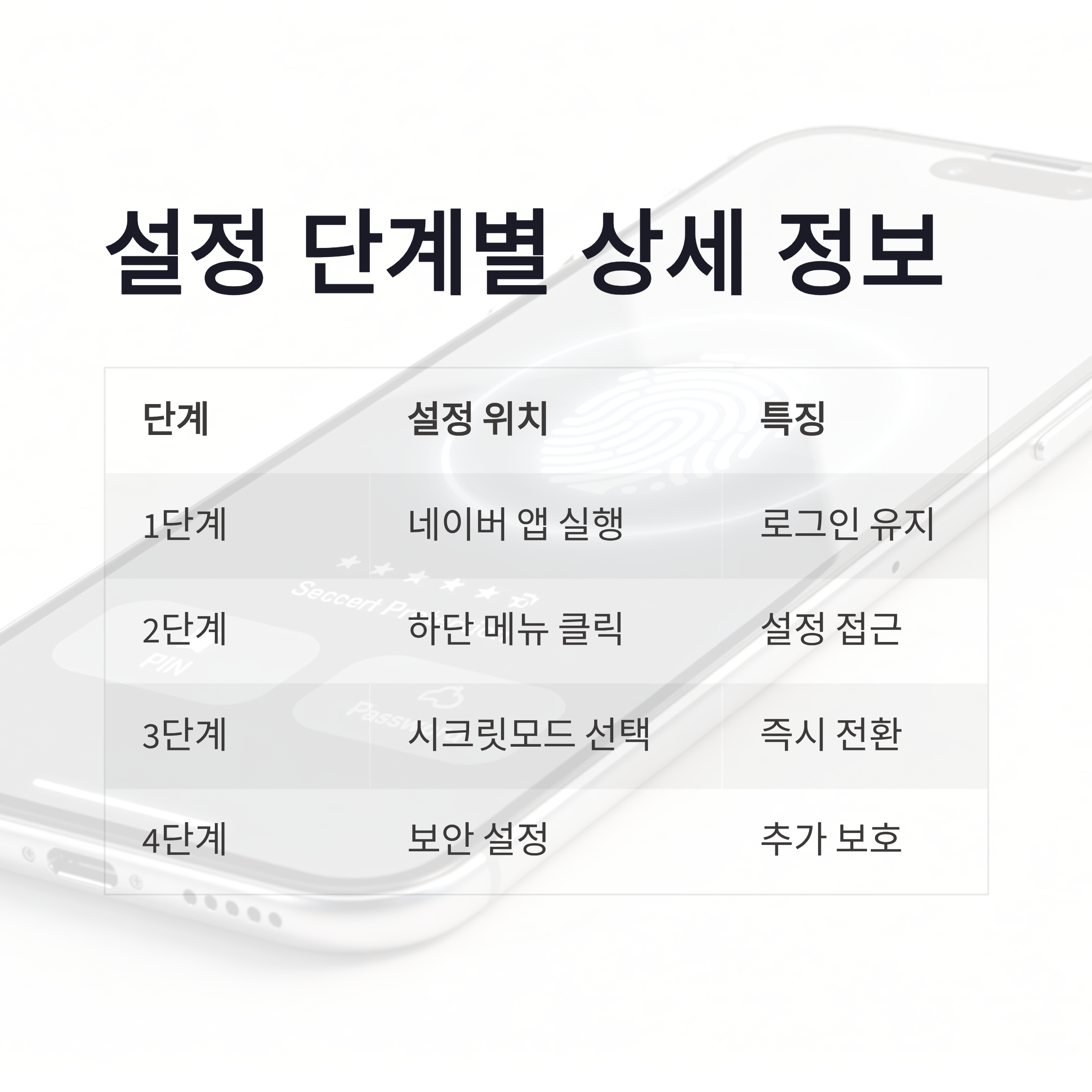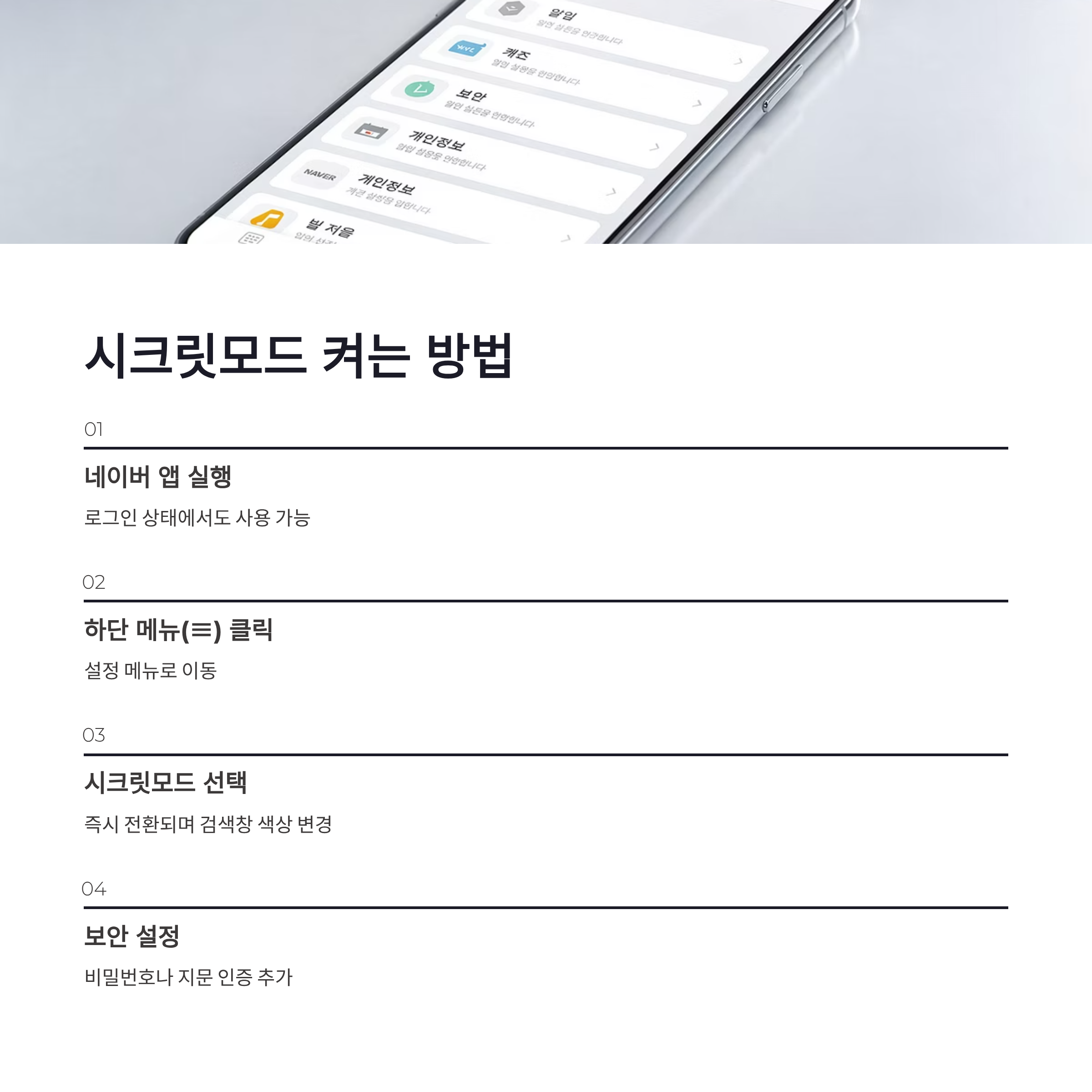 | 단계 | 설정 위치 | 실제 느낌 | | -- | ----------- | ------------ | | 1 | 네이버 앱 실행 | 로그인 상태여도 가능 | | 2 | 하단 메뉴(≡) 클릭 | 설정 찾기 여기서 시작 | | 3 | 시크릿모드 선택 | 바로 전환됨 | | 4 | 비밀번호/지문 설정 | 보안 체감 확 올라감 |