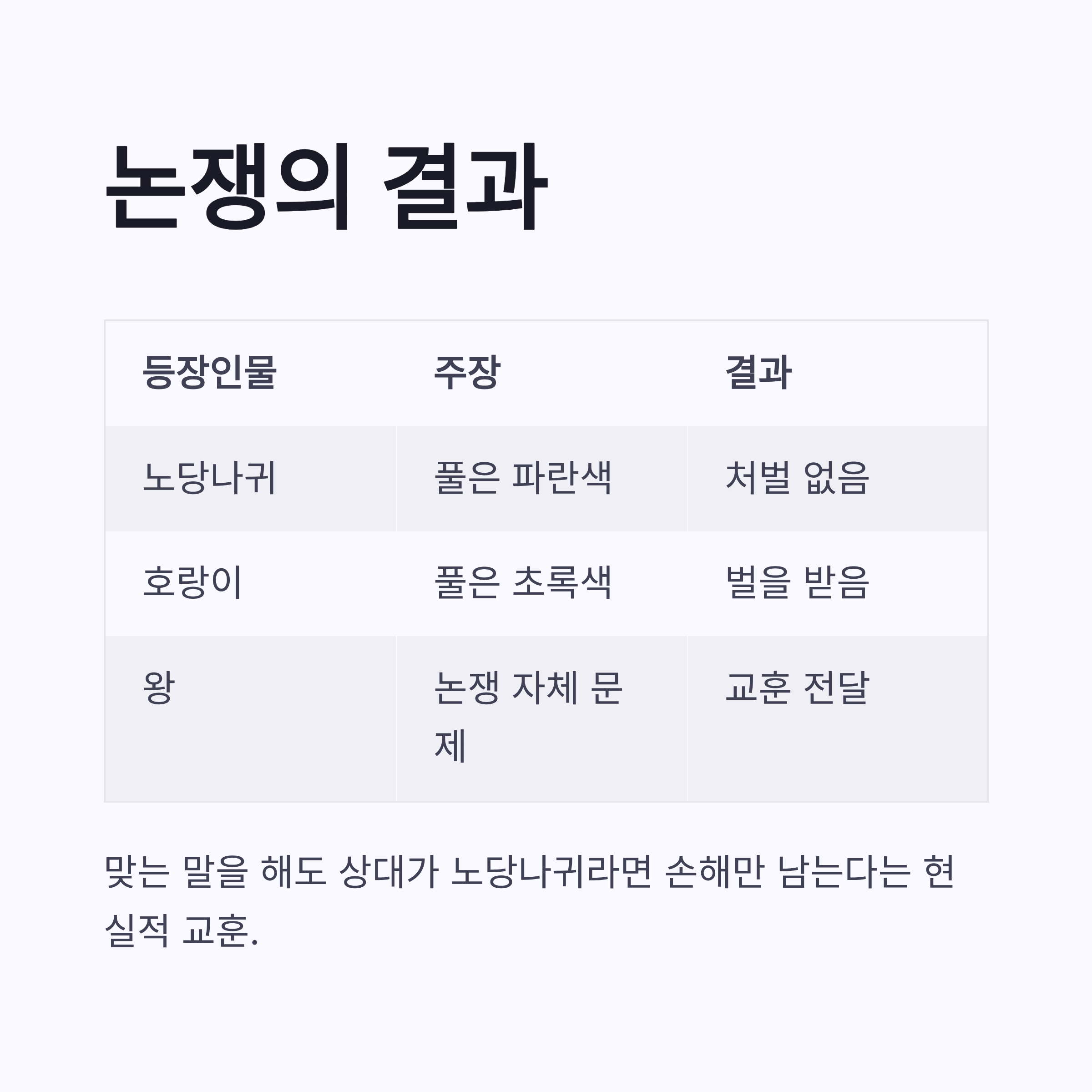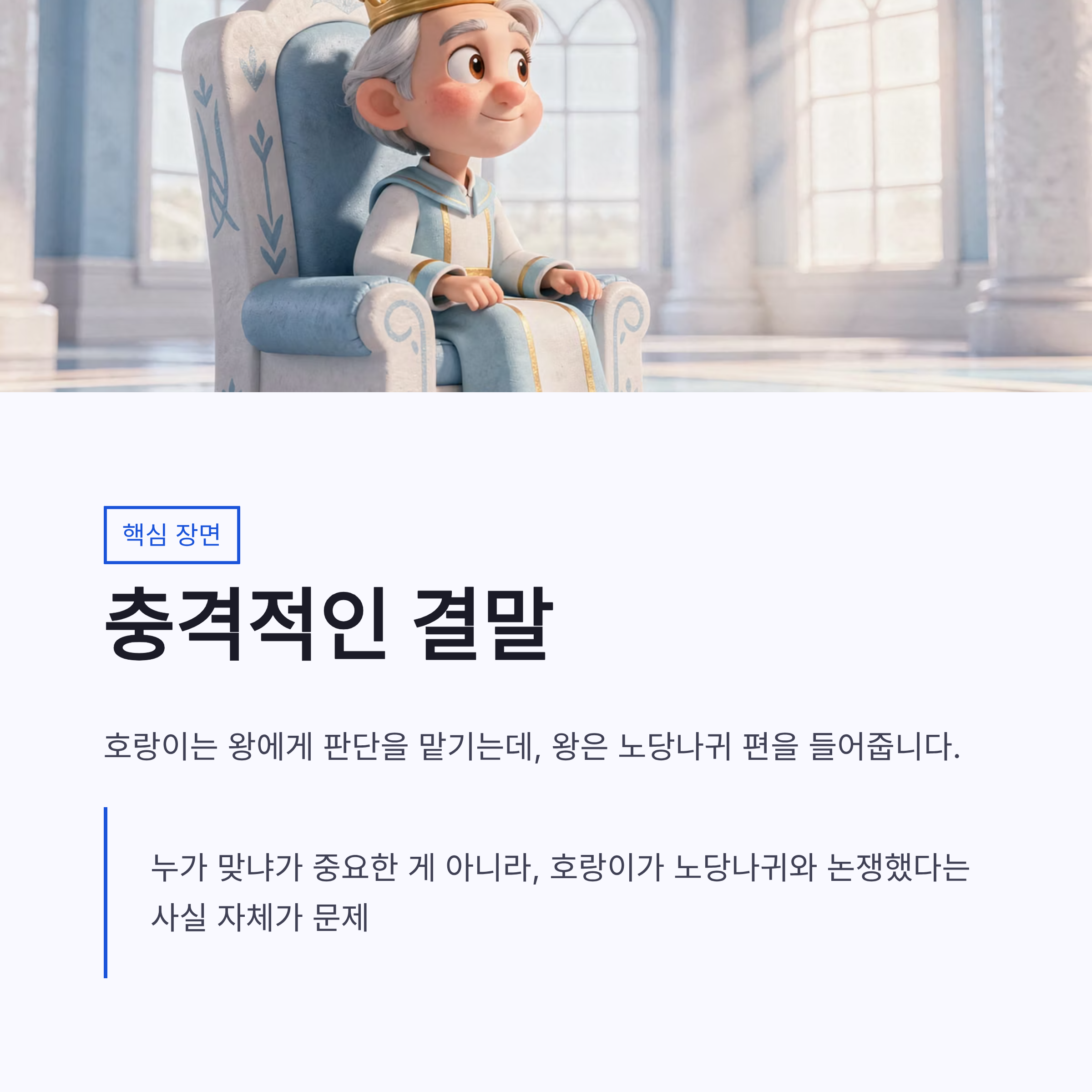 이야기의 결말이 진짜 포인트예요. 호랑이는 결국 왕에게 판단을 맡기는데, 왕은 노당나귀의 말을 들어줍니다. 이유는 충격적이에요. 누가 맞냐가 중요한 게 아니라, 호랑이가 노당나귀와 논쟁했다는 사실 자체가 문제라는 거죠.