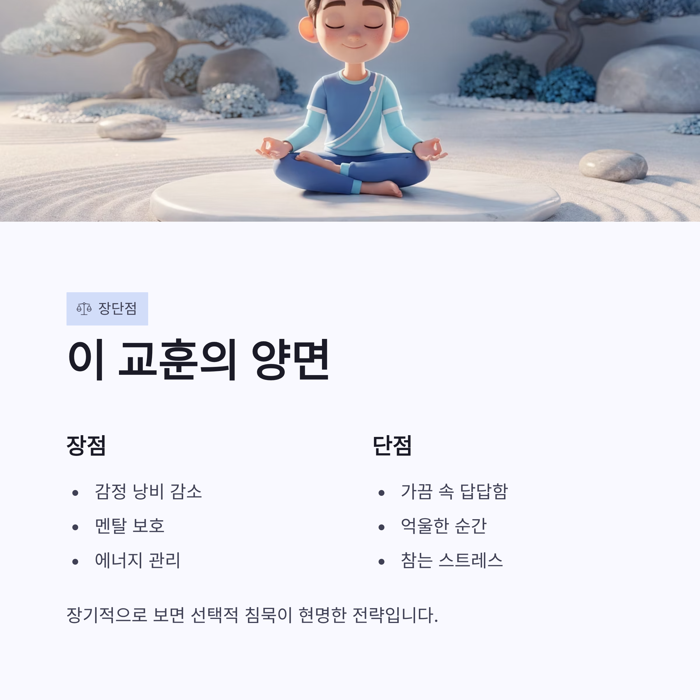 요즘 트렌드로 보면 이 이야기는 완전 “댓글 싸움 금지 교과서” 같아요. 2025년 기준으로 온라인 커뮤니티나 SNS 갈등 사례를 보면, 팩트를 들고 나와도 상대가 받아들일 준비가 안 돼 있으면 끝까지 소모전이 되더라구요. 노당나귀와 호랑이의 교훈은 명확해요. 장점은 감정 낭비를 줄일 수 있다는 것, 단점은 가끔 속이 좀 답답하다는 점 ㅠㅠ 그래도 장기적으로 보면, 모든 싸움에 호랑이처럼 뛰어드는 건 진짜 손해더라구요. 선택적으로 침묵하는 것도 능력이라는 말, 요즘 들어 더 와닿았어요.