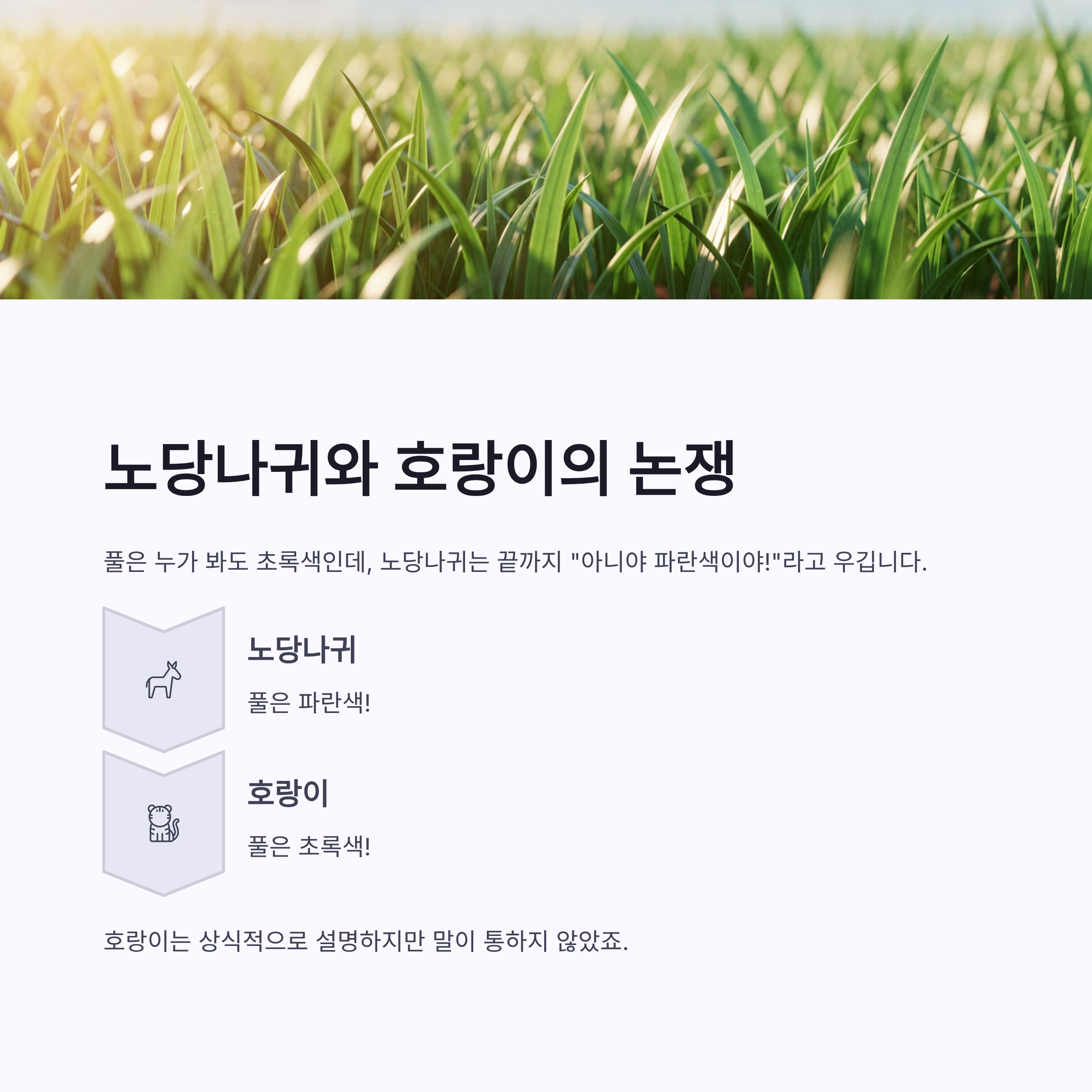 살다 보면 진짜 굳이 저렇게까지 싸워야 하나… 싶은 순간이 꼭 오더라구요. 온라인 댓글창이든, 회사 단톡이든, 심지어 가족 대화에서도요. 이럴 때 떠오르는 우화가 바로 노당나귀와 호랑이 이야기예요. 노당나귀와 호랑이는 아주 단순한 사실 하나를 두고 끝없는 논쟁을 벌이는데요. 풀은 누가 봐도 초록색인데, 노당나귀는 끝까지 “아니야 파란색이야!”라고 우기죠. 호랑이는 상식적으로 설명해보지만, 말이 통할 리가 없었구요. 읽으면서 저도 “아… 이거 완전 현실이다 ㅋㅋ” 싶었어요. 노당나귀와 호랑이 이야기가 오래 살아남은 이유가 있더라구요.