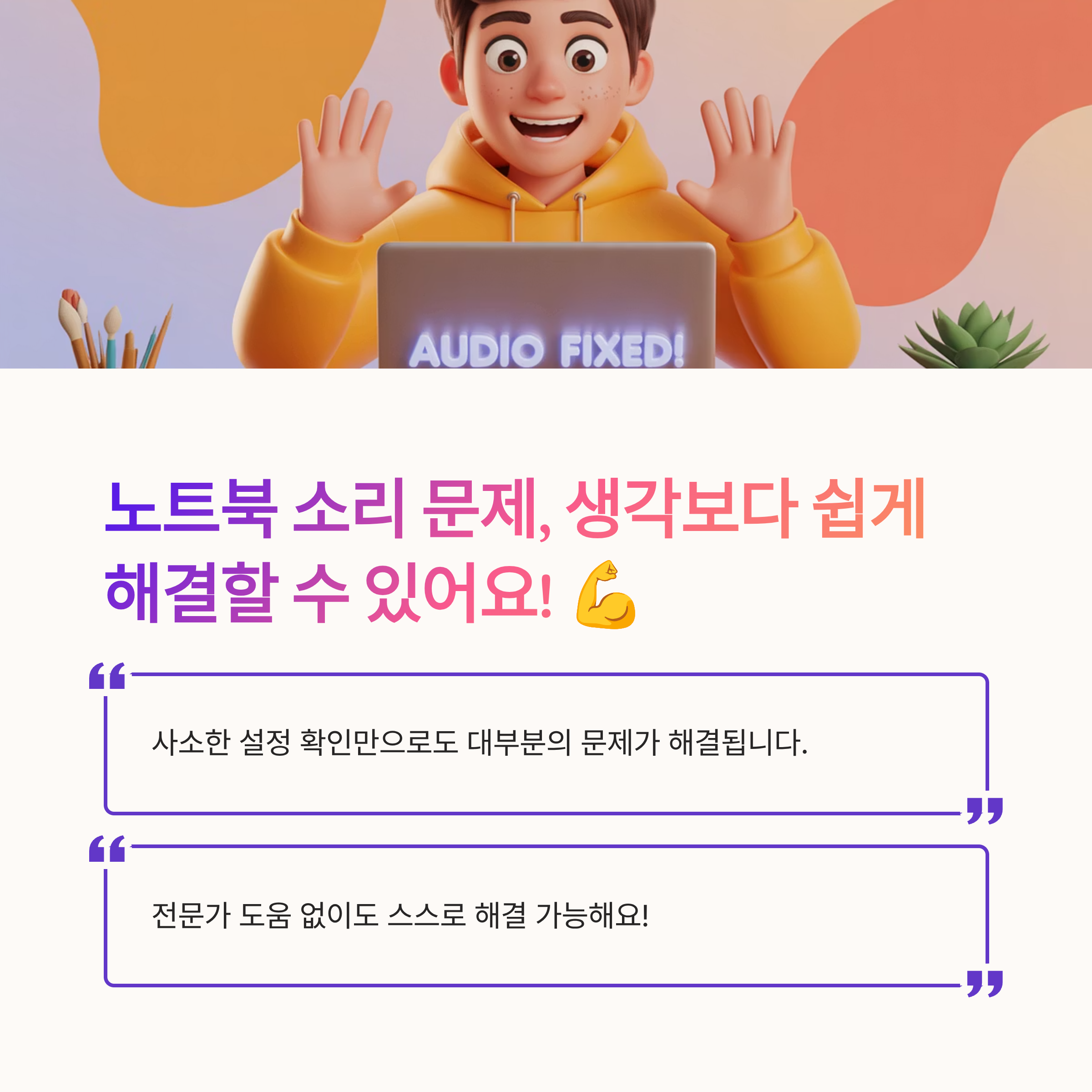아, 이제 글 마저 읽고, 바로 노트북 소리 확인 한번 해보셔요! 노트북이 내는 소리가 얼마나 중요한지 다시 느끼게 될 거예요. 만약 여전히 문제라면 위의 방법들 한번씩 차근차근 시도해보세요. 해결하지 못할 문제는 없답니다!