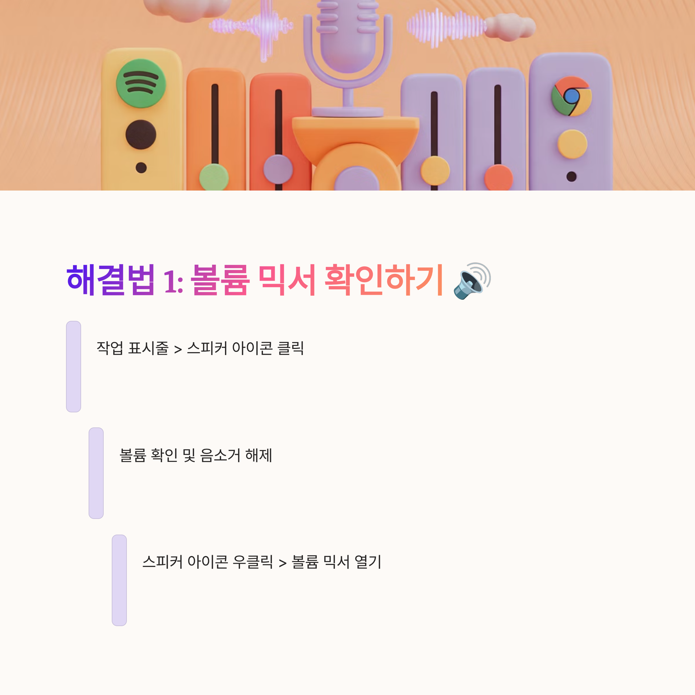 제일 먼저 중요한 건 뭐다? 바로, 볼륨 확인하기죠! 시스템 볼륨이 줄어들었거나, 음소거가 되어 있는 건 아닌지 꼭 확인해보세요. 볼륨 믹서에 들어가면 다양한 프로그램의 볼륨을 한 번에 볼 수 있으니, 뭔가 꺼져있는 게 없는지 체크하세요.