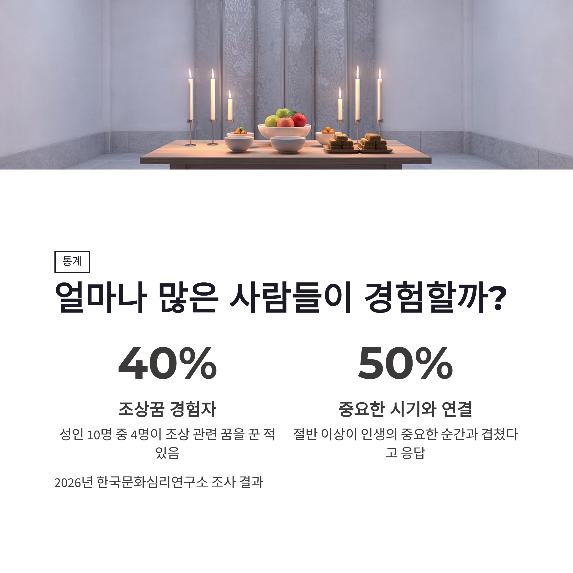 보통 돌아가신 조상꿈은 보호, 경고, 또는 조언의 의미로 많이 해석됩니다. 2026년 기준으로 한국문화심리연구소 조사에 따르면 성인 10명 중 4명은 “조상 관련 꿈을 꾼 적 있다”고 답했는데요. 그중 절반 이상이 “중요한 시기와 겹쳤다”고 응답했다는 통계도 있었어요.