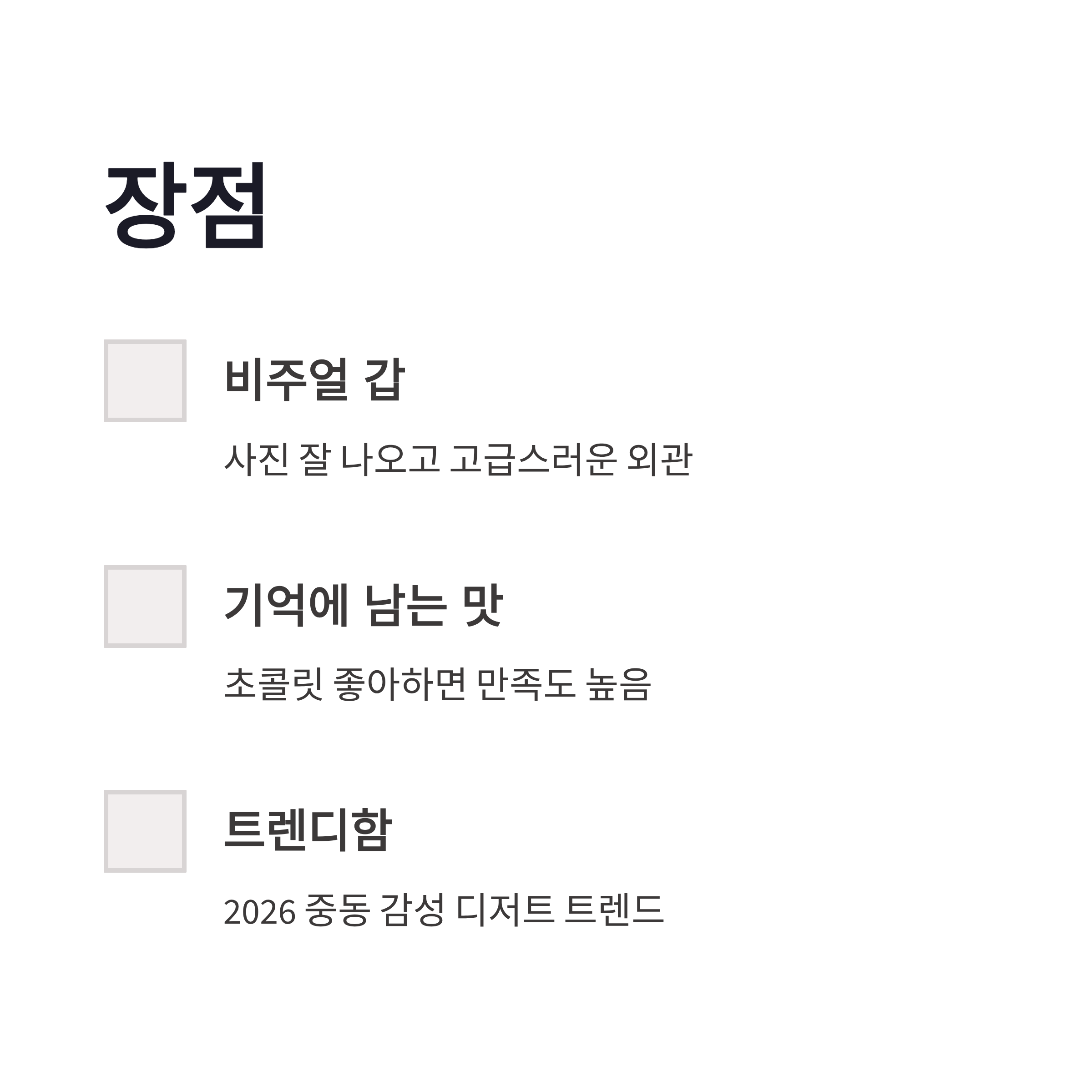 2026년 디저트 트렌드 보면 “비주얼 + 고급 재료” 이 흐름이 확실한데, 두바이 스타일 초콜릿 도넛도 딱 그 노선이었습니다. 장점부터 말하면, 확실히 사진 잘 나오고 맛도 기억에 남아요. 초콜릿 좋아하는 분들은 만족할 확률 높구요. 반대로 단점은 가격 대비 자주 먹기엔 부담, 그리고 단맛이 꽤 강한 편이라는 점이었습니다. 개인적으로는 *하나로 끝내기 좋은 도넛*이지, 여러 개 먹는 타입은 아니더라구요. 요즘은 이런 중동 감성 디저트가 편의점·카페까지 확장되는 분위기라, 이 도넛도 그 흐름을 잘 탄 느낌이었슴다.
