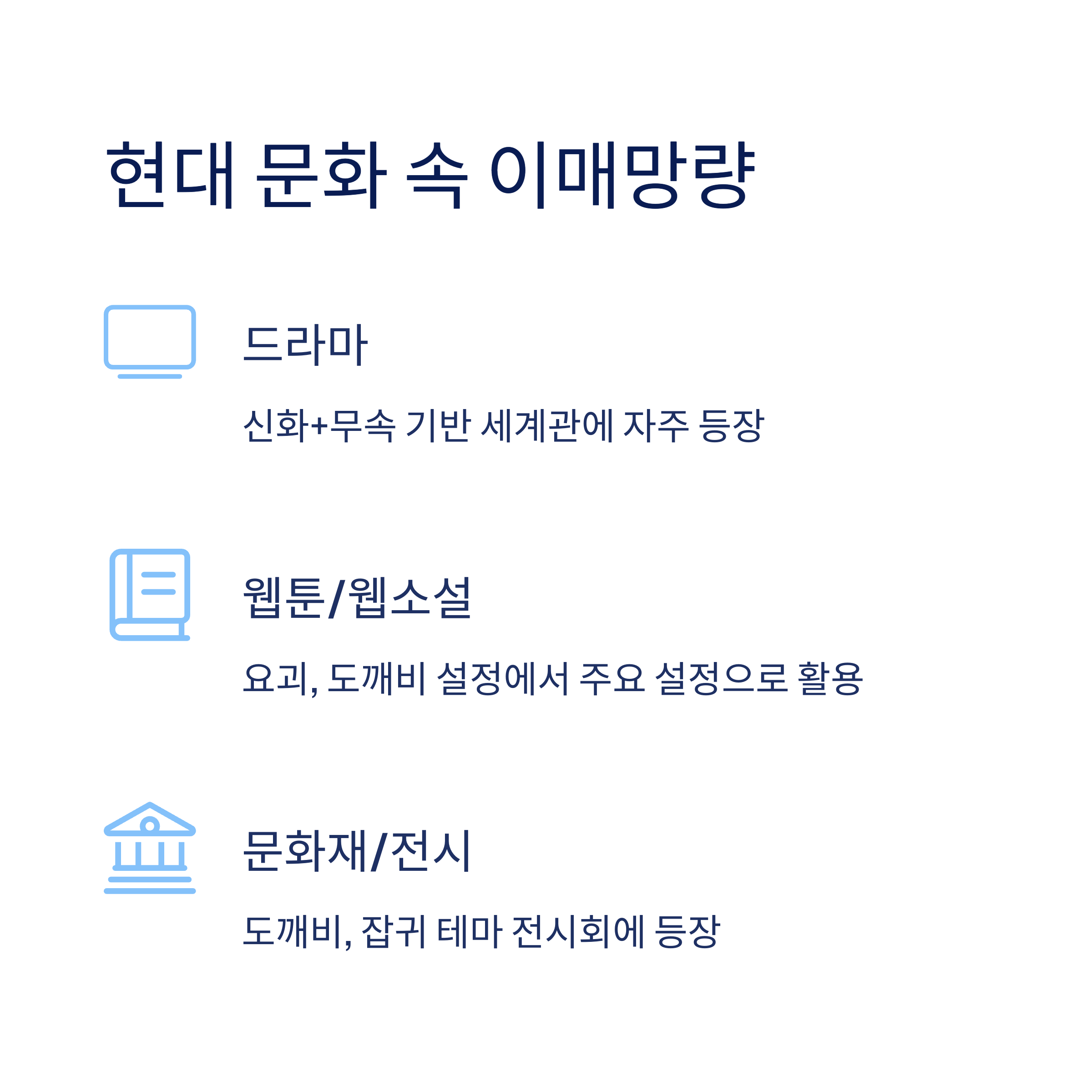 - 현대 콘텐츠에서는 전통과 판타지를 연결하는 장치로 자주 활용됩니다