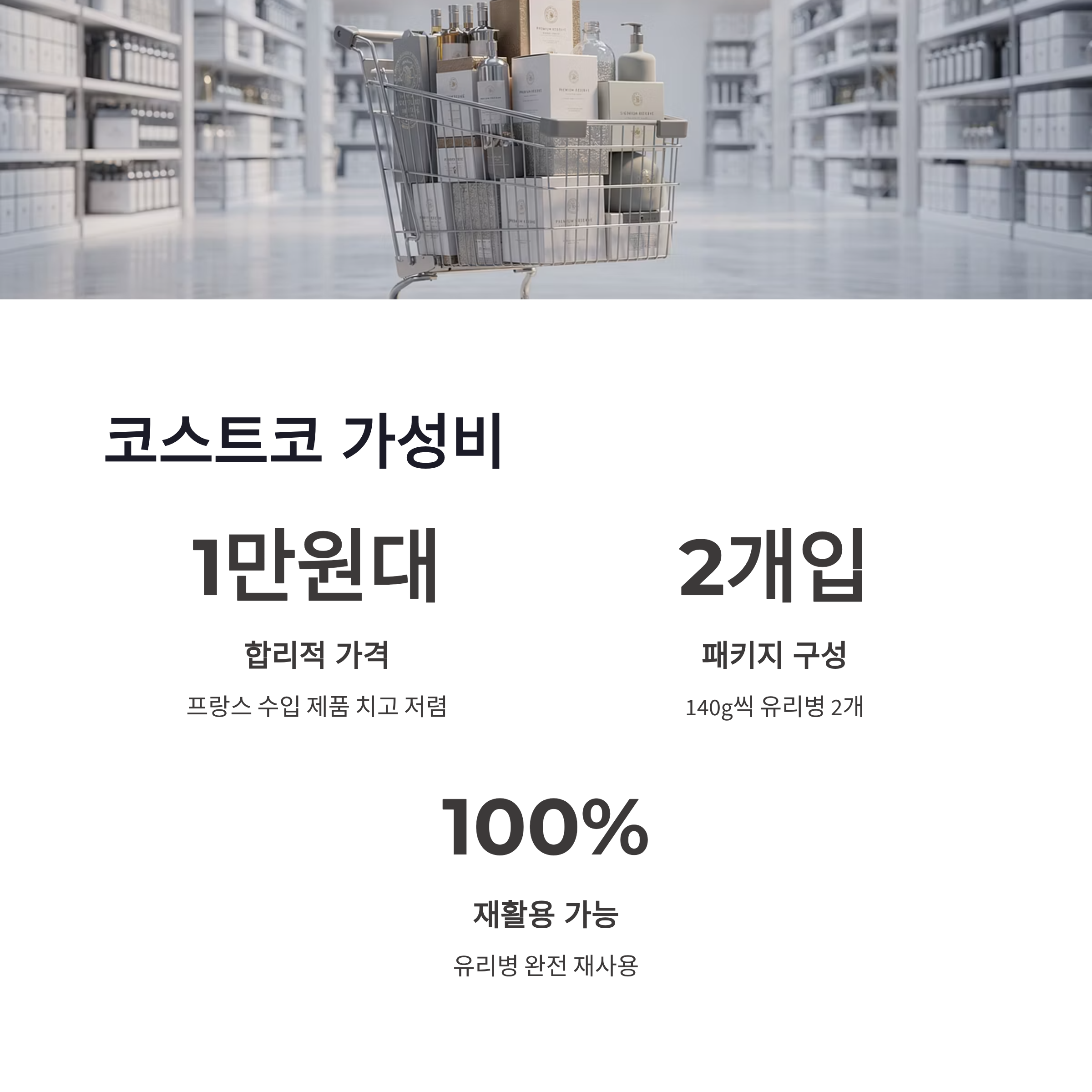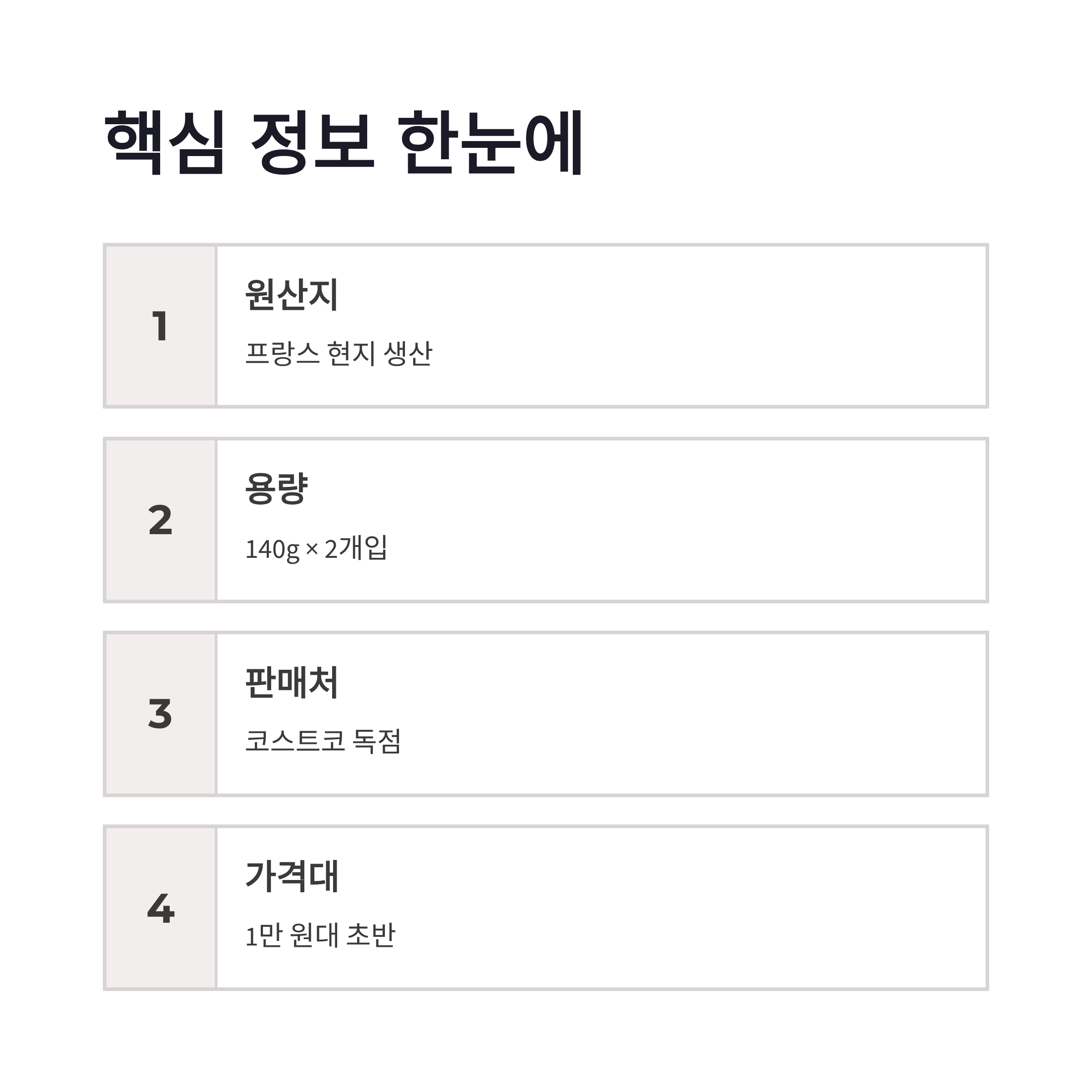 프랑스에서 수입해 오는 제품이라서 가격이 좀 있어요. 그렇지만 코스트코 회원이라면 꽤 합리적인 가격대로 구매 가능하다는 평이 많아요. 특히 두 개 들이 유리병 패키지가 감성 쩔어서 *선물 용*으로도 좋다는 얘기 많더라고요.