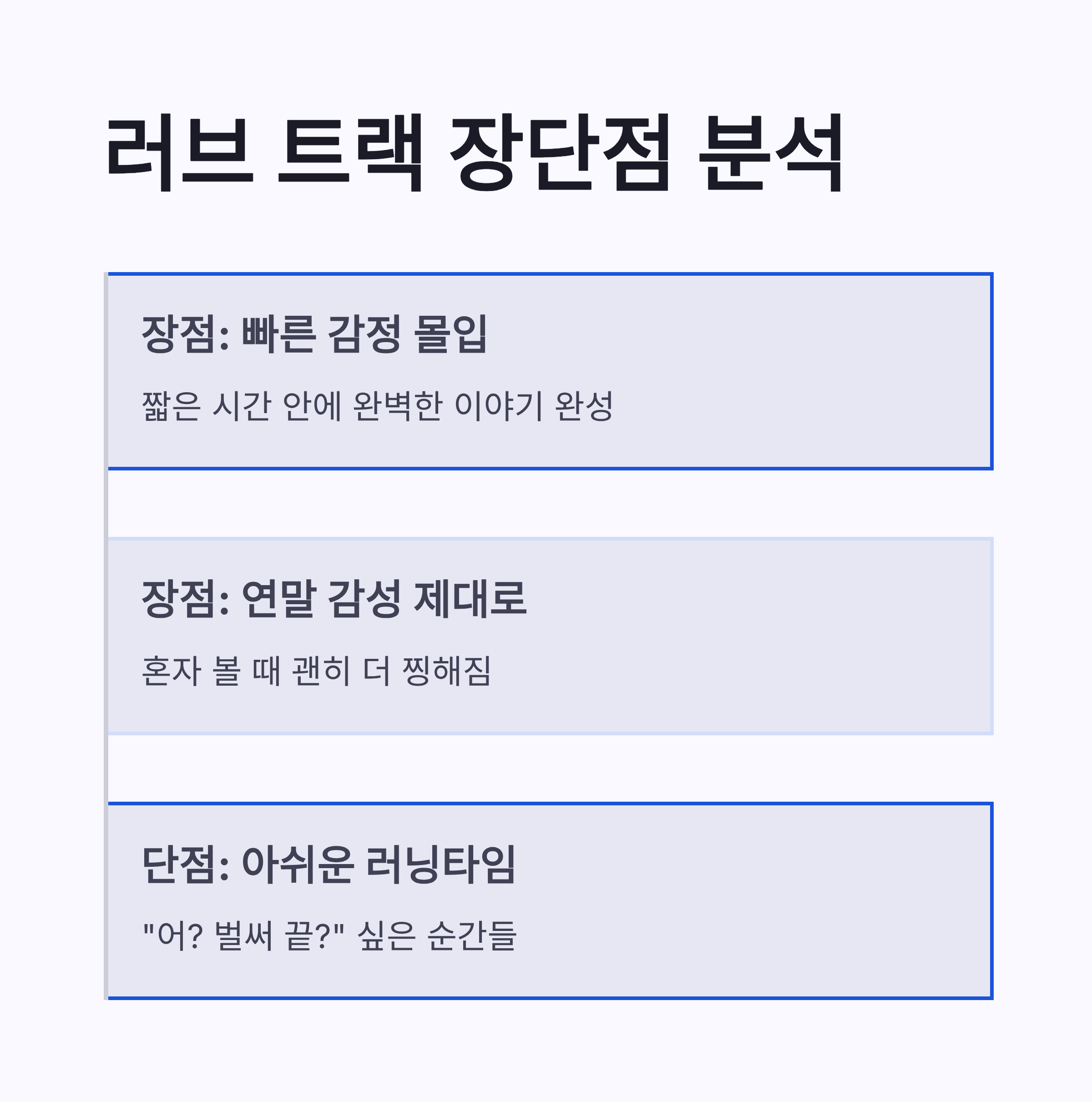 요즘 드라마들 솔직히 길잖아요. 근데 러브 트랙은 짧고 굵게 치고 빠지는 스타일이라 오히려 더 집중됐어요. 최신 트렌드인 숏폼 감성에도 잘 맞고요. 장점은 감정 몰입이 빠르다는 점, 단점은 “어? 벌써 끝이야?” 싶은 아쉬움 정도…ㅠㅠ 그래도 연말에 가볍게 보기엔 이만한 게 없더라구요. 특히 혼자 볼 때 괜히 더 찡해짐 주의입니다.