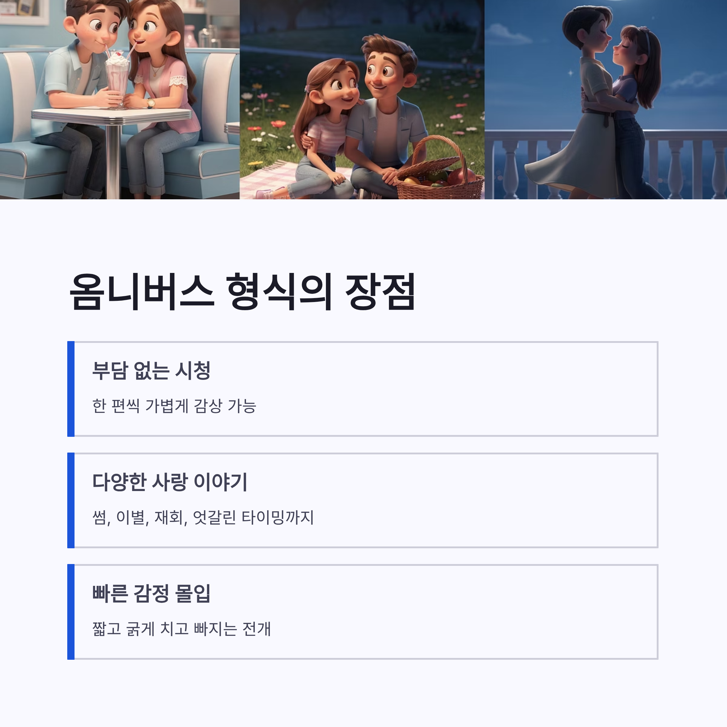 러브 트랙은 각 회차마다 전혀 다른 분위기로 구성돼요. 썸, 이별, 재회, 타이밍 엇갈린 사랑까지 다 담았다고 보면 되는데요. 개인적으로 이런 옴니버스 형식이 좋았던 게, 부담 없이 한 편씩 보기 좋다는 점이었어요.