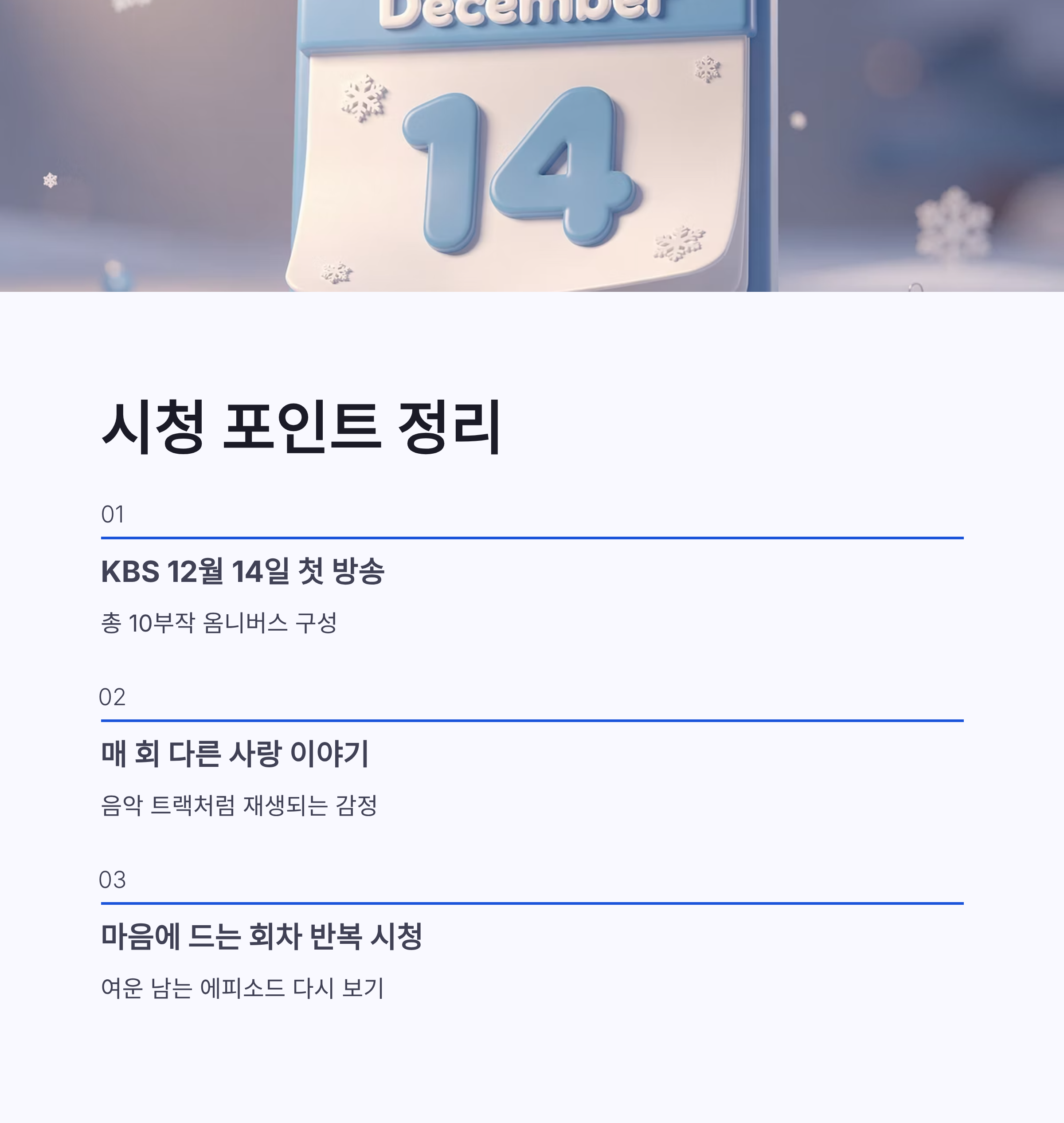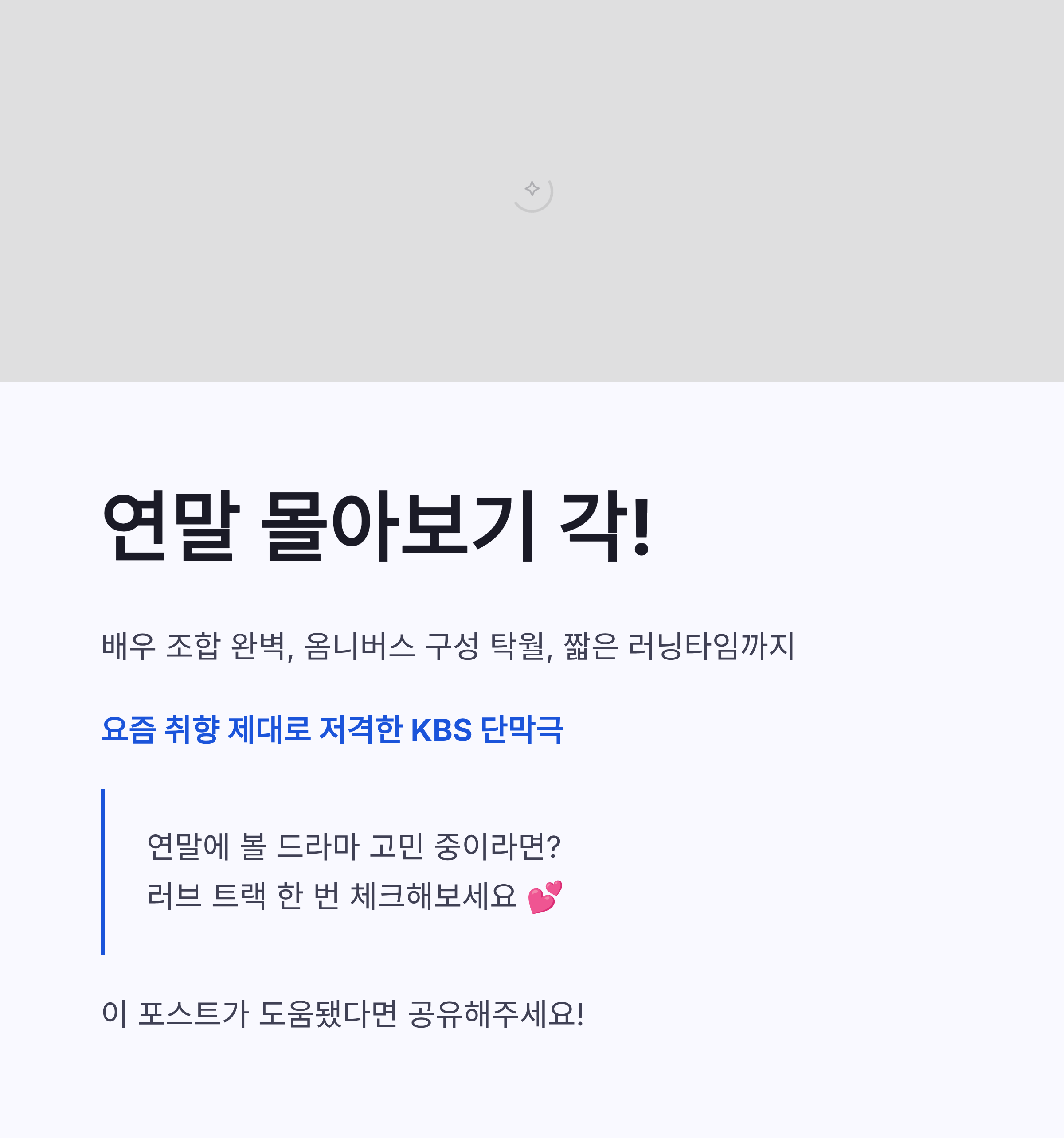 정리해보면 러브 트랙은 연말 감성 제대로 저격한 KBS 단막극이에요. 배우 조합, 옴니버스 구성, 짧은 러닝타임까지 딱 요즘 취향이구요. 부담 없이 한 편씩 보다가, 마음에 남는 회차는 다시 돌려보게 되는 그런 느낌이랄까. 연말에 볼 드라마 고민 중이라면 러브 트랙 한 번 체크해보는 거, 나쁘지 않겠쥬? ㅎㅎ