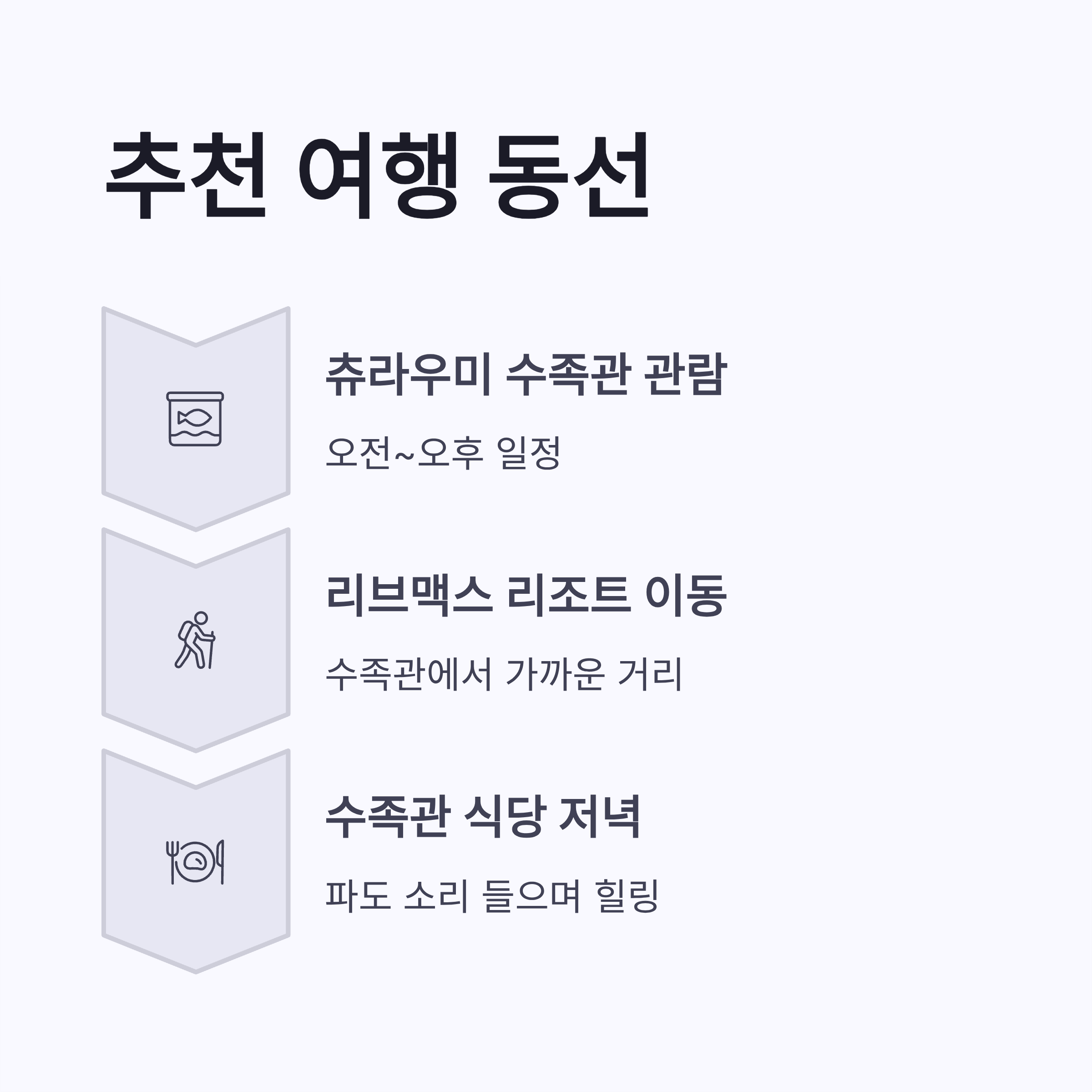 제가 찾아본 2025년 기준 정보로는 성수기엔 사전 예약 거의 필수예요. 특히 미우새 방영 이후엔 문의가 확 늘었다고 하더라구요. 리브맥스 리조트 투숙객이 아니어도 이용 가능하지만, 자리는 투숙객 우선이라 시간 맞추는 게 중요했구요. 오키나와 여행 중이라면 수족관 보고 바로 이동하는 동선이 제일 깔끔했어요. 이런 거 은근 중요함니다~