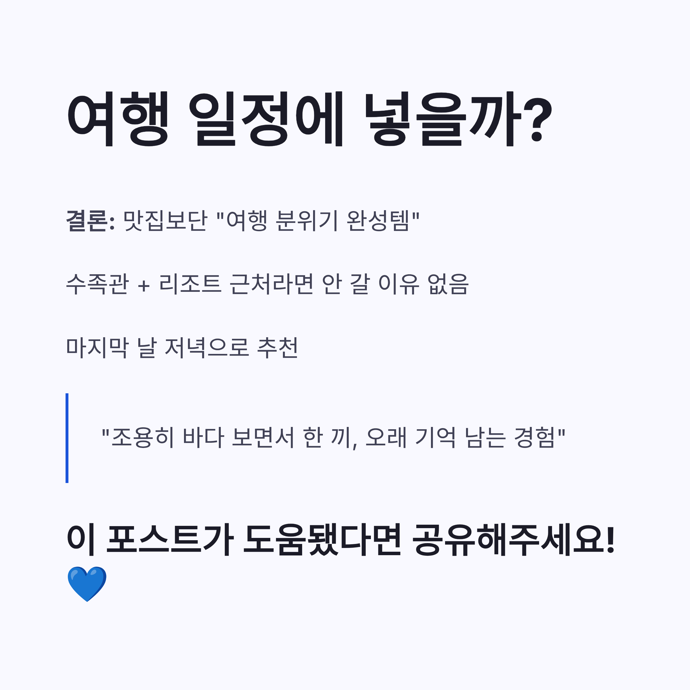 정리해보면, 오키나와 수족관 식당은 “맛집”이라기보단 “여행 분위기 완성템”에 가까웠어요. 미우새, 런닝맨 보고 기대한 감성? 거의 그대로라고 봐도 됐구요. 수족관 일정 + 리브맥스 리조트 근처 숙소라면 안 갈 이유가 없었어요. 저라면 마지막 날 저녁으로 딱 넣을 듯했구요. 조용히 바다 보면서 한 끼, 이거 은근 오래 기억 남더라구요. 오키나와 여행 계획 중이신데 여기 살짝 고민 중이라면… 음, 저는 추천 쪽이었심다 ㅎㅎ