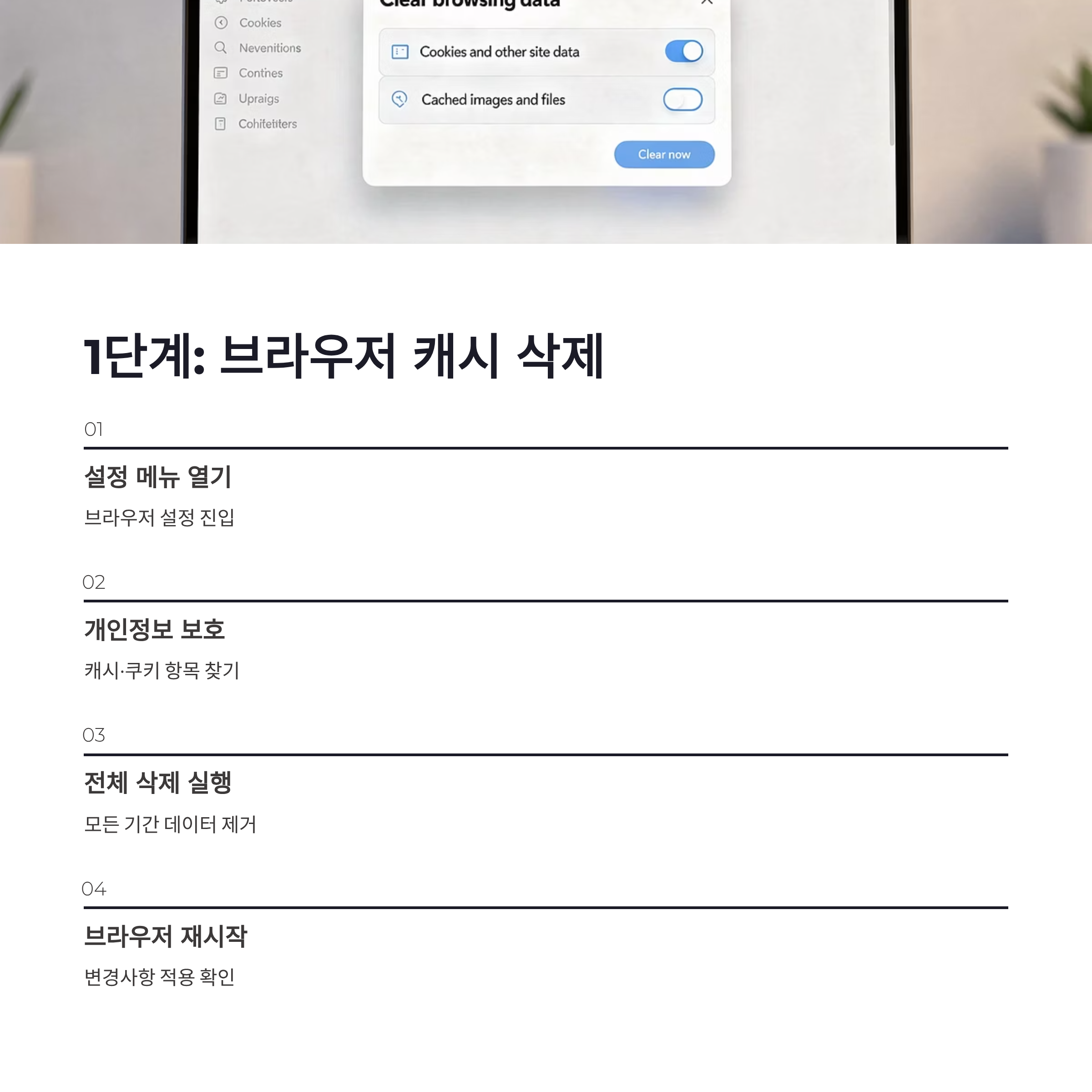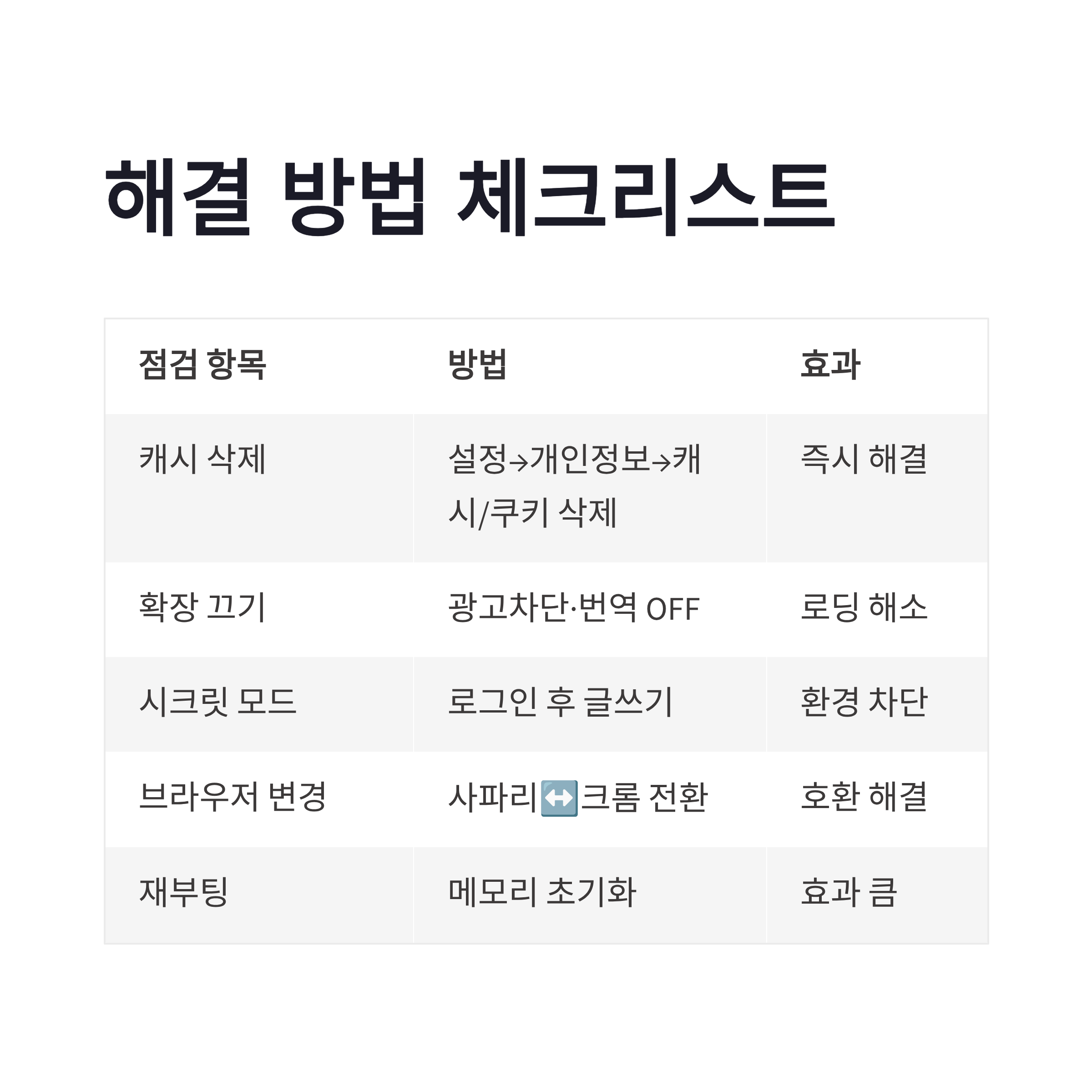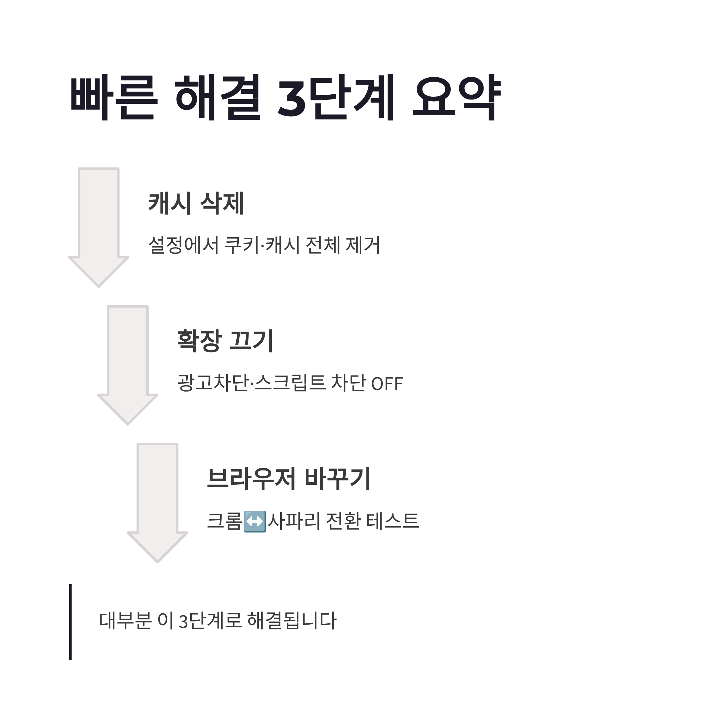 | 브라우저 캐시 삭제 | 설정 → 개인정보 → 캐시/쿠키 삭제 | 즉시 해결되는 경우 많음 |