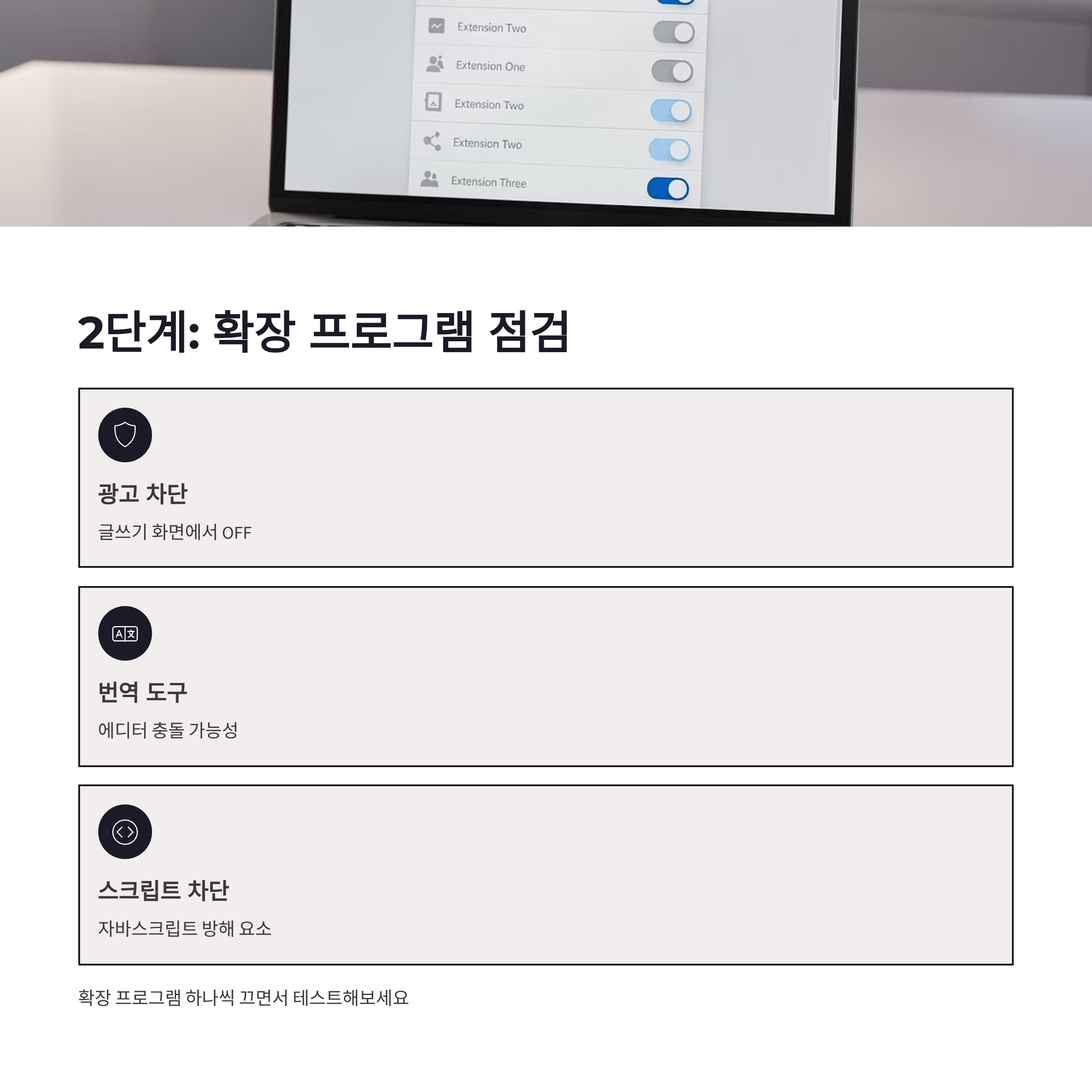 | 확장 프로그램 끄기 | 광고차단·번역·스크립트 계열 OFF | 로딩 멈춤 해소 |