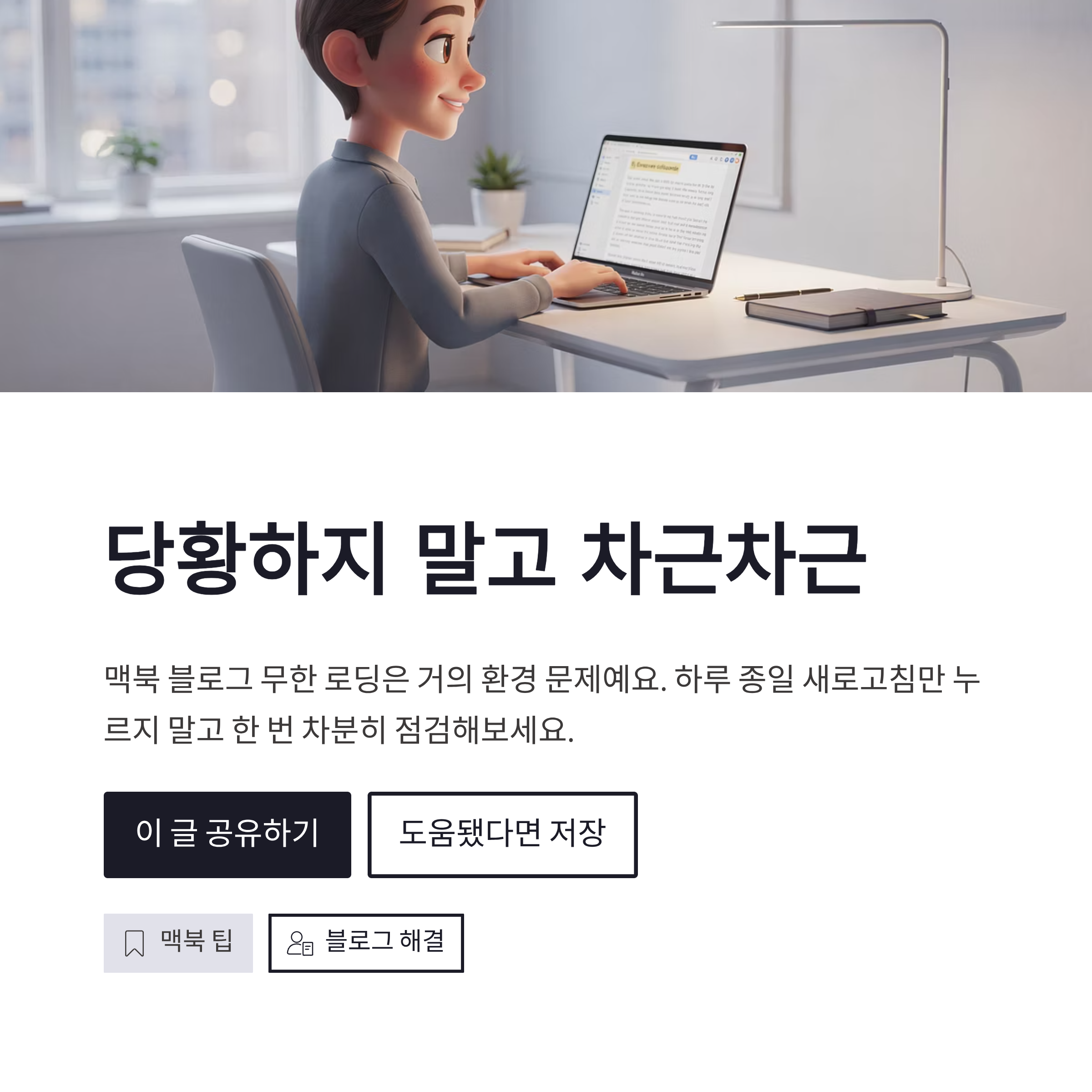 정리하면요, 맥북 블로그 무한 로딩은 거의 환경 문제였어요. 캐시 삭제 → 확장 끄기 → 브라우저 바꾸기, 이 3단계만 해도 대부분 해결됐구요. 괜히 하루 종일 새로고침만 누르지 말고, 한 번 차분히 점검해보면 생각보다 빨리 풀립니다 ㅎㅎ 맥북으로 블로그 쓰시는 분들, 이거 한 번 겪으면 진짜 기억에 남잖아요… 저만 그런 거 아니쥬?