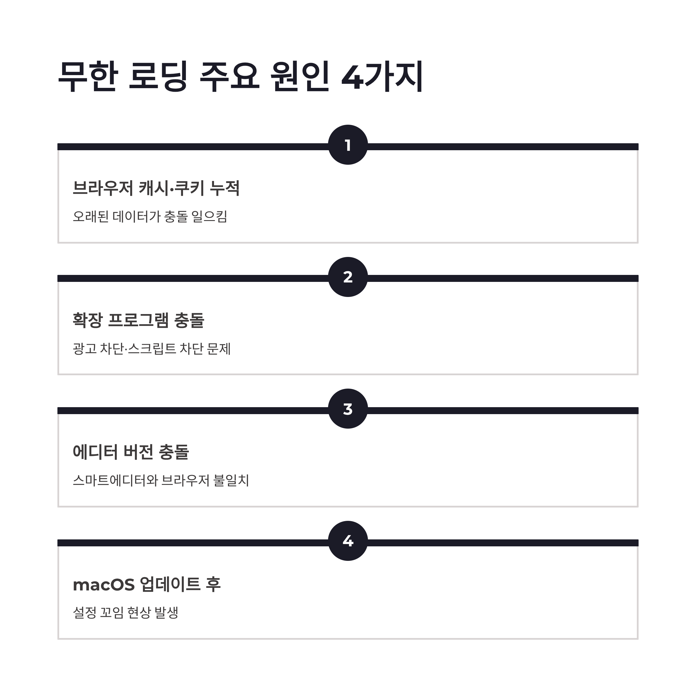 * 브라우저 캐시·쿠키 누적 * 광고 차단, 스크립트 차단 확장 프로그램 * 글쓰기 에디터(스마트에디터)와 브라우저 버전 충돌 * macOS 업데이트 직후 설정 꼬임