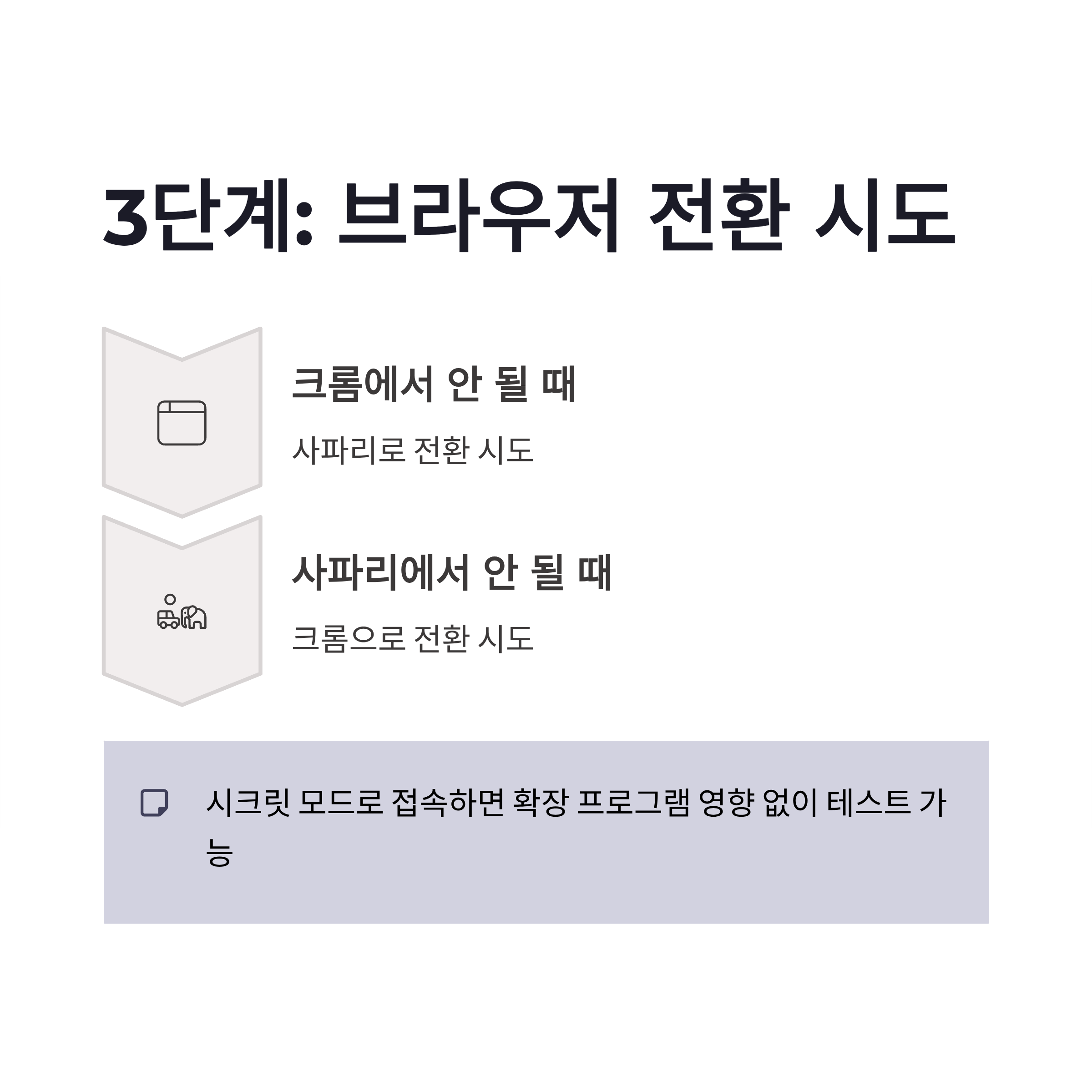 | 브라우저 변경 | 사파리 ↔ 크롬 전환 | 호환성 문제 해결 |