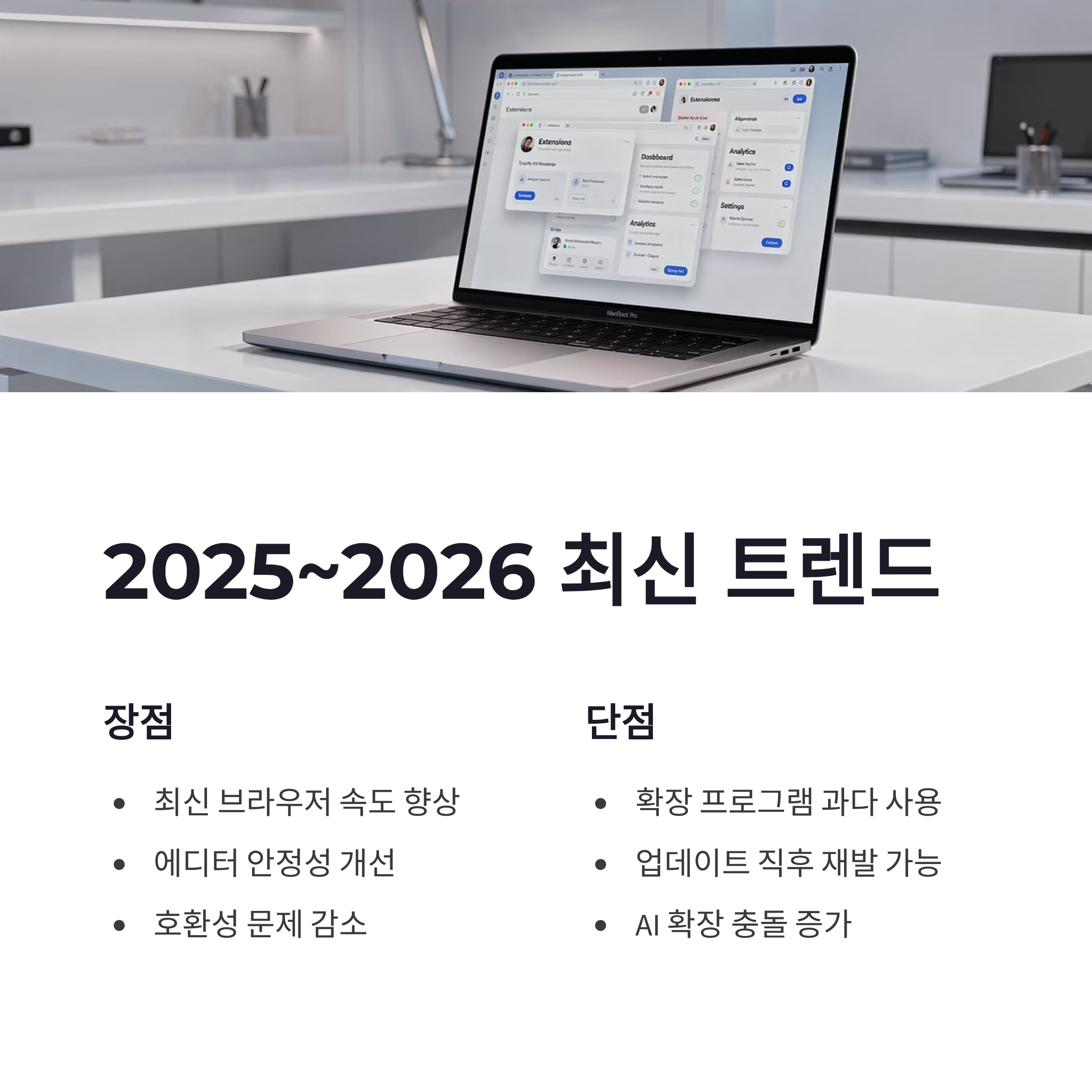 요즘 블로그 에디터가 계속 업데이트되면서, 예전보다 안정적이긴 해요. 다만 2025년 이후 확장 프로그램 과다 사용이 가장 큰 복병 같았어요. AI 요약, 광고 필터, 보안 확장… 편하긴 한데 글쓰기 화면에선 독이 되더라구요. 장점은, 최신 브라우저일수록 속도는 빠름. 단점은, 업데이트 직후 맥북 블로그 무한 로딩 재발 확률이 높다는 점… 이건 진짜 공감 ㅠㅠ
