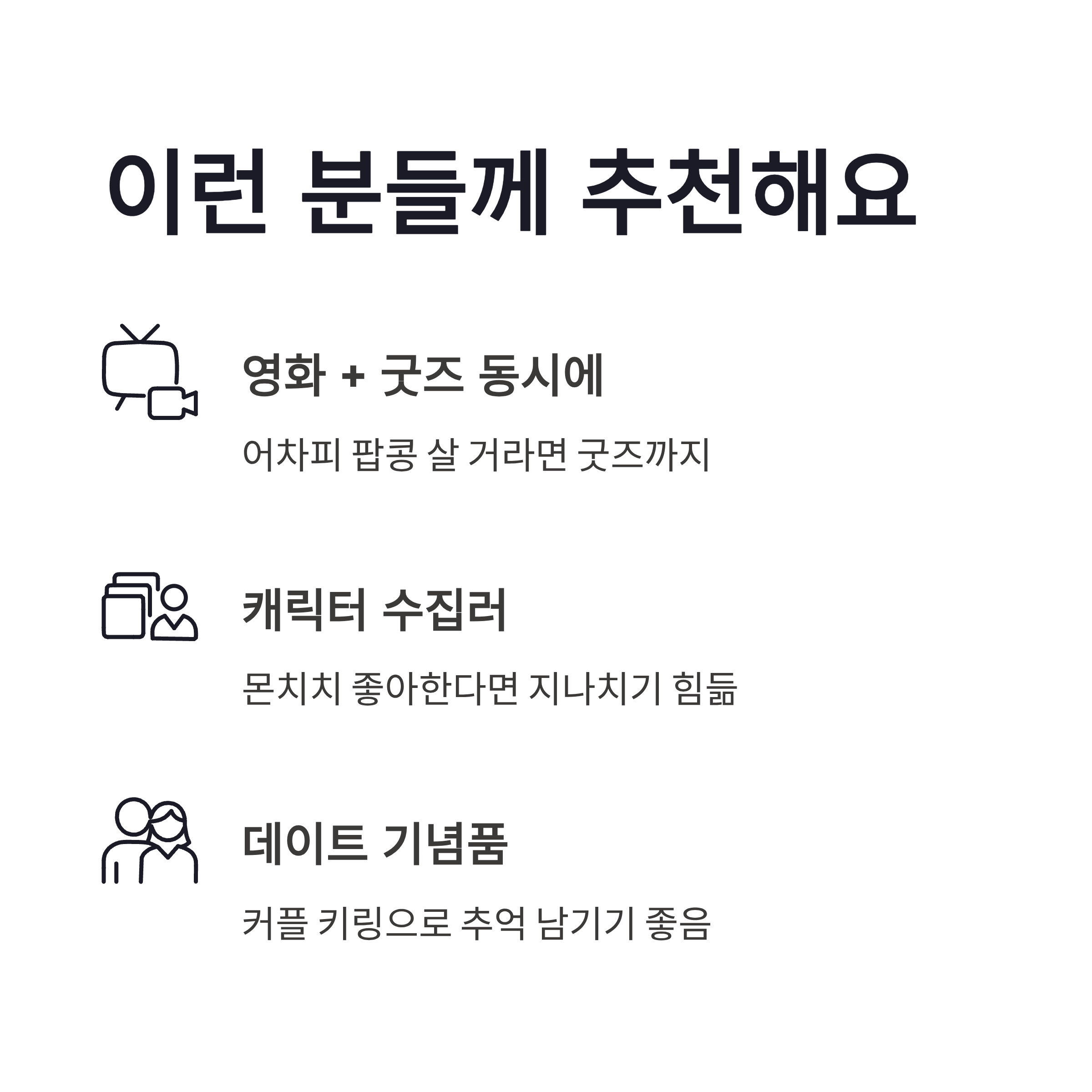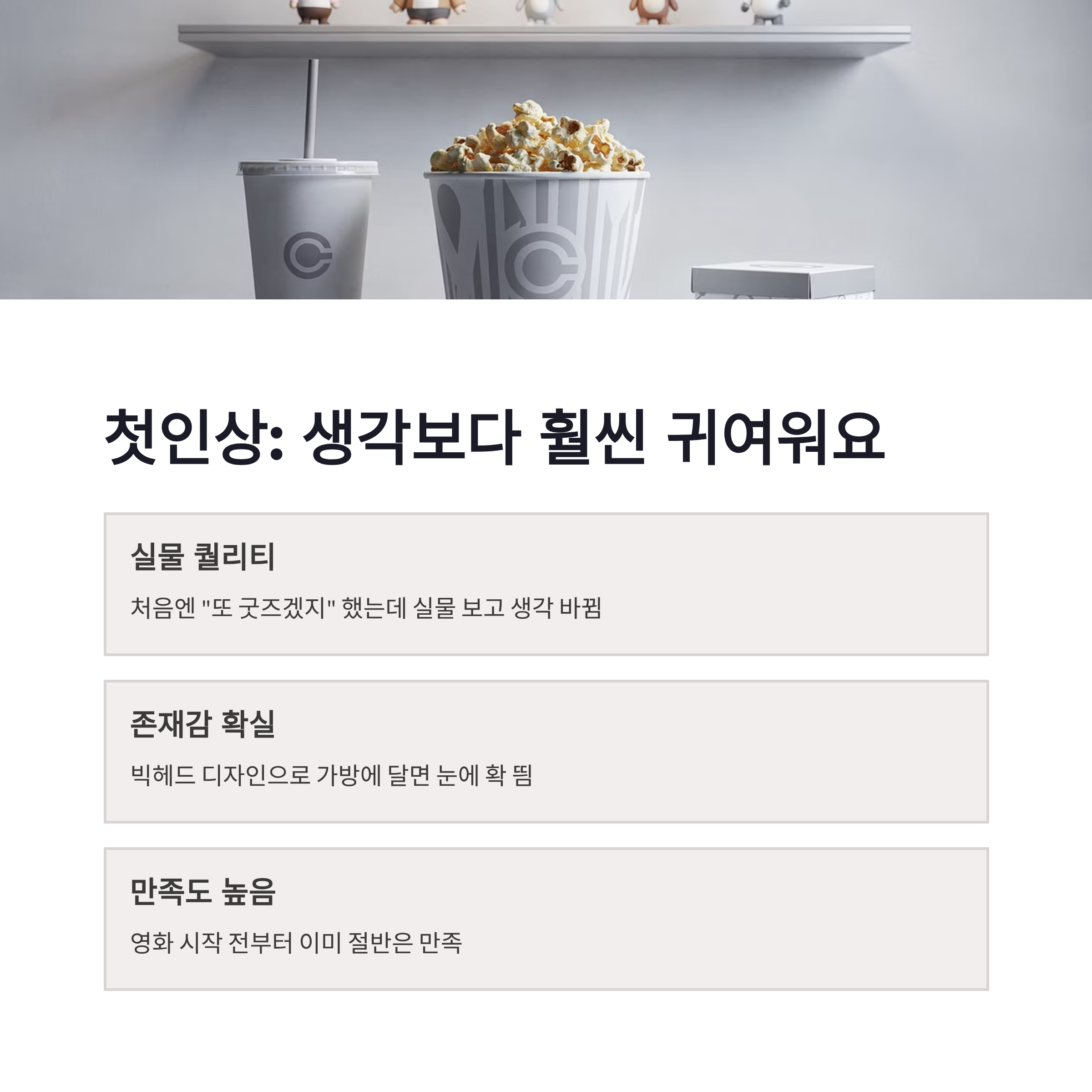 사실 가격만 보면 살짝 비싸게 느껴질 수도 있는데요, 몬치치 키링 단품으로 보면 납득되더라구요. 특히 몬치치 좋아하는 분들이라면 그냥 지나치기 힘든 구성이에요. 연관 키워드로는 메가박스 굿즈, 영화관 인형 키링 이런 것도 같이 많이 찾는 느낌이었어요.