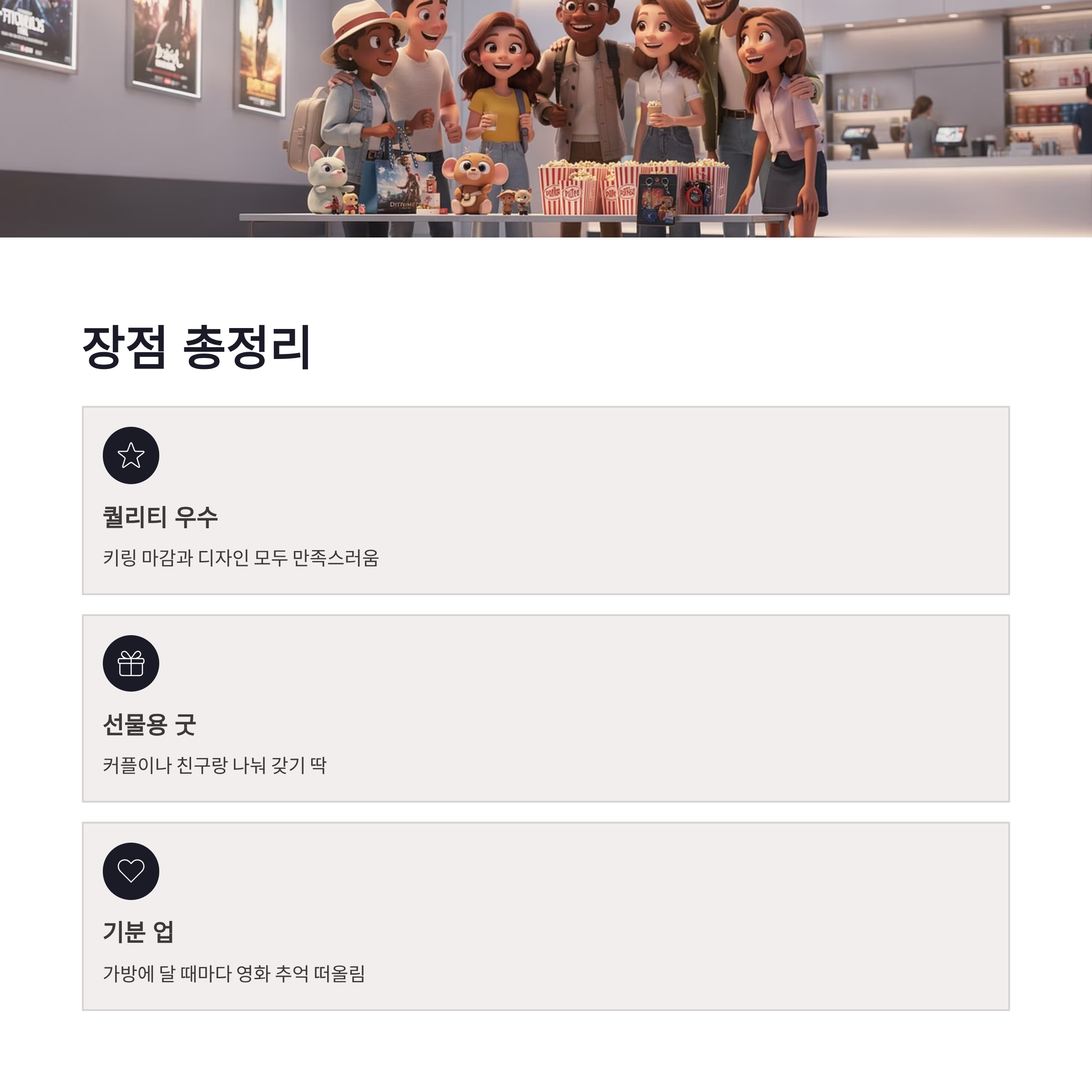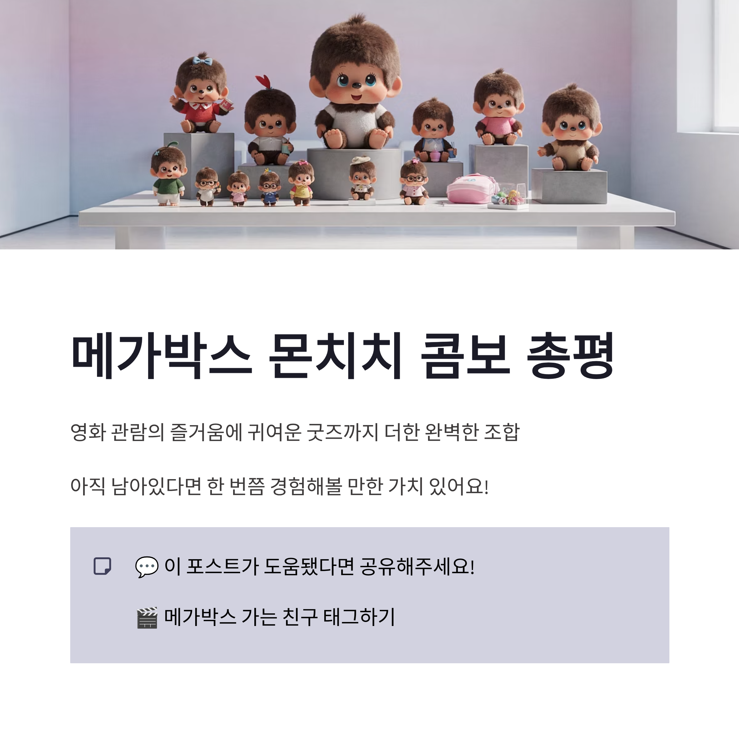 정리해보면, 메가박스 몬치치 콤보는 영화 관람 + 굿즈 수집을 동시에 잡고 싶은 분들한테 딱이에요. 저처럼 “어차피 팝콘이랑 음료 살 거라면…” 이런 생각 드는 분들이라면 만족도 높을 것 같구요. 몬치치 특유의 귀여움 때문에 기분도 괜히 좋아지고, 가방에 키링 달 때마다 영화 봤던 날이 떠오르더라구요 ㅎㅎ 메가박스 몬치치 콤보, 아직 남아 있다면 한 번쯤 경험해봐도 괜찮지 않겠쥬?