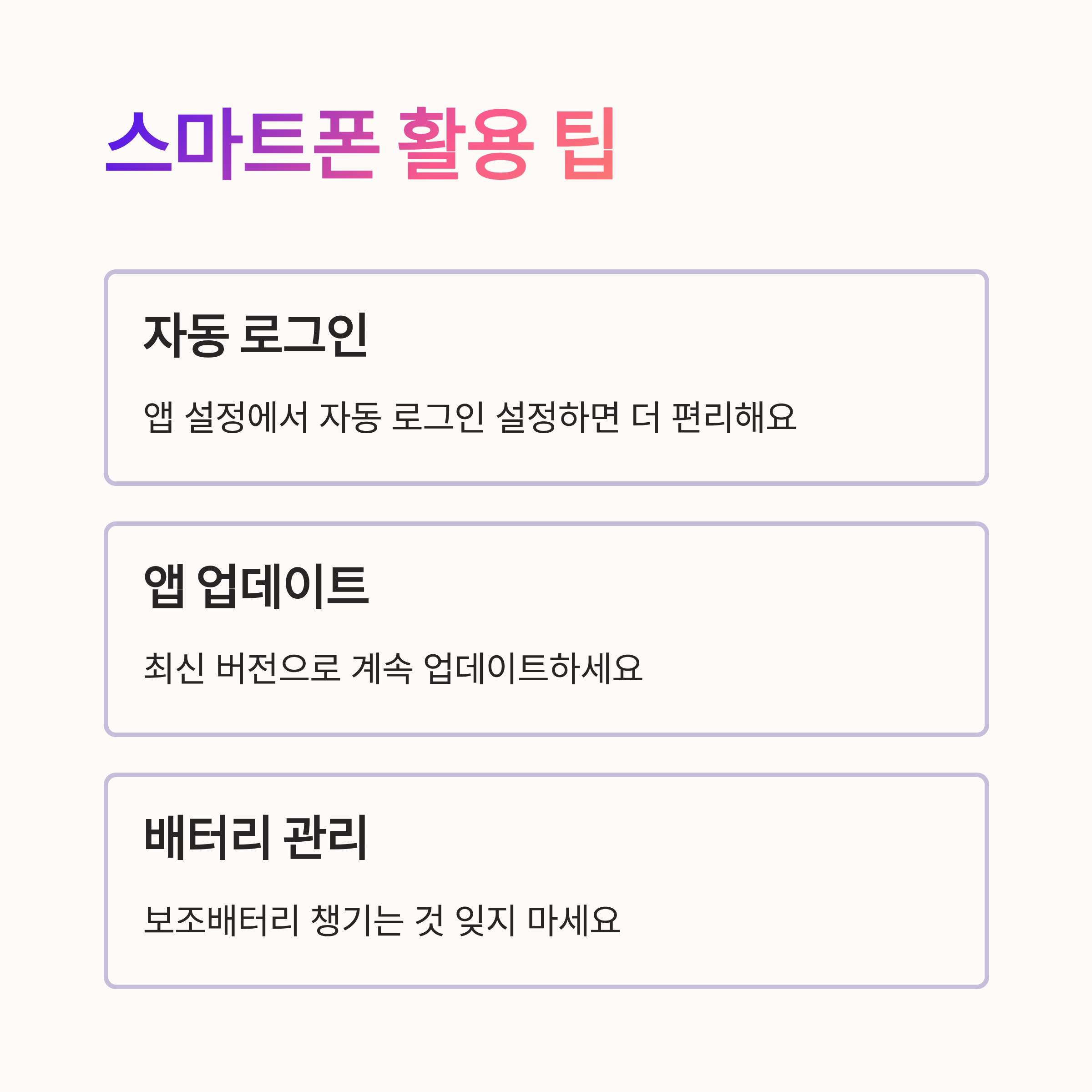 스마트폰 활용 팁: 앱 내 설정에서 자동 로그인 설정해 두면 더 편하게 쓸 수 있어요.