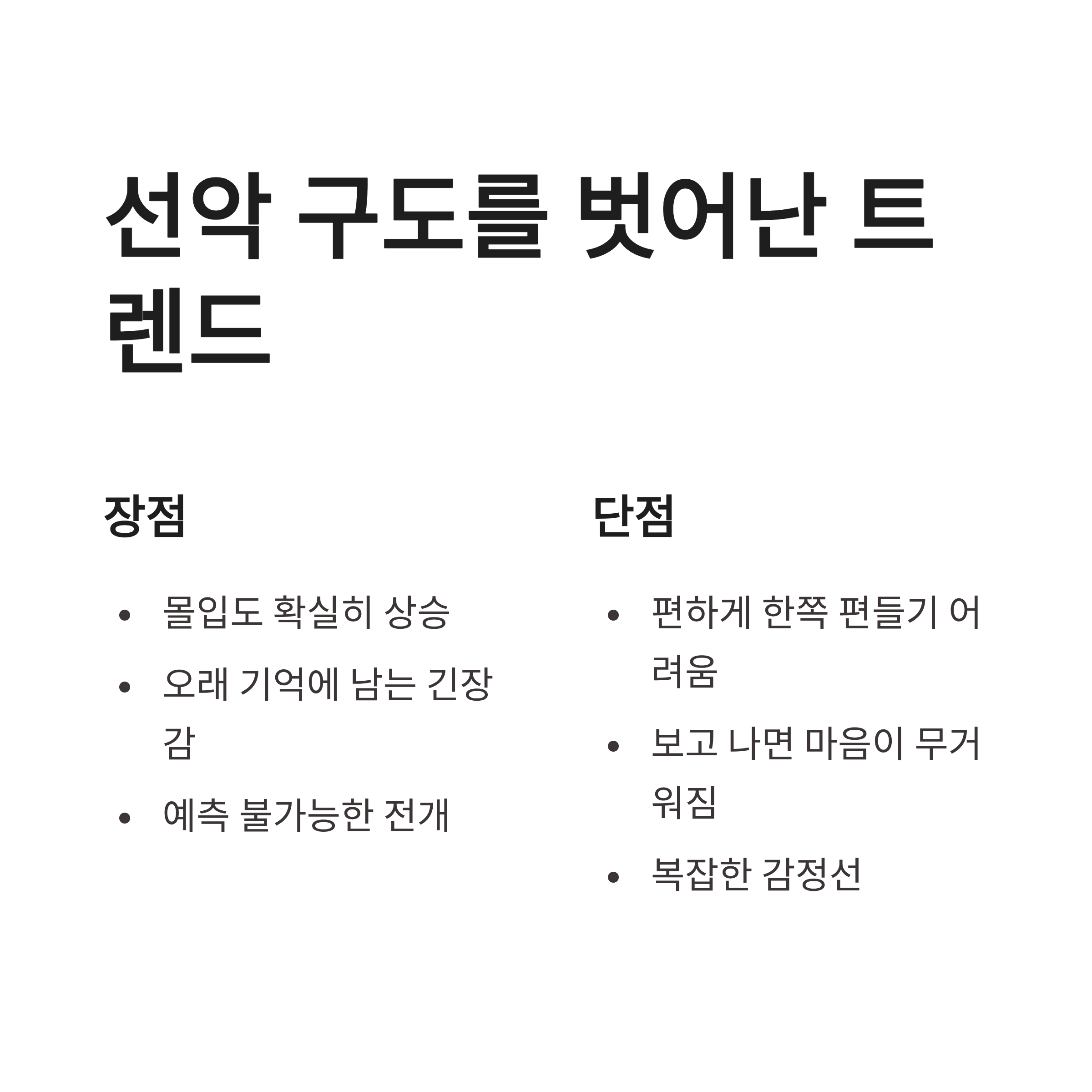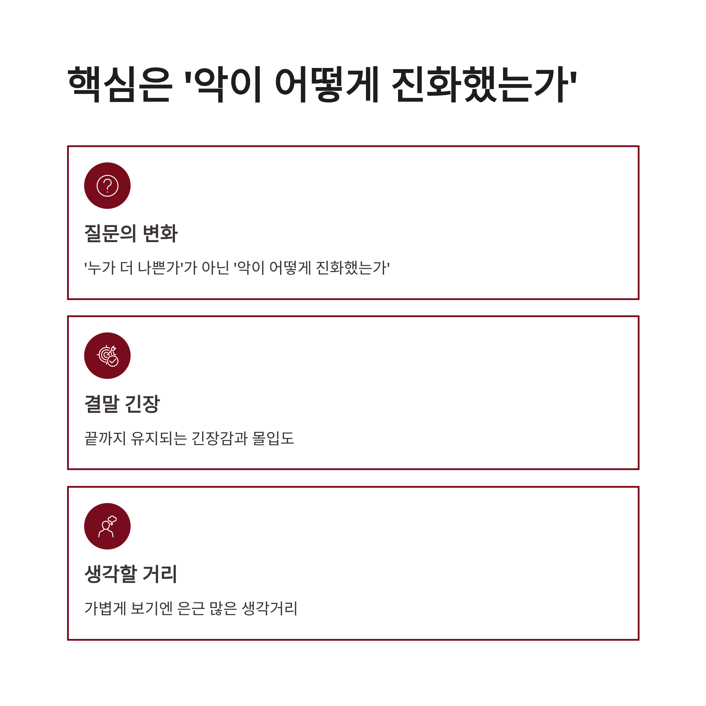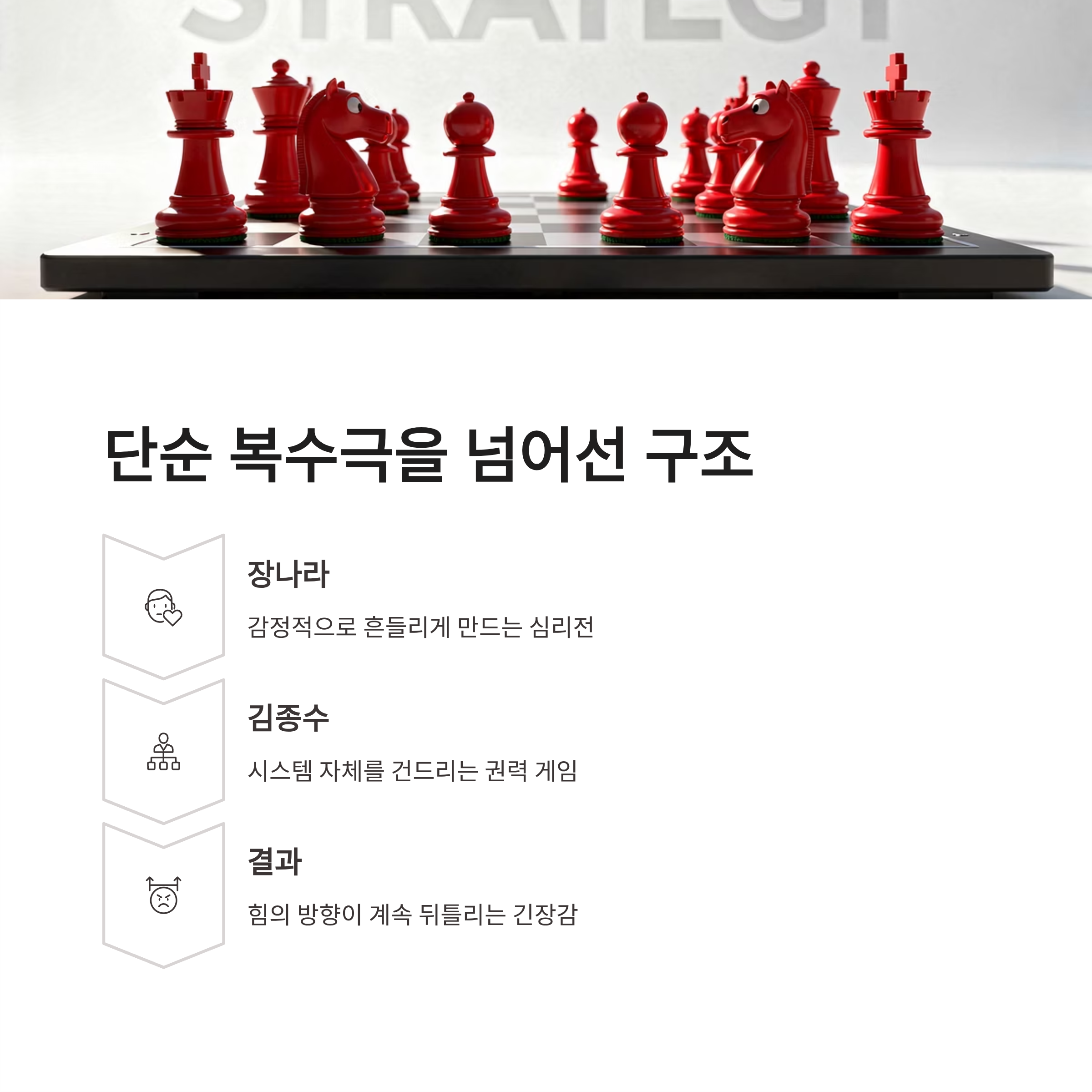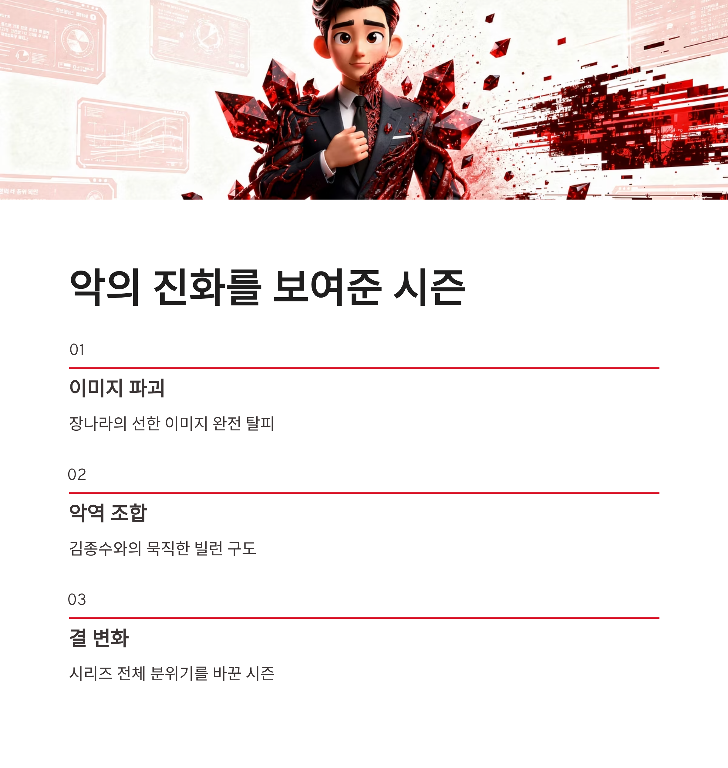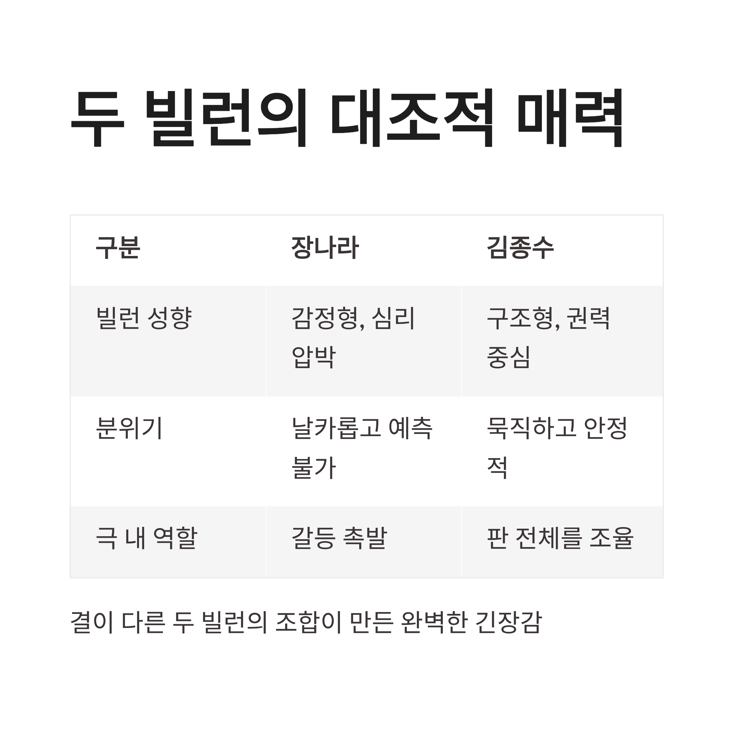 | 빌런 성향 | 감정형, 심리 압박 | 구조형, 권력 중심 |