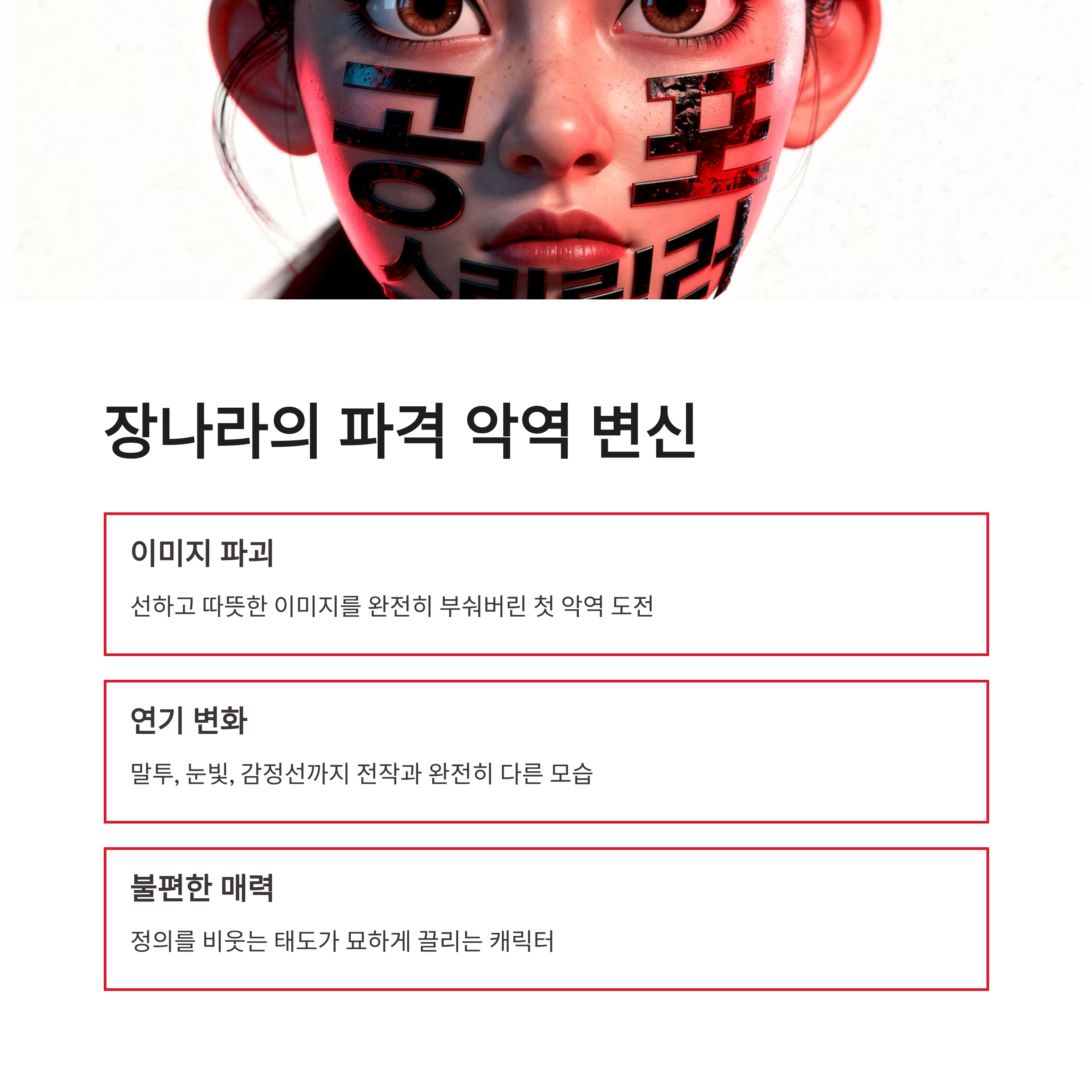 모범택시 시즌3 소식 처음 들었을 때 제일 먼저 눈에 들어온 이름이 바로 장나라였어요. 솔직히 말하면 “어… 장나라가?” 이런 반응부터 나왔구요 ㅎㅎ 그만큼 선하고 따뜻한 이미지가 강했잖아요. 그런데 모범택시 시즌3에서는 그 틀을 아예 부숴버린 느낌이더라구요. 말투부터 눈빛, 감정선까지 전작에서 보던 모습이 거의 안 남아있습니다. 첫 악역 도전이라는 타이틀이 괜히 붙은 게 아니었어요. 초반부 몇 장면만 봐도 ‘아 이건 진짜 작정했구나’ 싶었고, 정의를 비웃는 태도가 꽤 불편하면서도 묘하게 끌리더라구요. 모범택시 시즌3의 분위기를 한 단계 더 차갑게 만드는 역할, 딱 그 중심에 장나라가 서 있는 느낌이었어요.