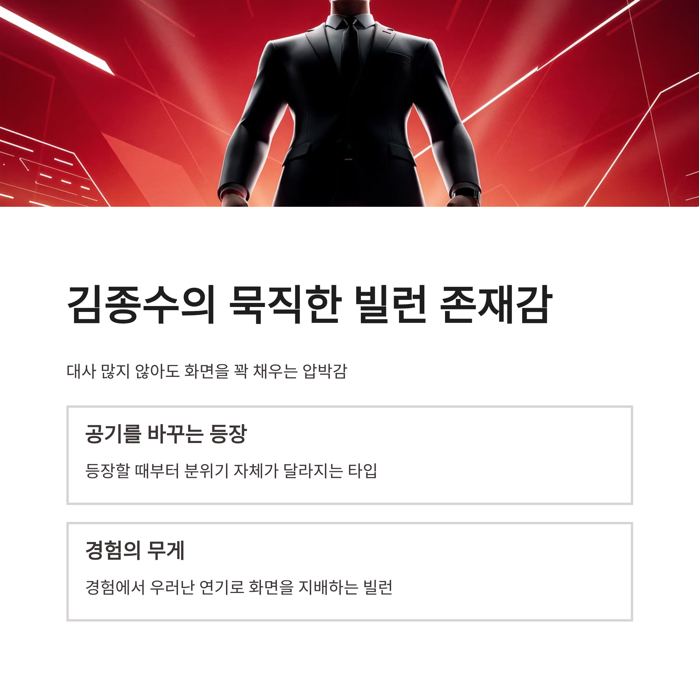 장나라가 날카로운 칼이라면, 모범택시 시즌3에서 김종수는 묵직한 바위 같은 존재였어요. 등장할 때부터 공기 자체가 달라지는 타입이랄까… 대사 많지 않은데도 화면을 꽉 채우는 압박감이 있더라구요. 개인적으로 이런 빌런 너무 무섭습니다 ㅠㅠ 경험에서 우러난 연기라는 게 이런 거구나 싶었구요. 모범택시 시즌3 속 두 빌런의 결이 다른 점도 흥미로웠어요.