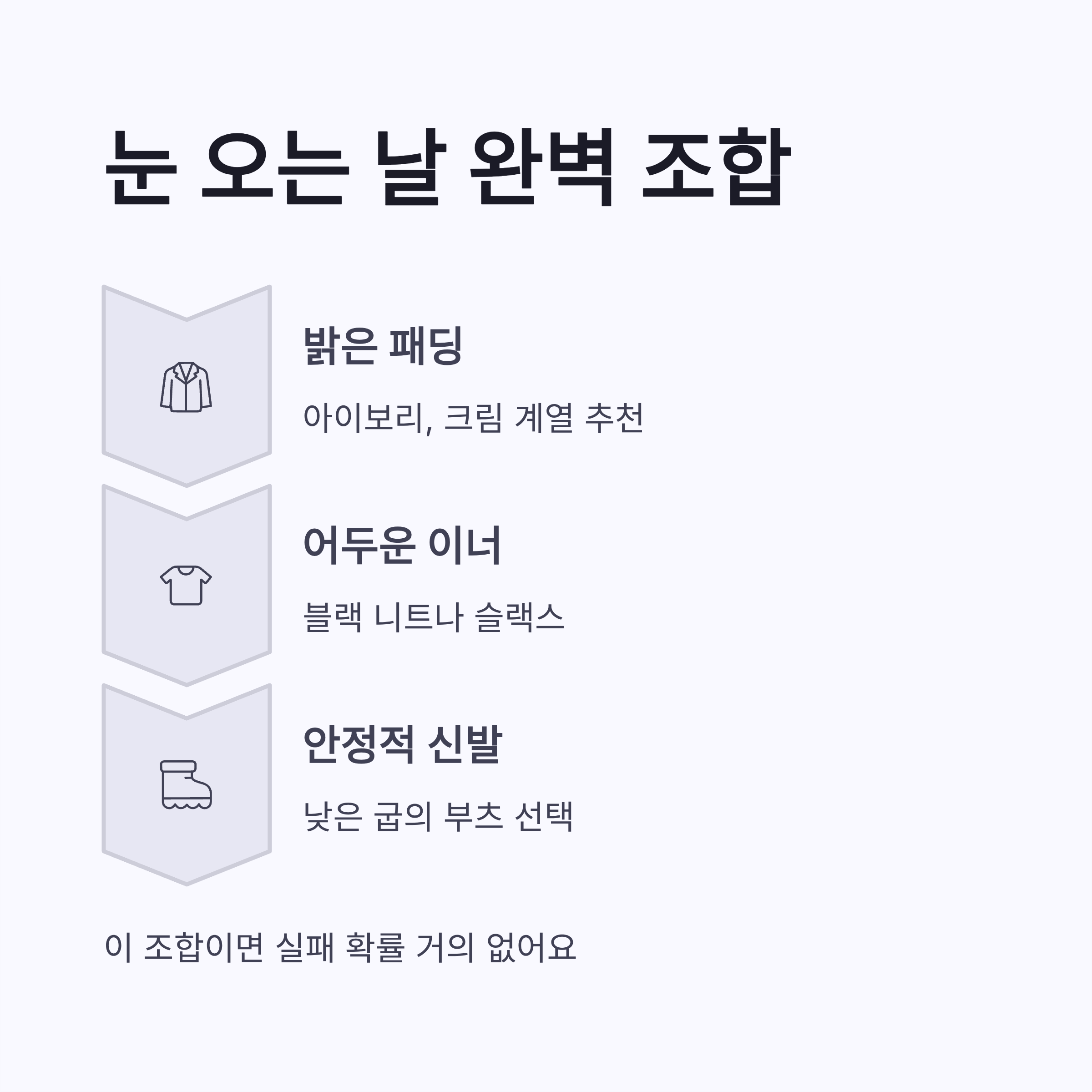 | 부츠 | 굽 낮은 것 | 눈길 안정감 |