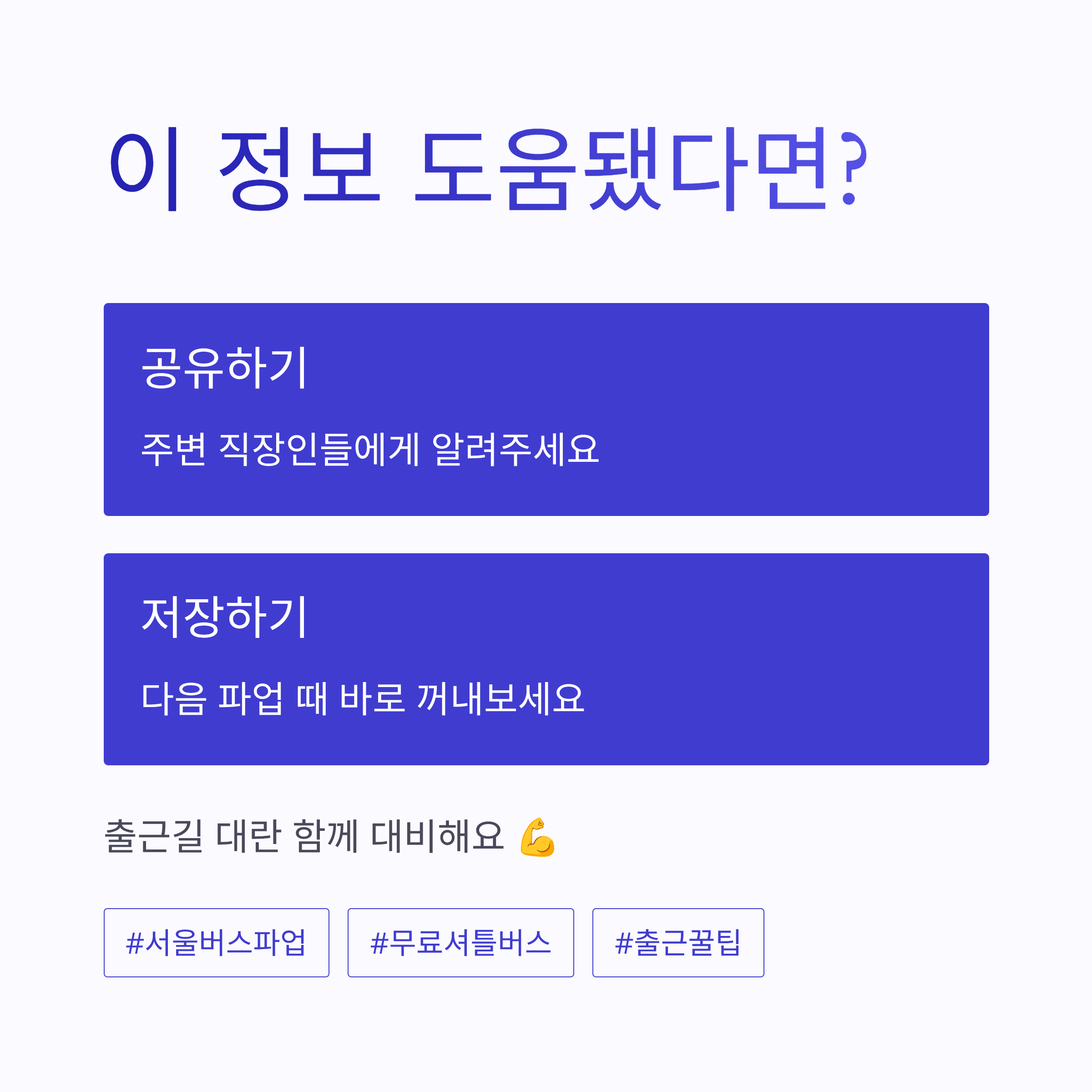 막상 겪어보니 “아… 이래서 다들 미리 보라고 하는구나” 싶었습니다 ㅎㅎ 혹시 다음 서울 버스파업 때 대비해서 내 지역 셔틀버스 노선 정리글도 필요하시면, 그거도 한 번에 정리해드릴게요.
