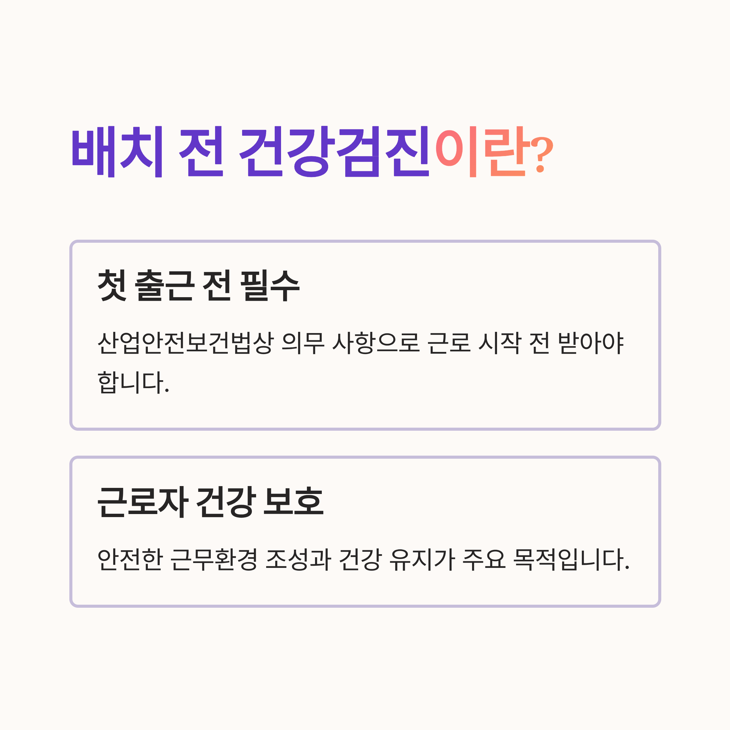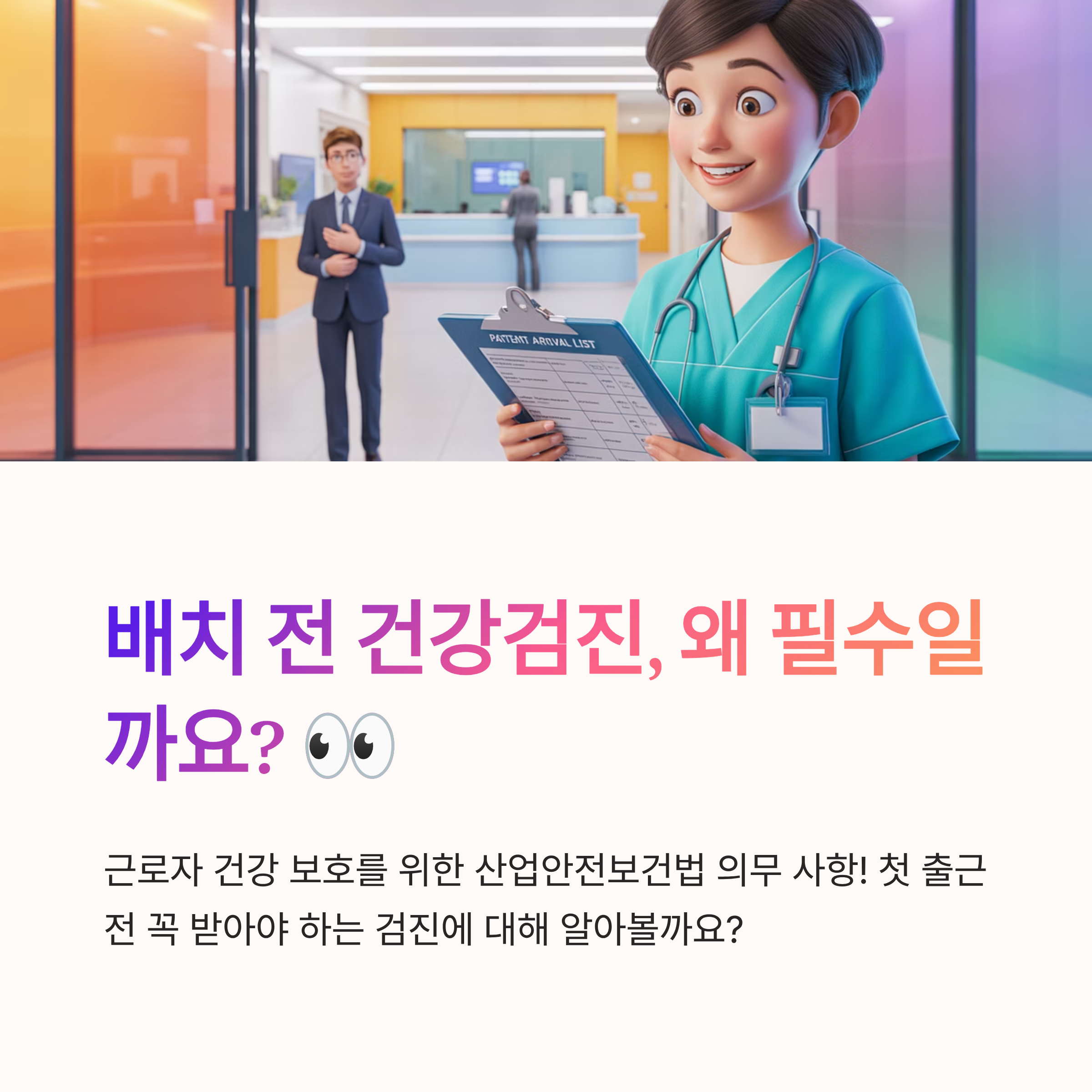 안녕하세용! 오늘은 산업안전보건법에 따라 의무적으로 받아야 하는 "배치 전 건강검진"에 대해 이야기해볼까 해요. 어쩔 땐 일찍 일어나기보다 더 버거운 일이 바로 건강검진이죠! 😅 동의하시죠? 하지만 알고 보면 근로자 건강 보호 씬에서 빠질 수 없는 필수 요소랍니다. 너무 걱정하지 마셈. 요거 잘 읽고 다 이해하고 나면 별거 아닌 게 되실 겁니다! 준비됐죠? 고고!(물론 여기서 잠깐, 탐험 준비 완료ㅎ)