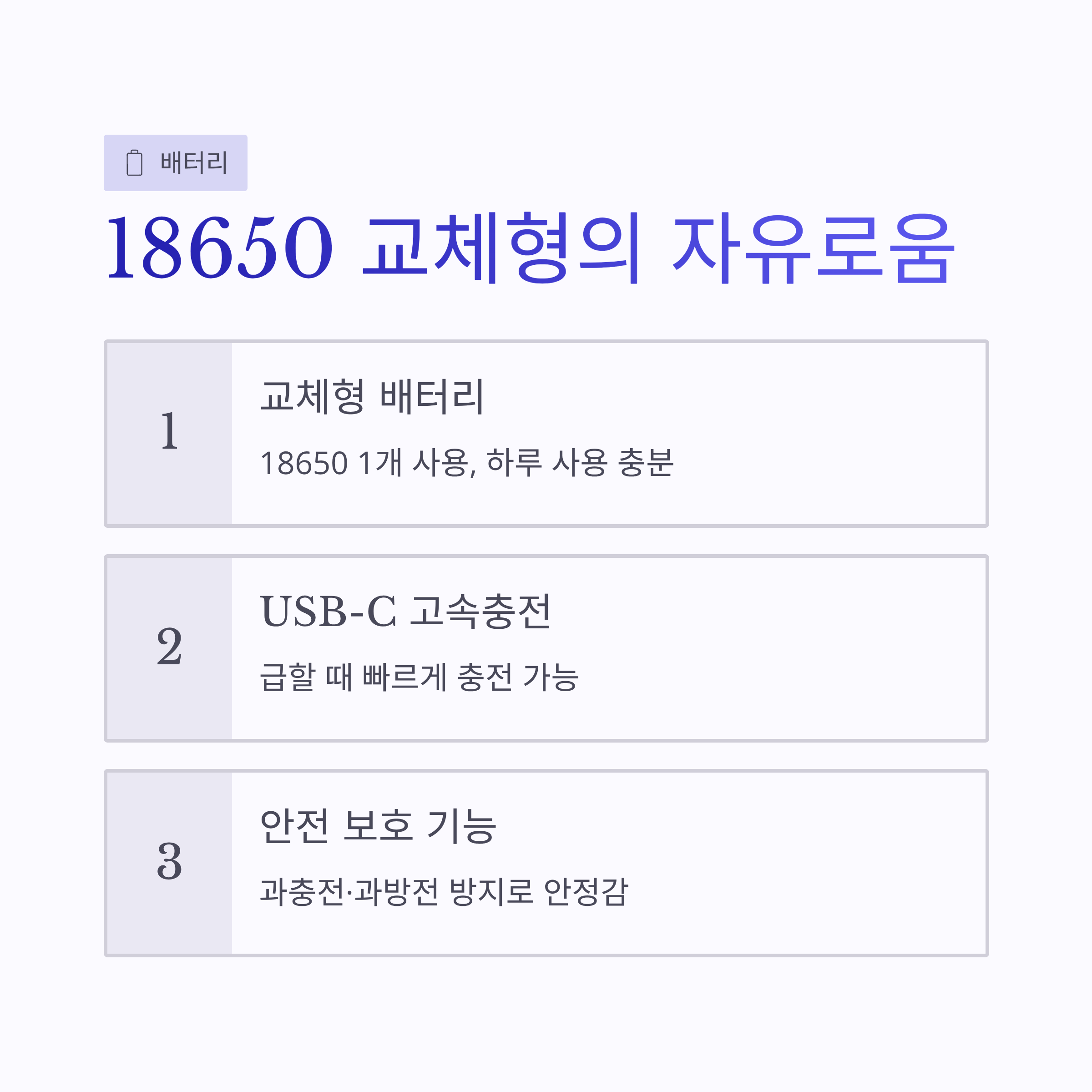 | 배터리 | 18650 교체형 1개 | 하루 사용 충분 |