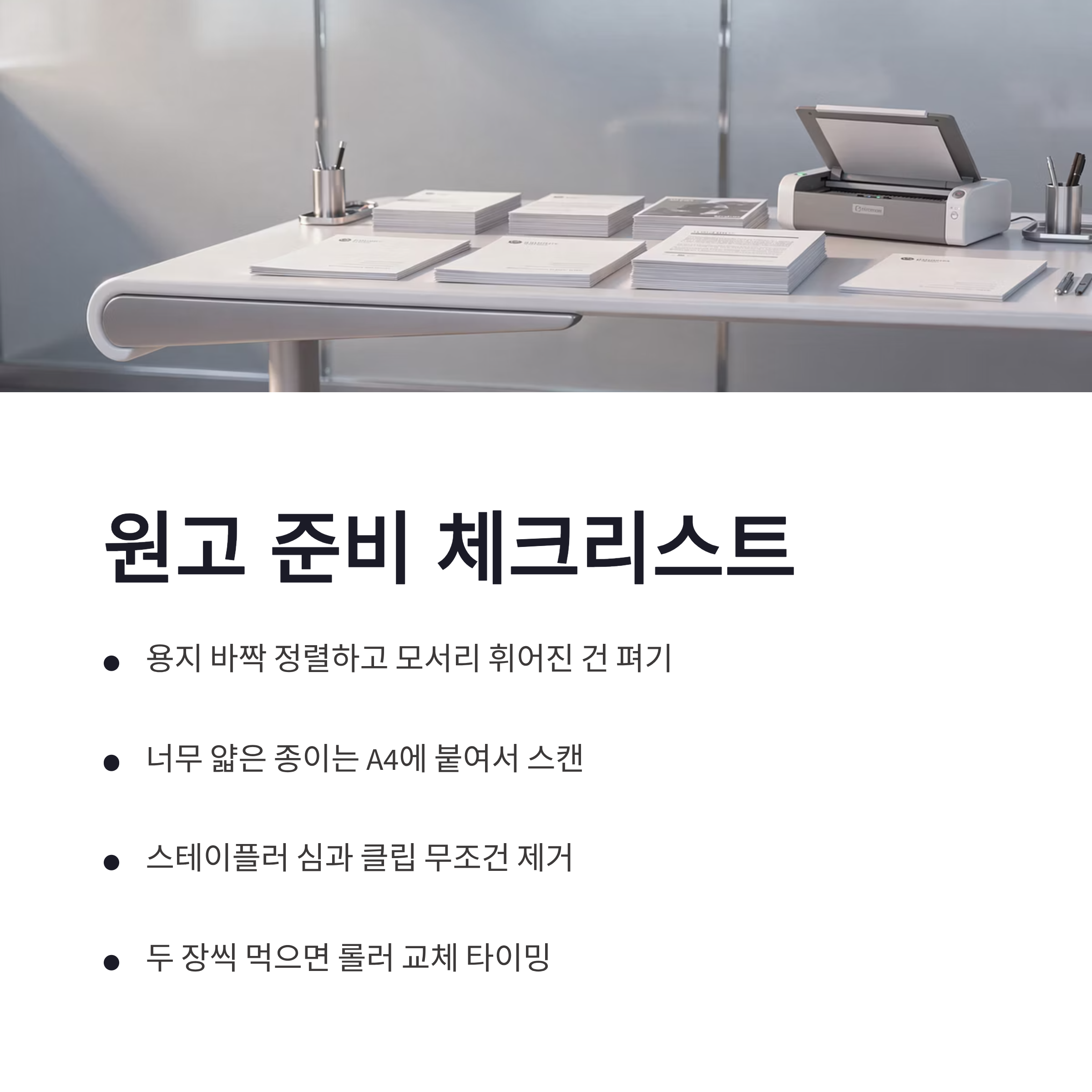 * 용지는 꼭 ‘바짝’ 정렬하고, 모서리 휘어진 건 펴기 * 너무 얇은 종이(영수증/전단)면 A4에 붙여서 스캔 * 스테이플러 심/클립은 무조건 제거 * ADF 가이드(폭 조절)를 종이에 딱 맞게 조이기
