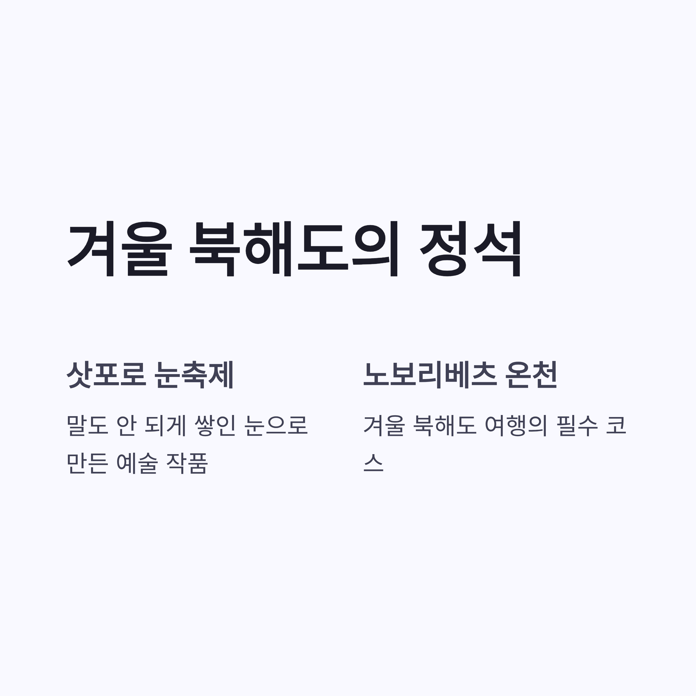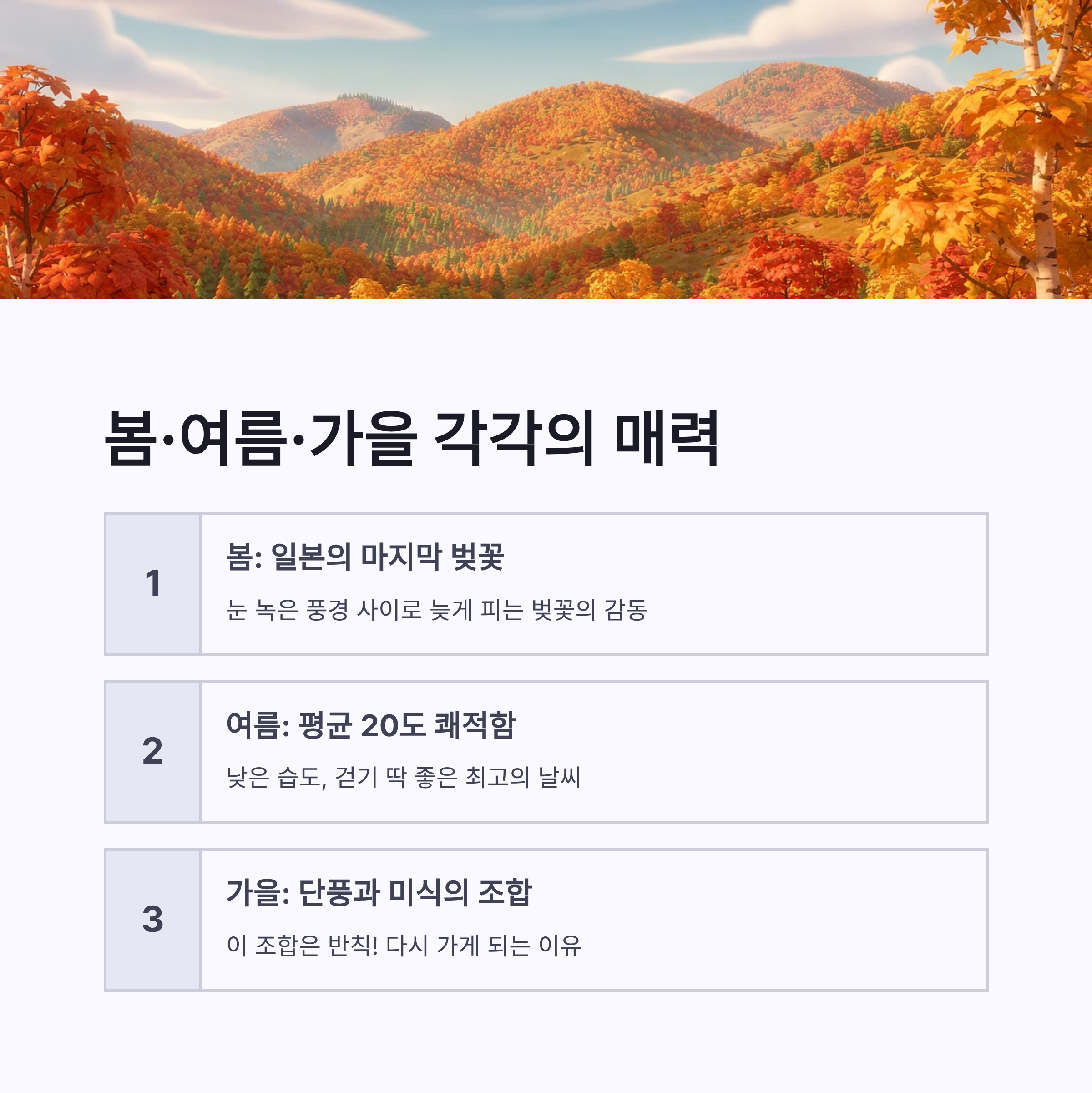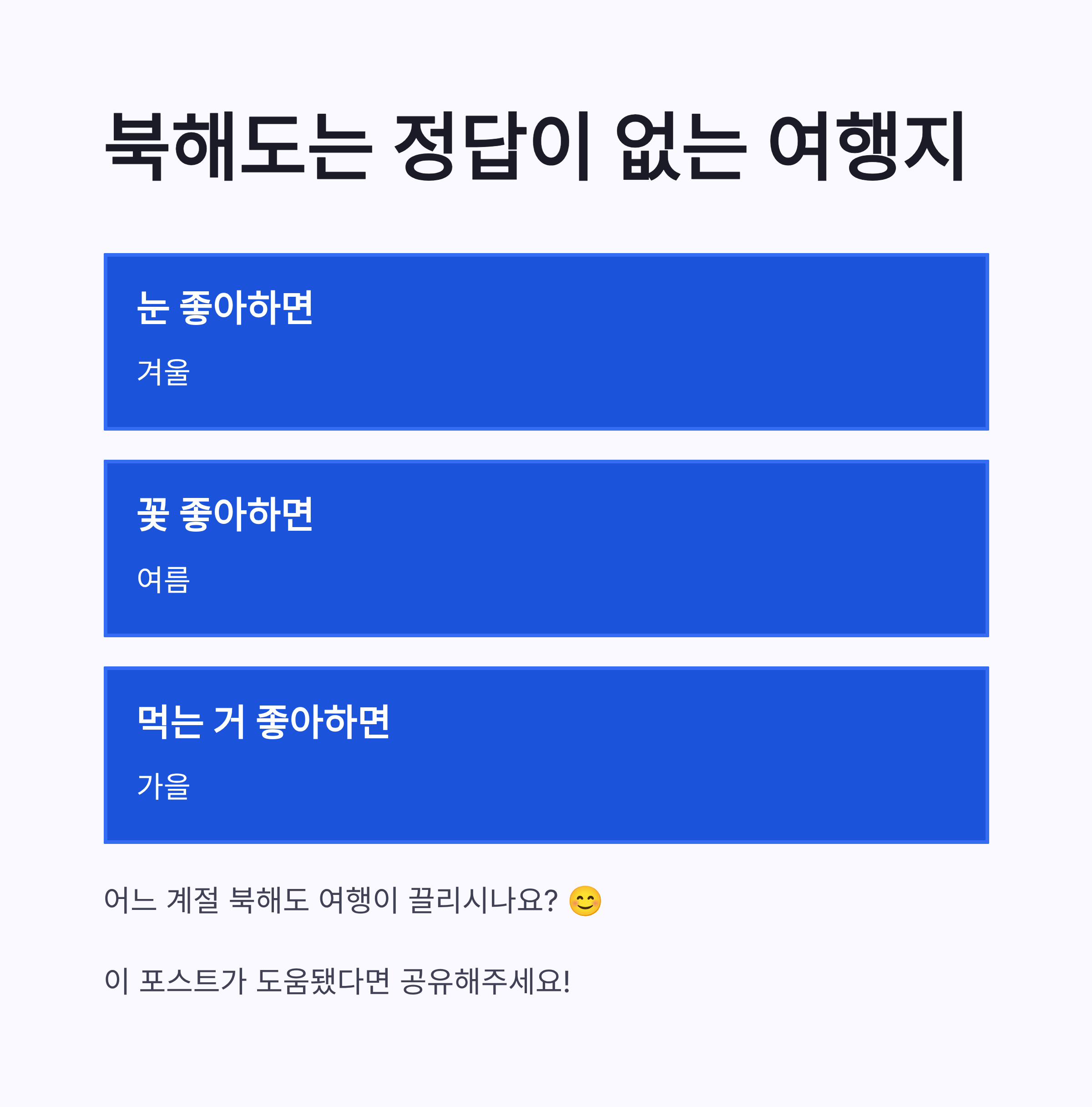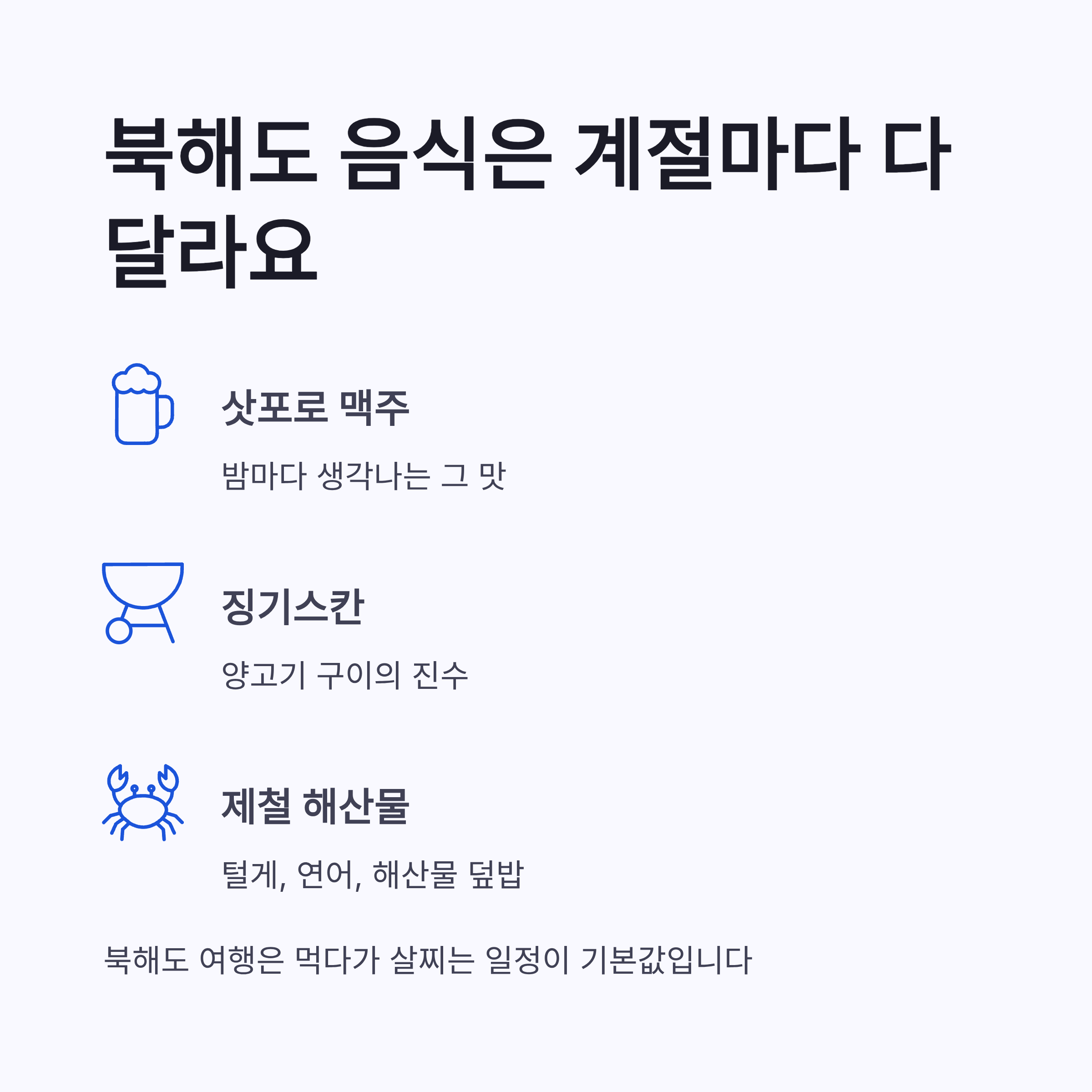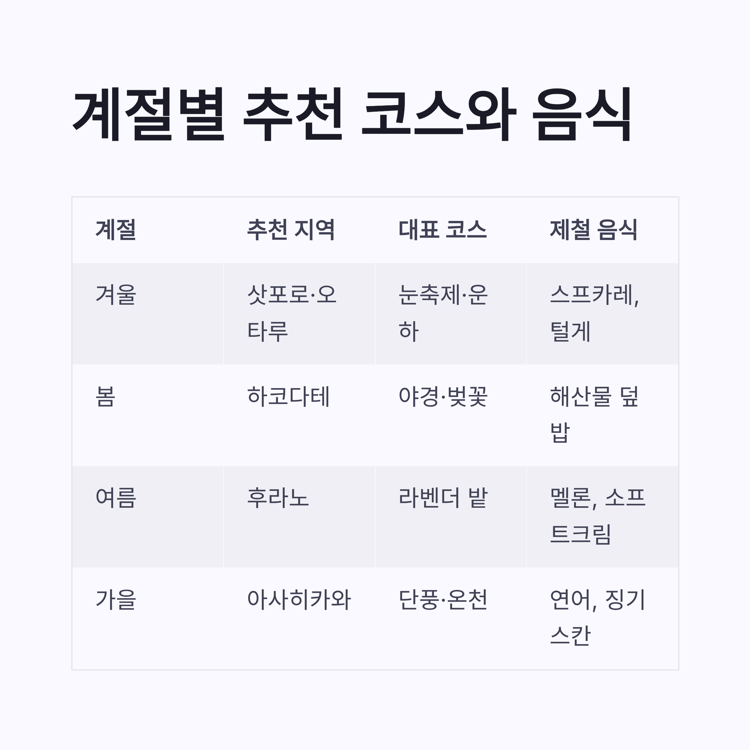 | 계절 | 추천 지역 | 대표 코스 | 제철 음식 | | -- | ------- | ------ | --------- | | 겨울 | 삿포로·오타루 | 눈축제·운하 | 스프카레, 털게 | | 봄 | 하코다테 | 야경·벚꽃 | 해산물 덮밥 | | 여름 | 후라노 | 라벤더 밭 | 멜론, 소프트크림 | | 가을 | 아사히카와 | 단풍·온천 | 연어, 징기스칸 |