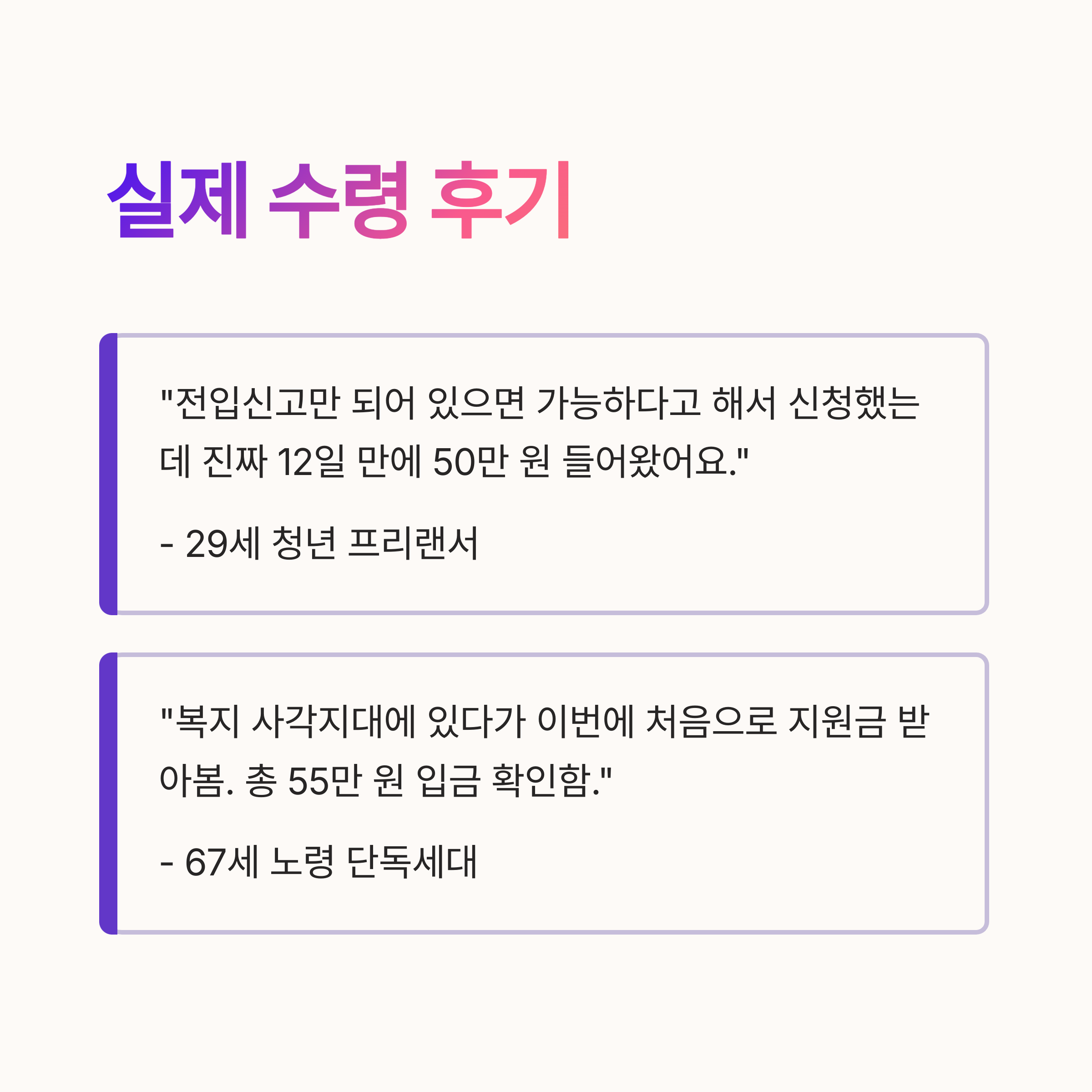 → "복지 사각지대에 있다가 이번에 처음으로 지원금 받아봄. 5만 원 추가 포함돼서 총 55만 원 입금 확인함."