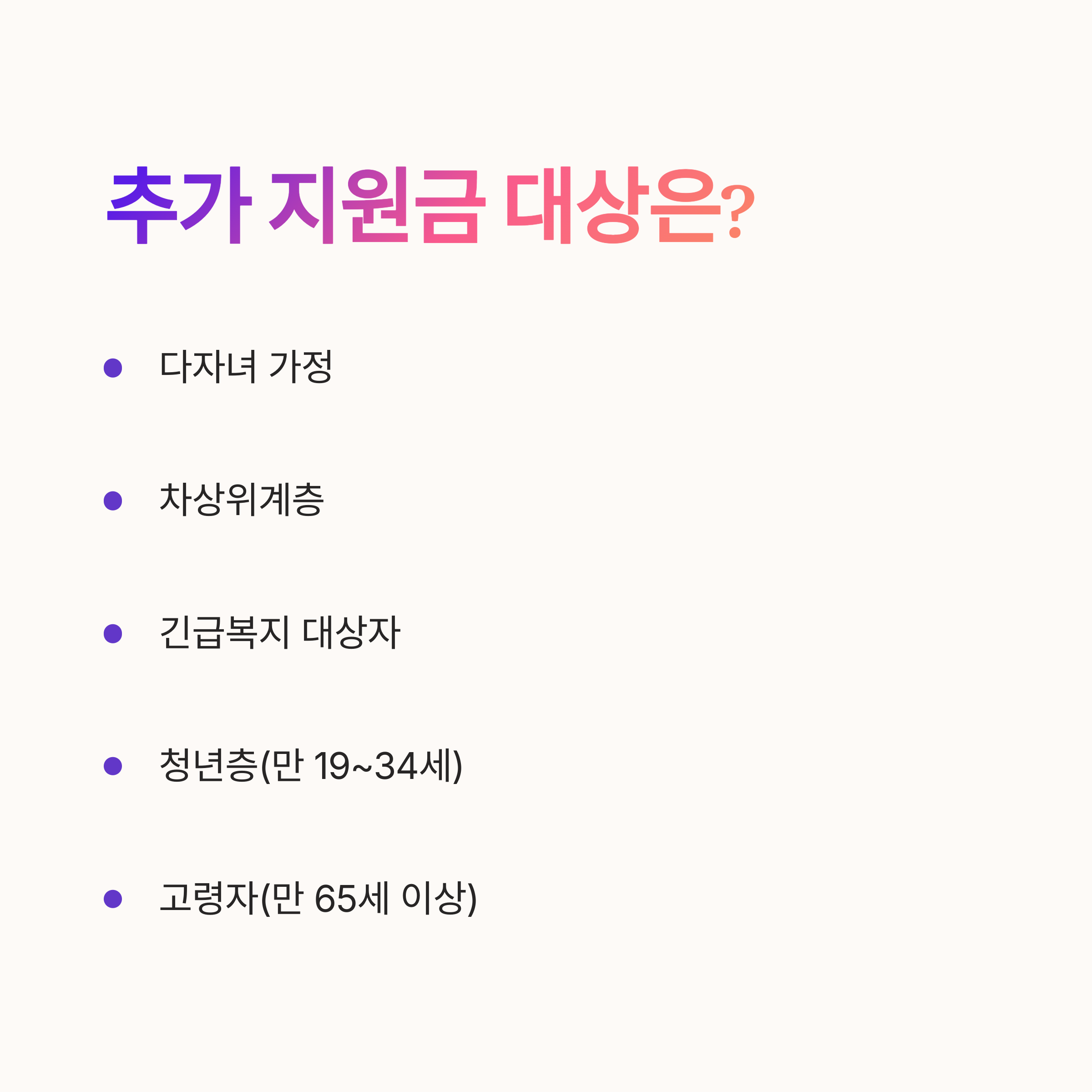 | 추가 조건 예시 | 다자녀 가정, 차상위계층, 긴급복지 대상자, 청년층(만 19~34세), 고령자(만 65세 이상) |