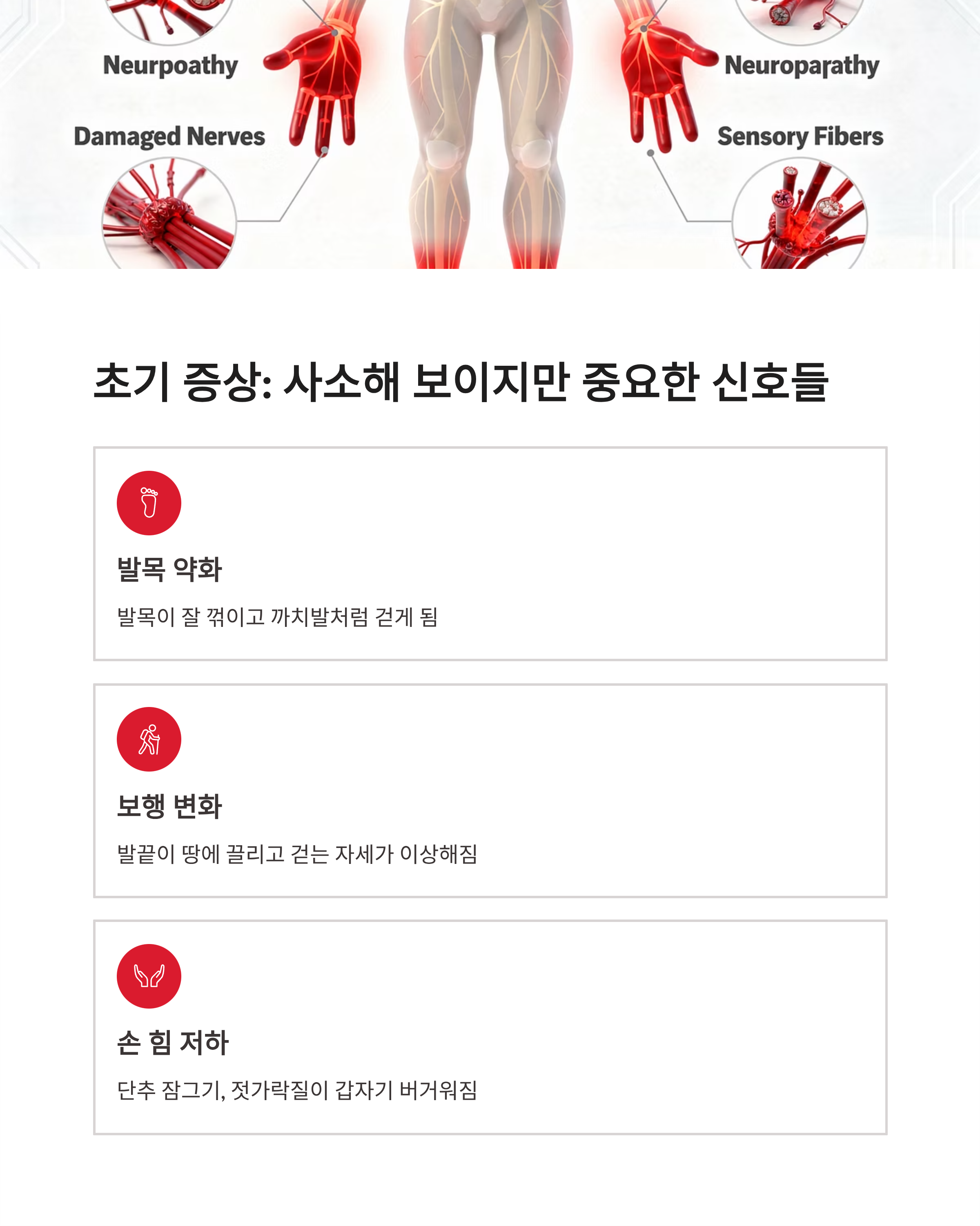 처음엔 진짜 별거 아닌 줄 알았어요. 발이 자주 걸리고, 계단 내려갈 때 유독 발끝이 땅에 끌리는 느낌? 그냥 운동 부족인가 했는데요. 알고 보니 이런 변화가 사르코마리투스병 초기 신호일 수 있다고 하더라구요. 이 병은 말초신경이 점점 손상되면서 발부터 약해지는 특징이 있어요. 그래서 발목이 잘 꺾이고, 까치발처럼 걷게 되거나 보행 자세가 이상해지기도 합니다. 손도 예외는 아니라서 단추 잠그기, 젓가락질이 갑자기 버거워지는 느낌이 들기도 하구요. 통증은 크지 않은데 힘이 빠지는 게 핵심이라서 더 헷갈리기 쉬웠어요. 저도 “설마?” 했는데, 이런 사소한 변화가 쌓이는 게 사르코마리투스병의 시작일 수 있겠더라구요.