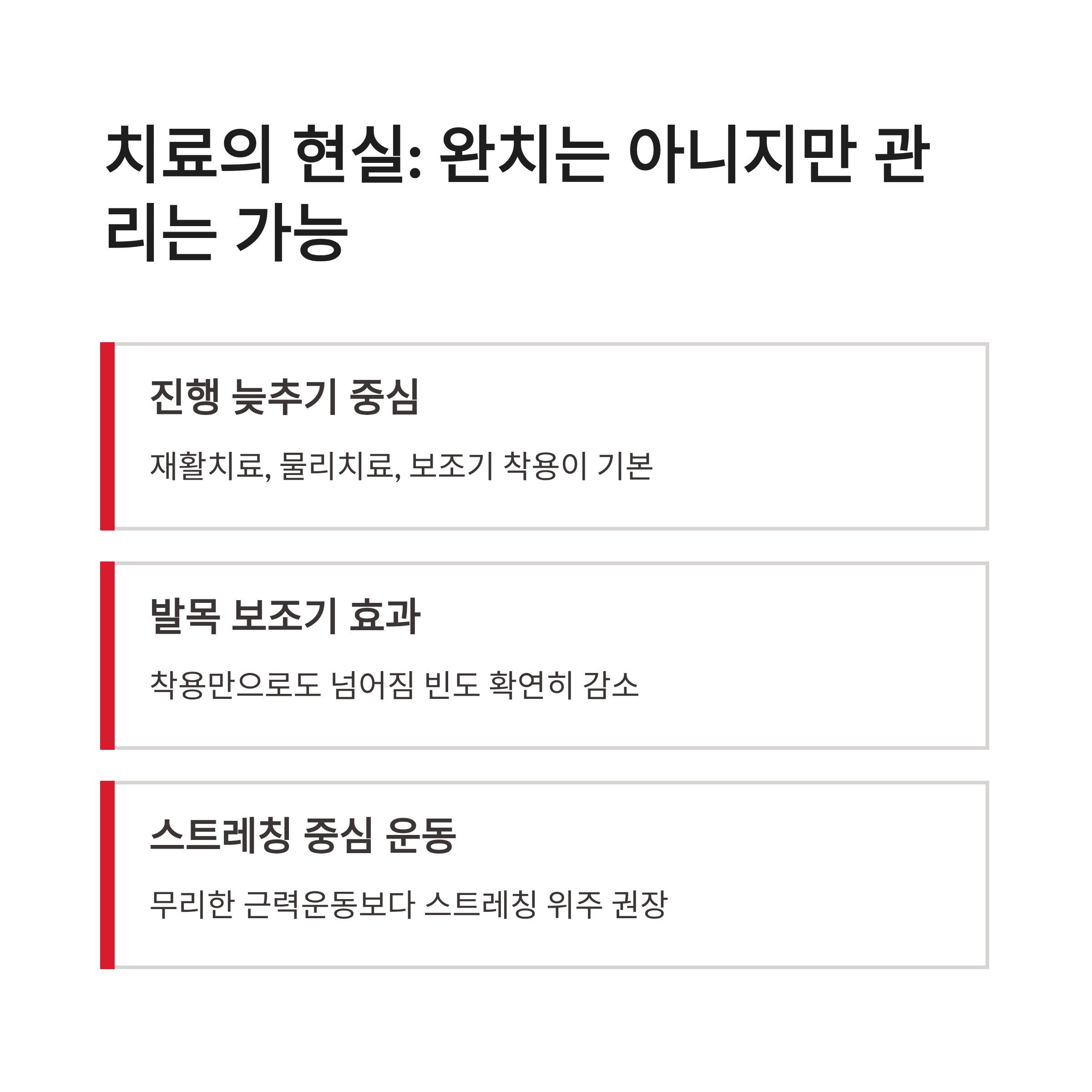 솔직히 말하면 완치 치료는 아직 없어요. 이 말 듣고 좀 멍해지긴 했는데요ㅠㅠ 대신 사르코마리투스병 치료는 진행을 늦추는 쪽에 초점이 맞춰져 있어요. 재활치료, 물리치료, 보조기 착용이 기본이고요. 최근엔 발목 보조기만 잘 써도 넘어짐 빈도가 확 줄더라구요. 장점은 일상 유지가 가능하다는 점, 단점은 꾸준함이 필수라는 점입니다. 운동도 무리한 근력운동보단 스트레칭 위주가 좋아요. 2025년 신경과 학회 자료 보면, 꾸준한 관리 시 보행 기능 유지 기간이 평균 5~10년 이상 늘어났다고 하더라구요. 이 부분은 진짜 희망 포인트였어요.