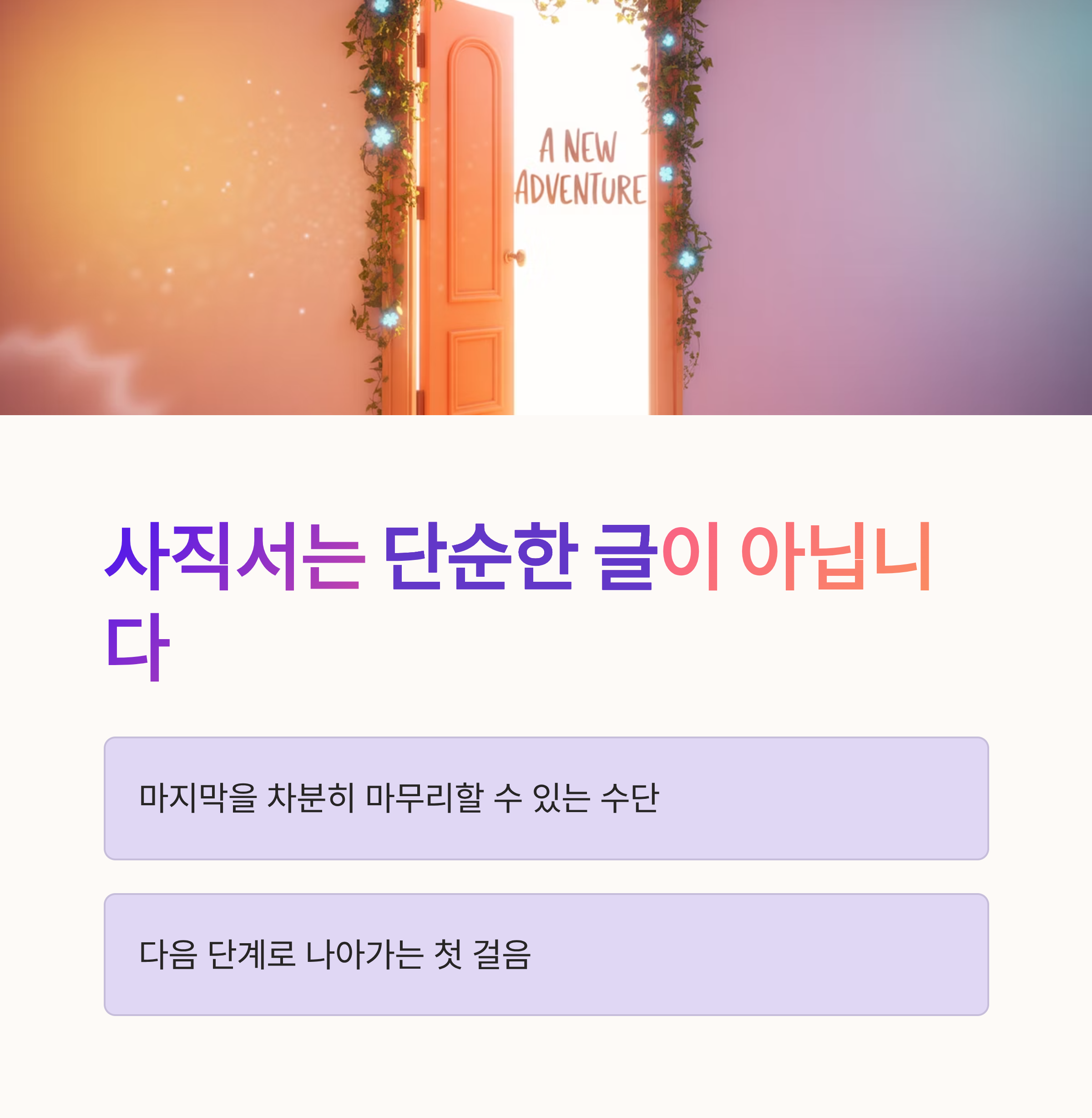 사직서는 단순한 글이 아닌, 마지막을 차분히 마무리할 수 있는 수단이죠. 필요성, 다운로드 방법, 작성 팁까지 쭉 보셨죠? 이제 본격적으로 퇴사를 준비해보세요. 근데 참! 준비하는 과정이 번거로웠다면 오늘 알려드린 방법으로 사직서 준비는 끝났습니다요~~ 😊 글 보면서 퇴사 준비하는 분들! 힘내세요! 다음 단계에서도 여러분이 빛나길 바랍니다! 🥇