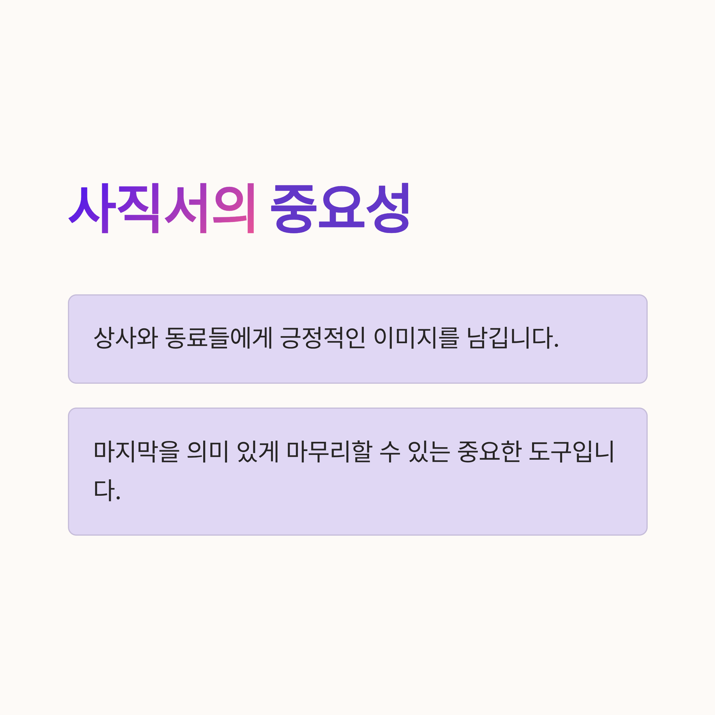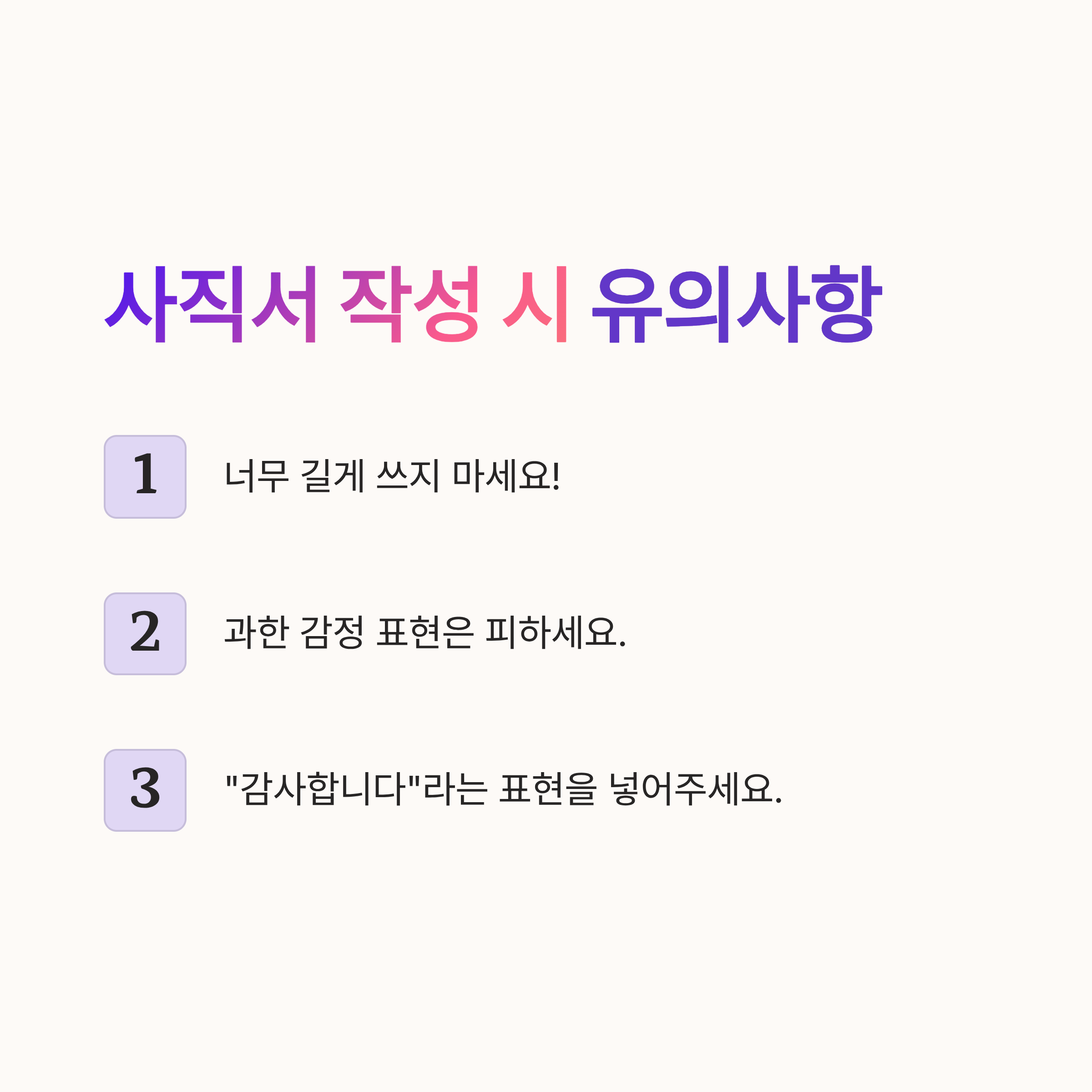아, 사직서 작성할 때 주의해야 할 점이 몇 가지 더 있어요. 첫째, 너무 길게 쓰지 마세요! 상대방, 그러니까 HR 담당자나 상사는 그리 많지 않은 시간에 그래도 깔끔하게 읽을 수 있게 적당히 써야 좋아요. 두 번째 팁! 내용을 작성할 땐 감정을 담아도 되지만, 과해서는 안 된다구요. 회사에 대한 비판보다는 당신의 앞으로의 계획에 대해 짧고 간단하게 적어주세요. 마지막으로, 강하게 사랑고백? 같은 말투보다는 “감사합니다”라는 표현을 기본적으로 넣어주시면 좋아요. 😉