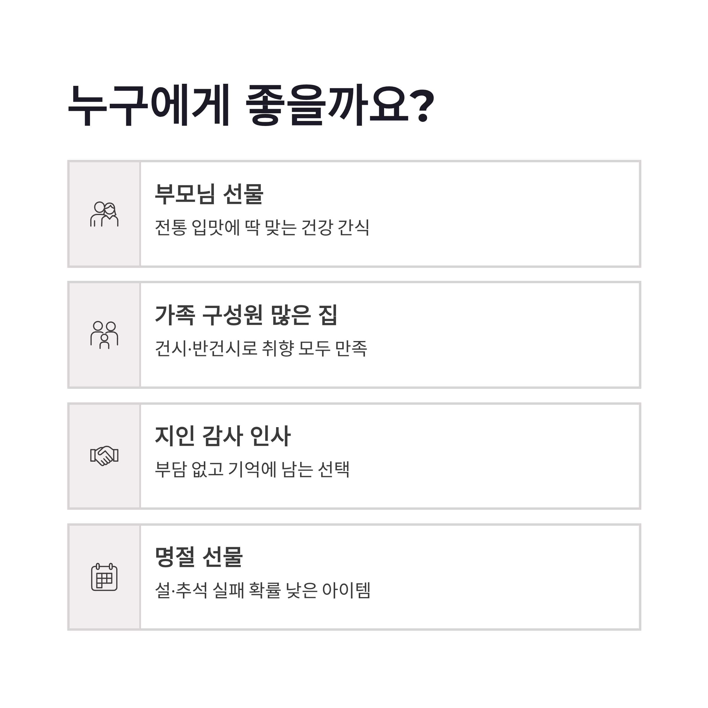 | 선호층 | 어르신, 전통 입맛 | 아이, 간식용 |